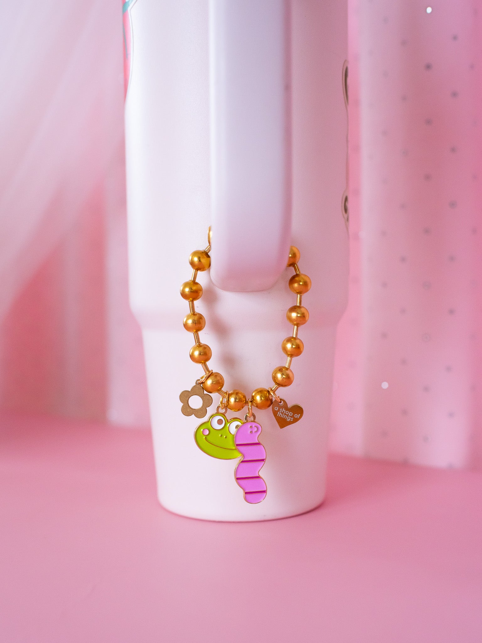This cup charm is made from a gold toned oversized ball chain and has a daisy, frog, worm, and heart charm attached.