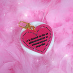 Heart-shaped keychain measures 2" x 2.25" and is made of pink acrylic.