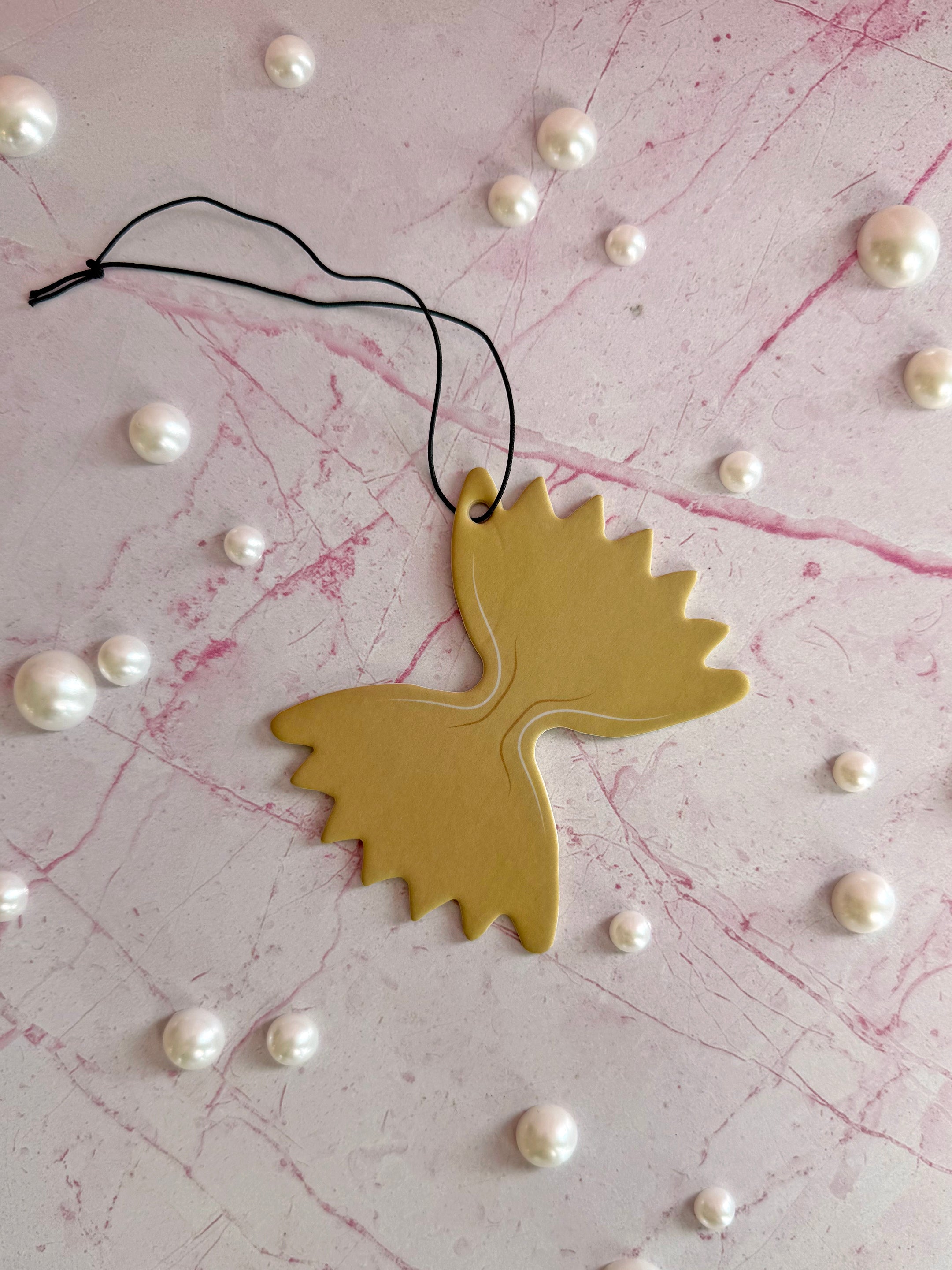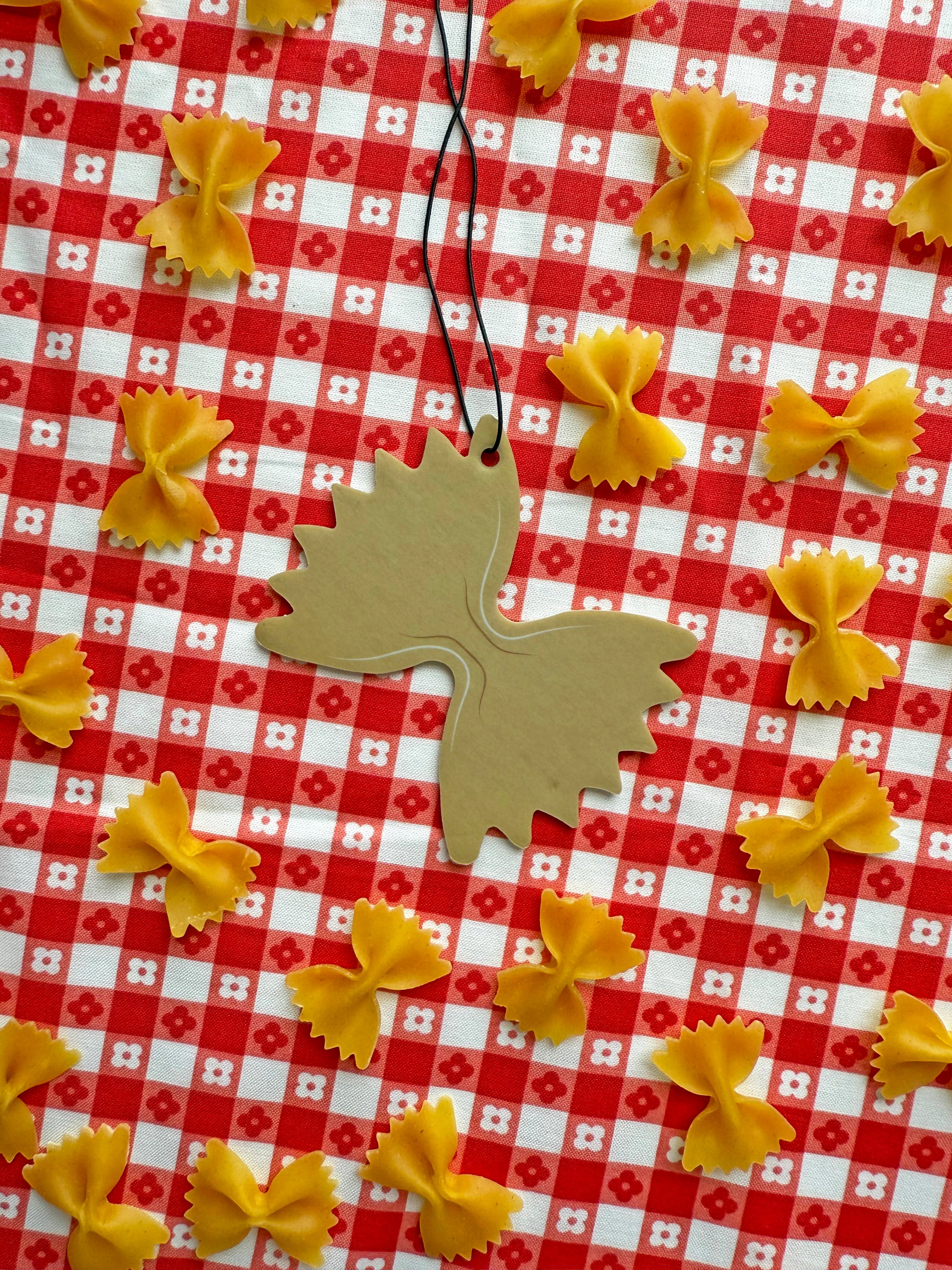 This air freshener features the classic farfalle noodle - we all know bowtie noodles are the superior pasta! Vanilla scented and comes with an elastic cord to loop around a rearview mirror.