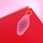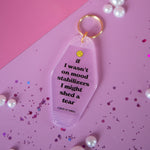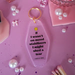 This translucent pink keychain says "if I wasn't on mood stabilizers I might shed a tear"