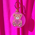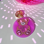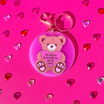 This keychain is made of pink acrylic and features a teddy with a sweet message.