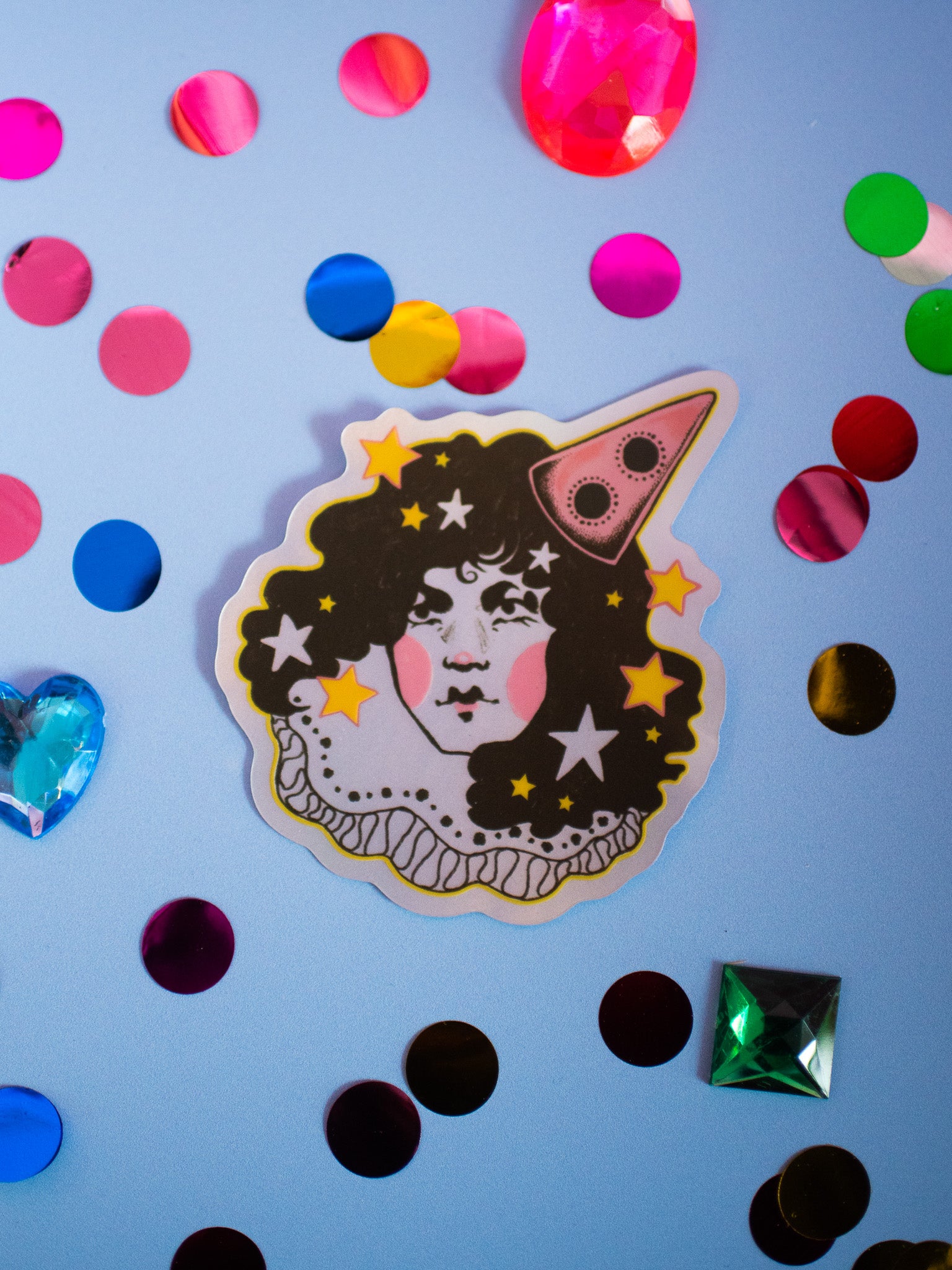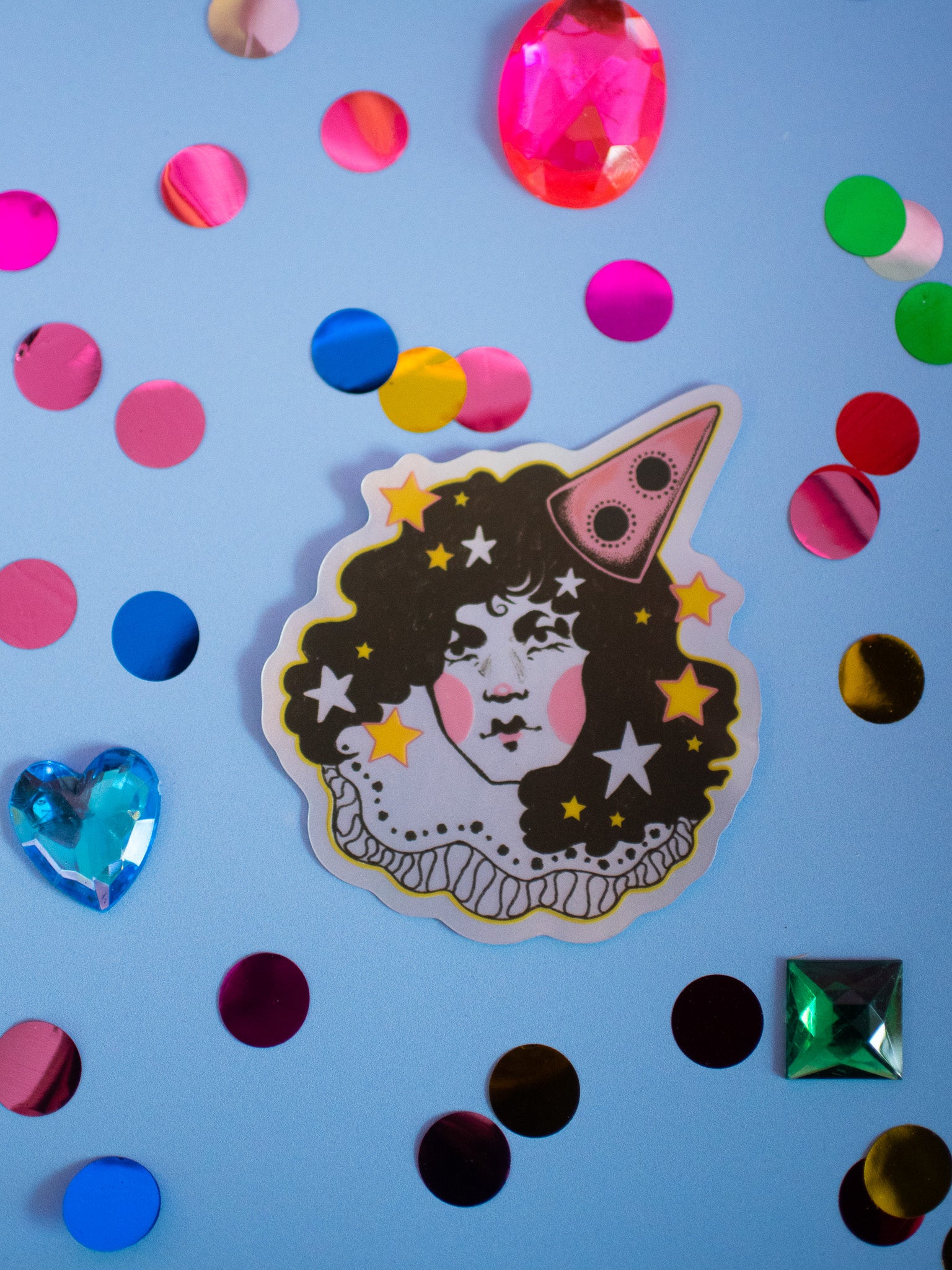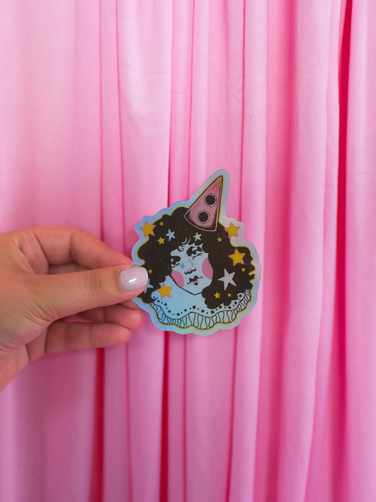 This sticker features a fabulous illustration of a glam rock inspired clown on a holographic background! Perfect for whatever you wanna stick it on- water bottles, tumblers, laptops, lockets, diaries, cars, helmets, bikes, skateboards, etc!
