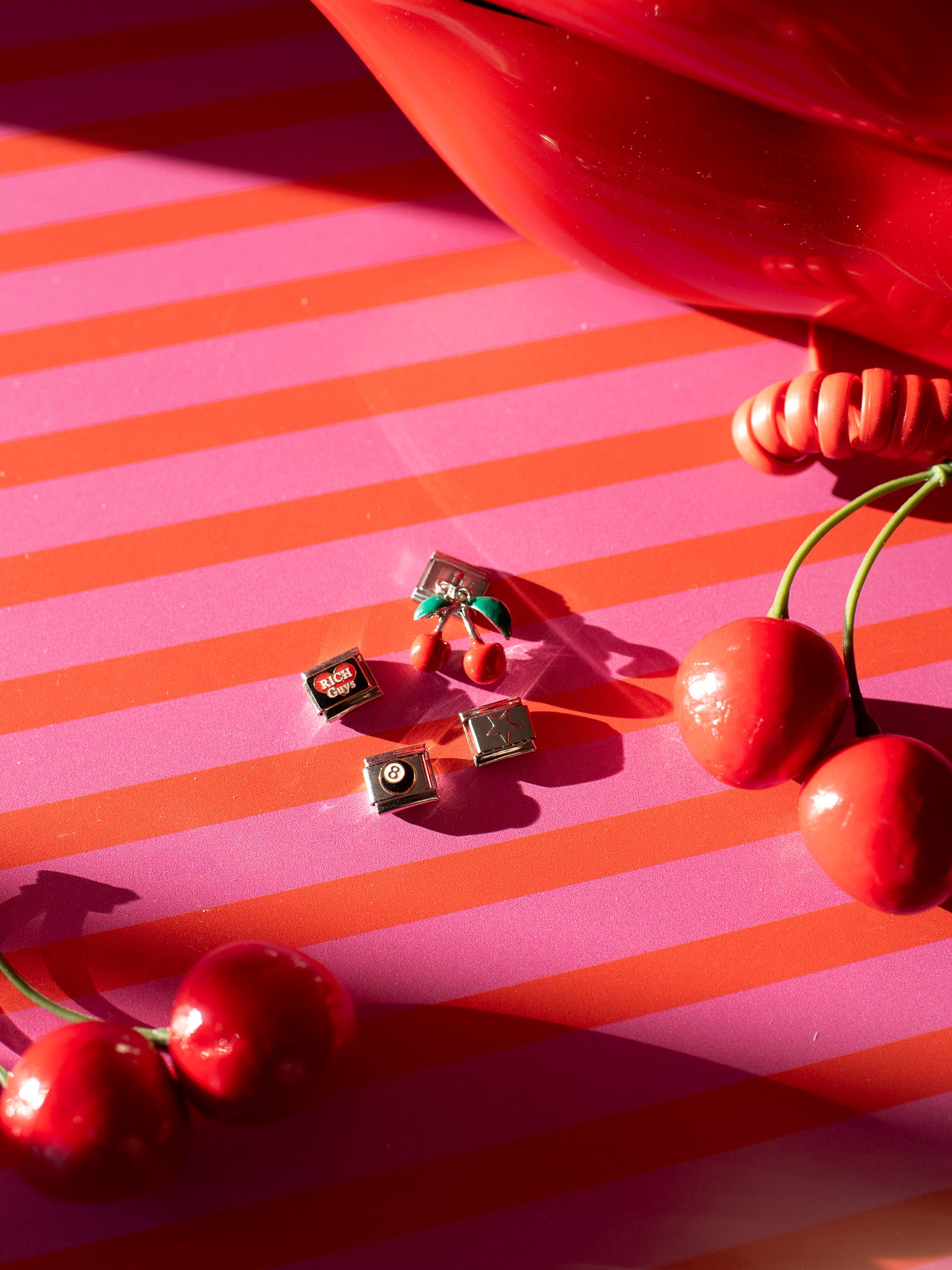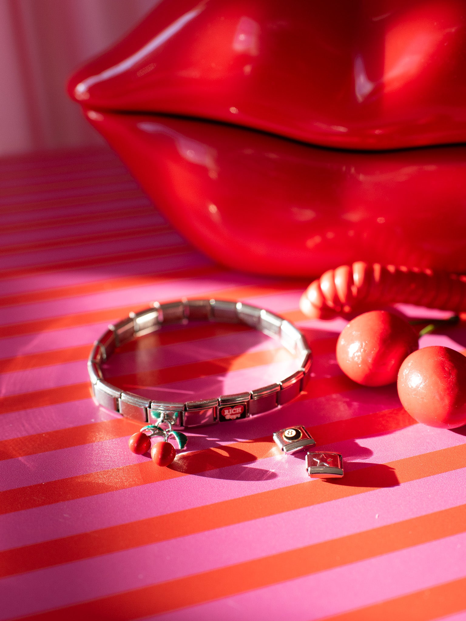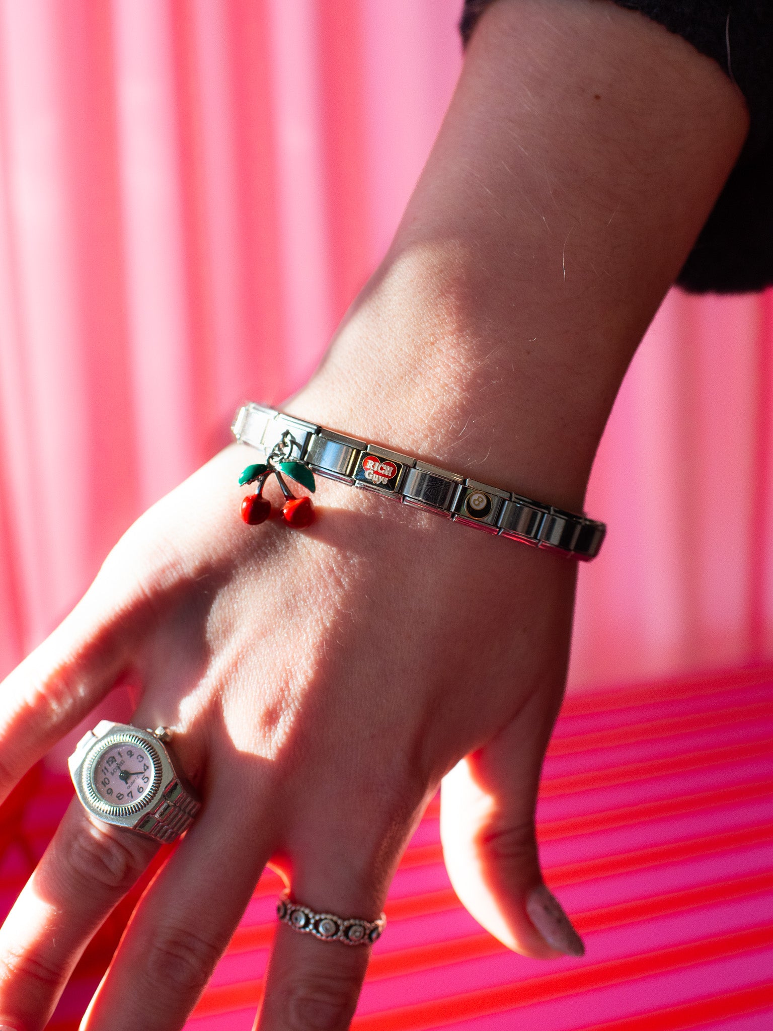 - 4 specialty charm links- star, dangly cherry, 8 ball and I heart rich guys