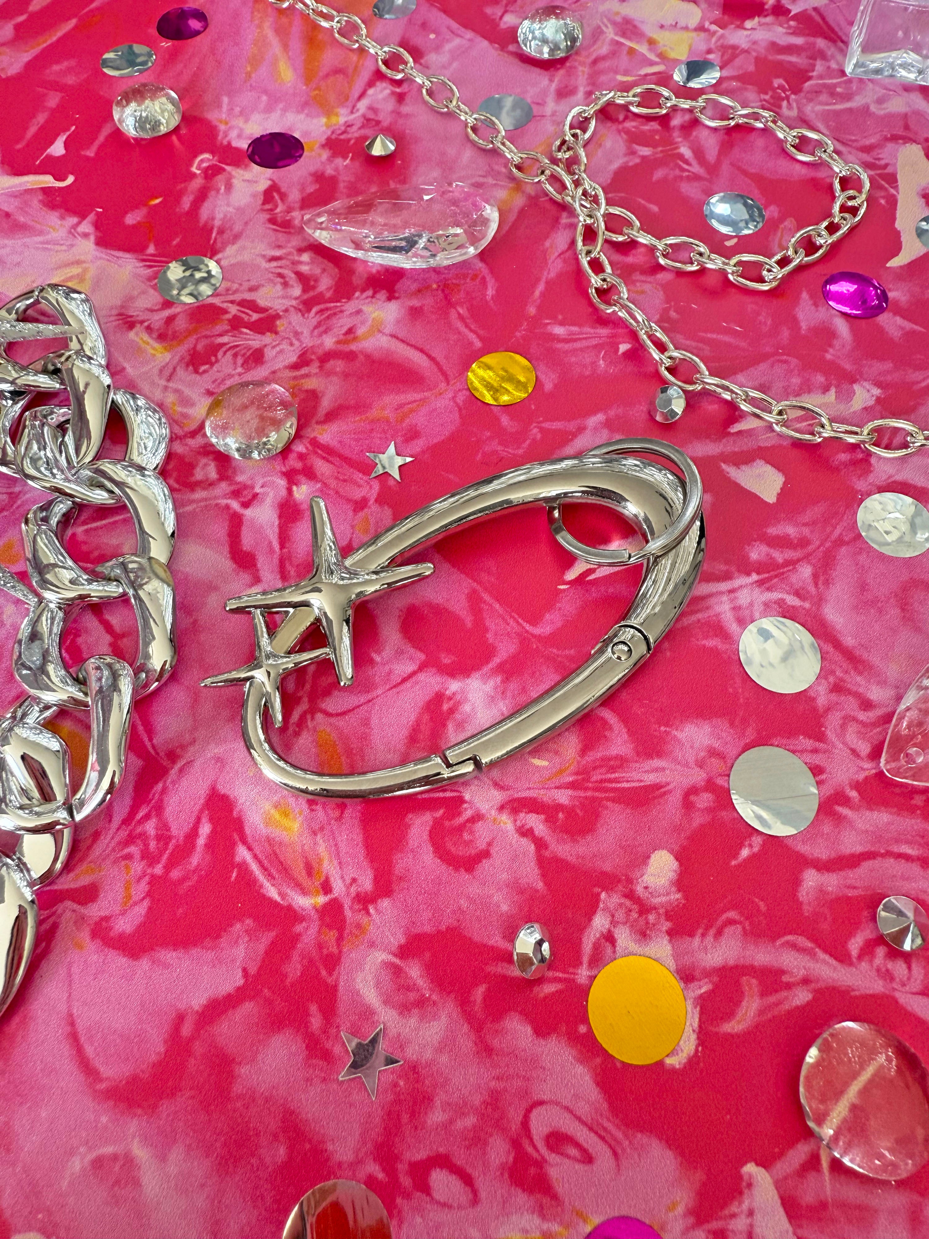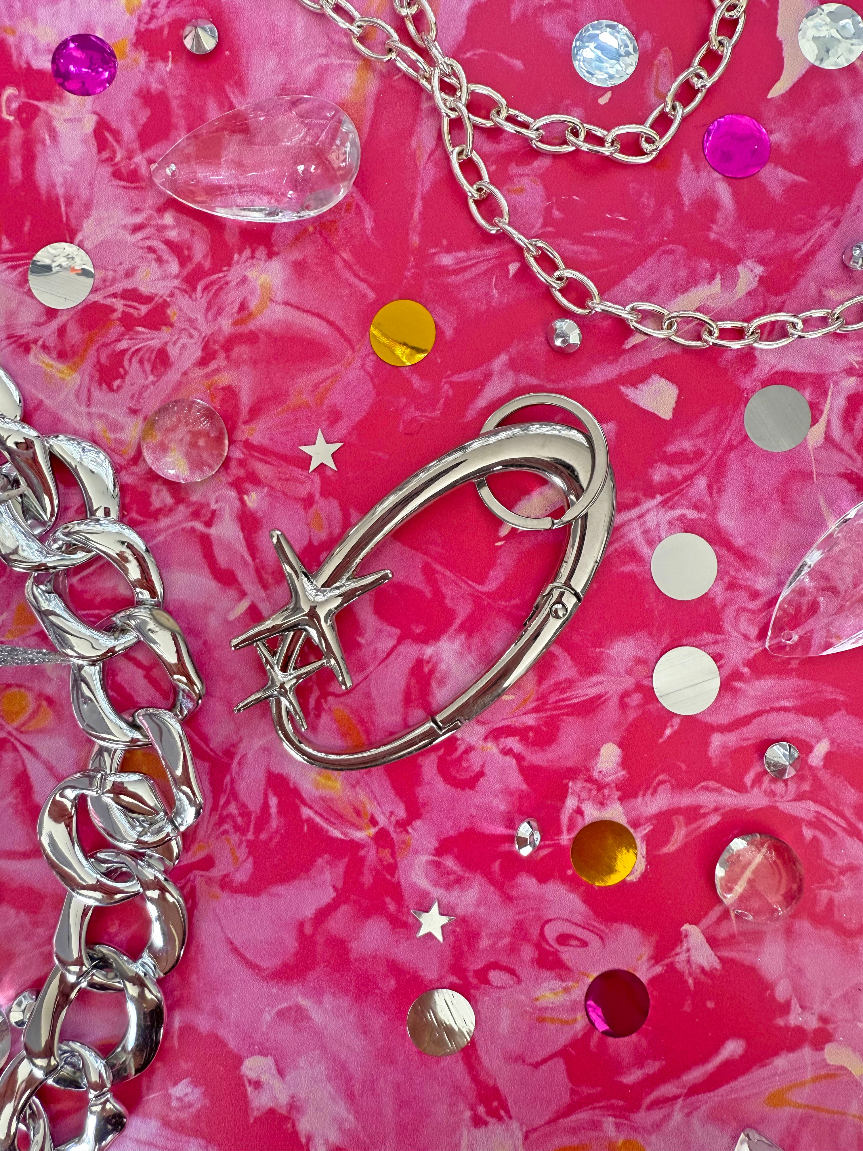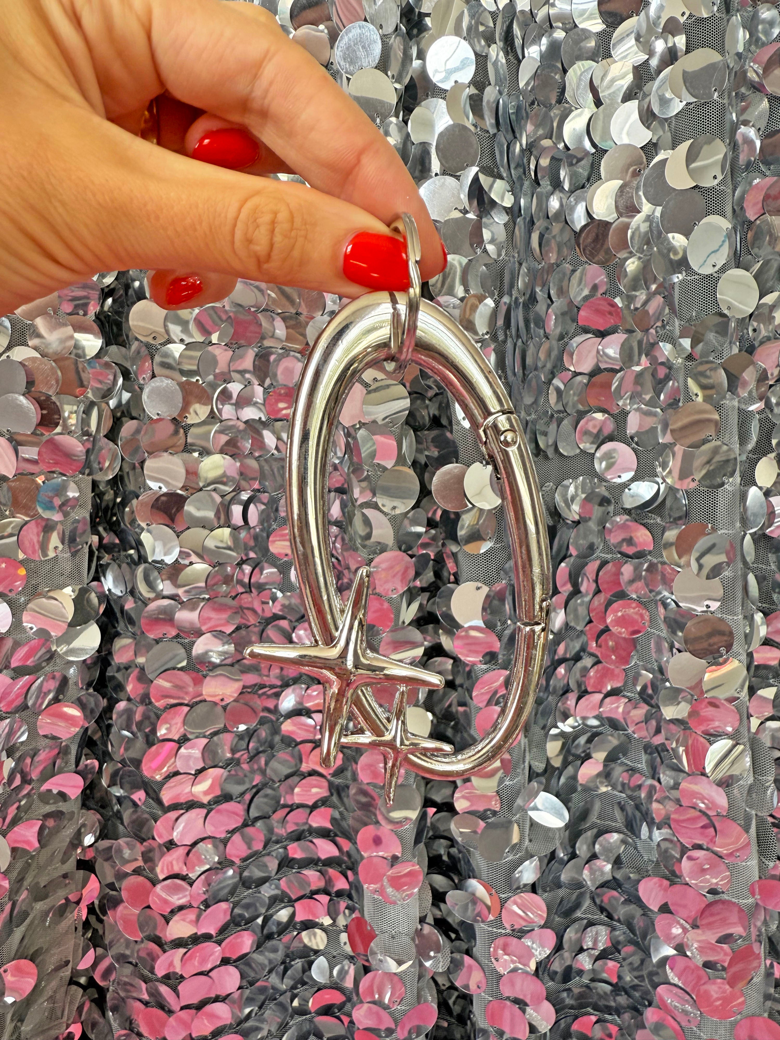 This silver oval-shaped carabiner is adorned with two cute little sparkles - the perfect accessory for your keys, water bottle, bag, etc! Also comes with a keyring attachment.