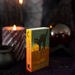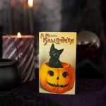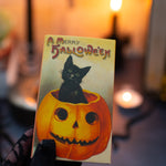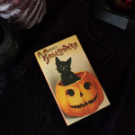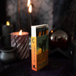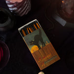 The match box features different art on the front and back! One side features a black cat sneaking on a fence. The other side features a black cat adorably sitting in a pumpkin! Both sides read "A Merry Hallowe'en." On the side of the matchbox is a striker and inside are special black/orange and solid black large match sticks.