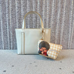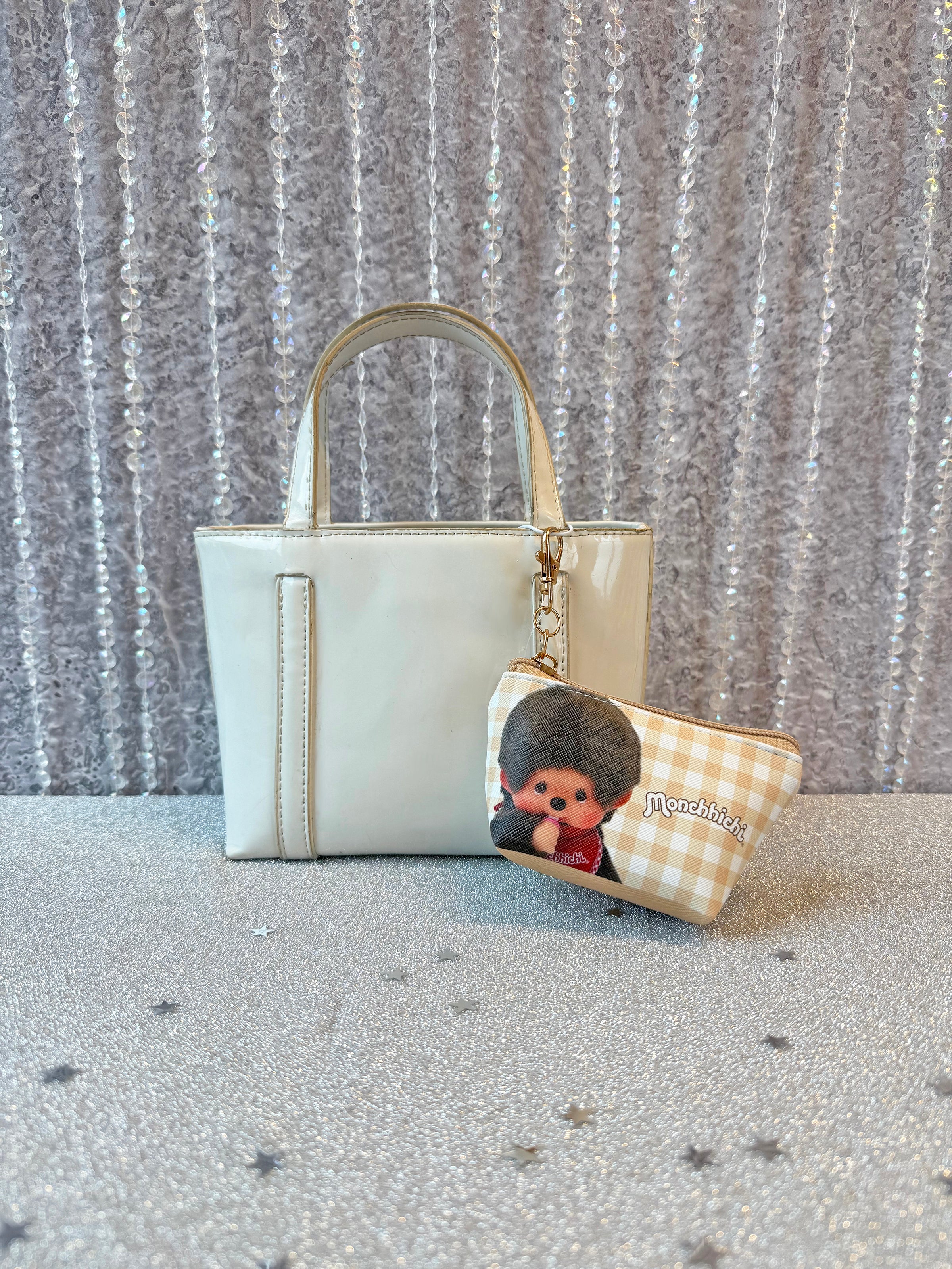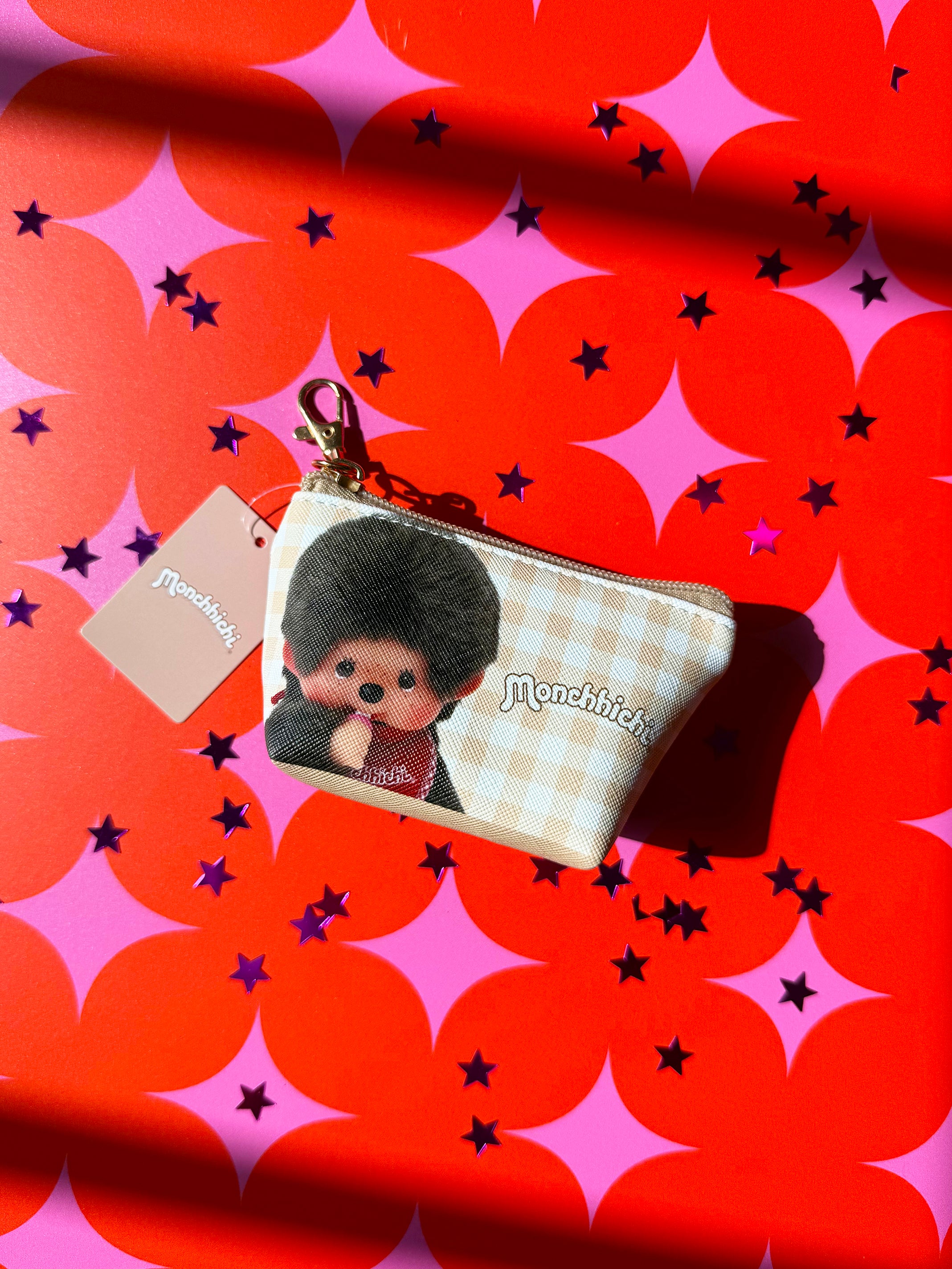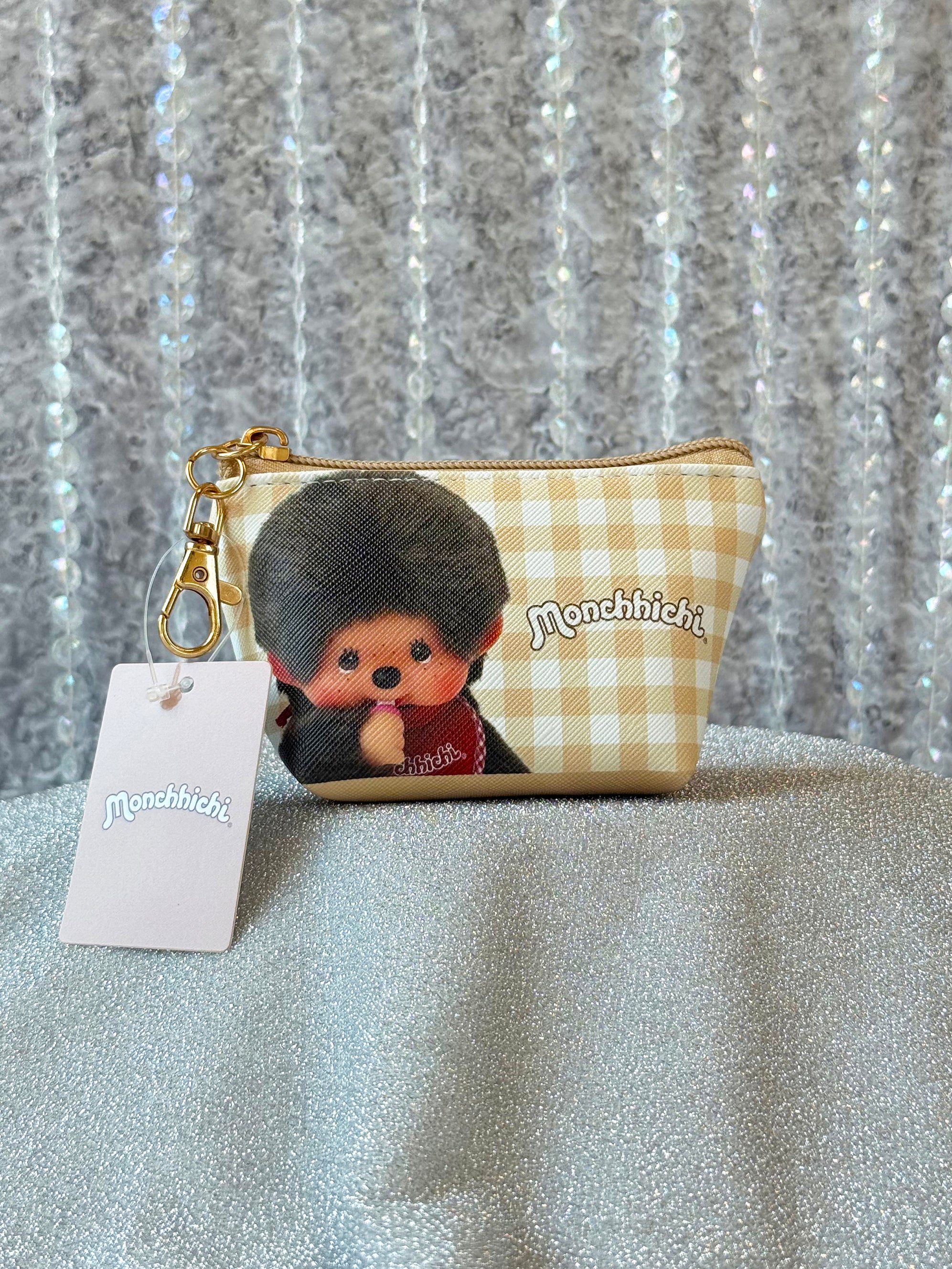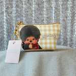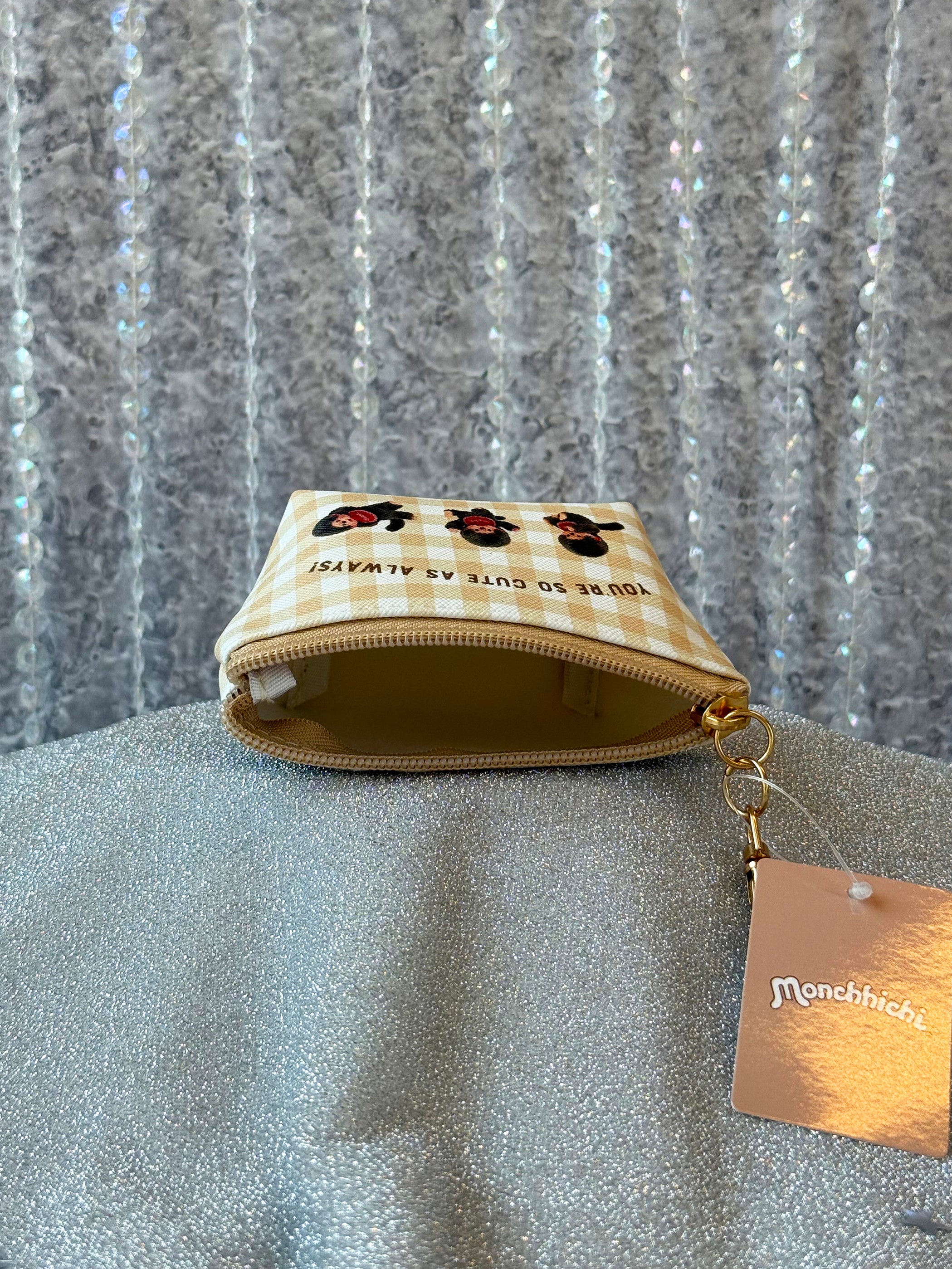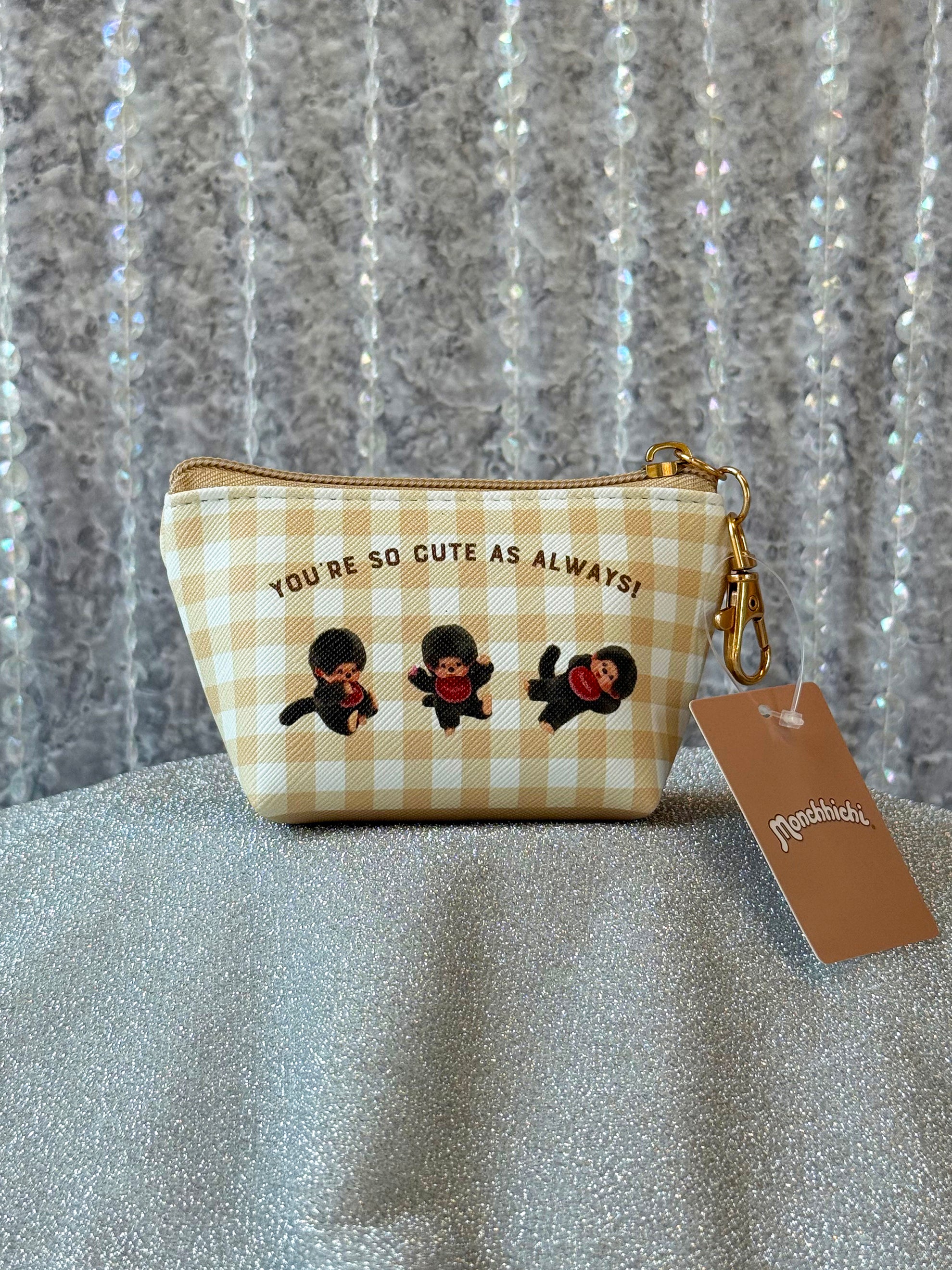 This mini pouch features a white and tan gingham print with adorable Monchhichi all over! One side reads "You're so cute as always!"