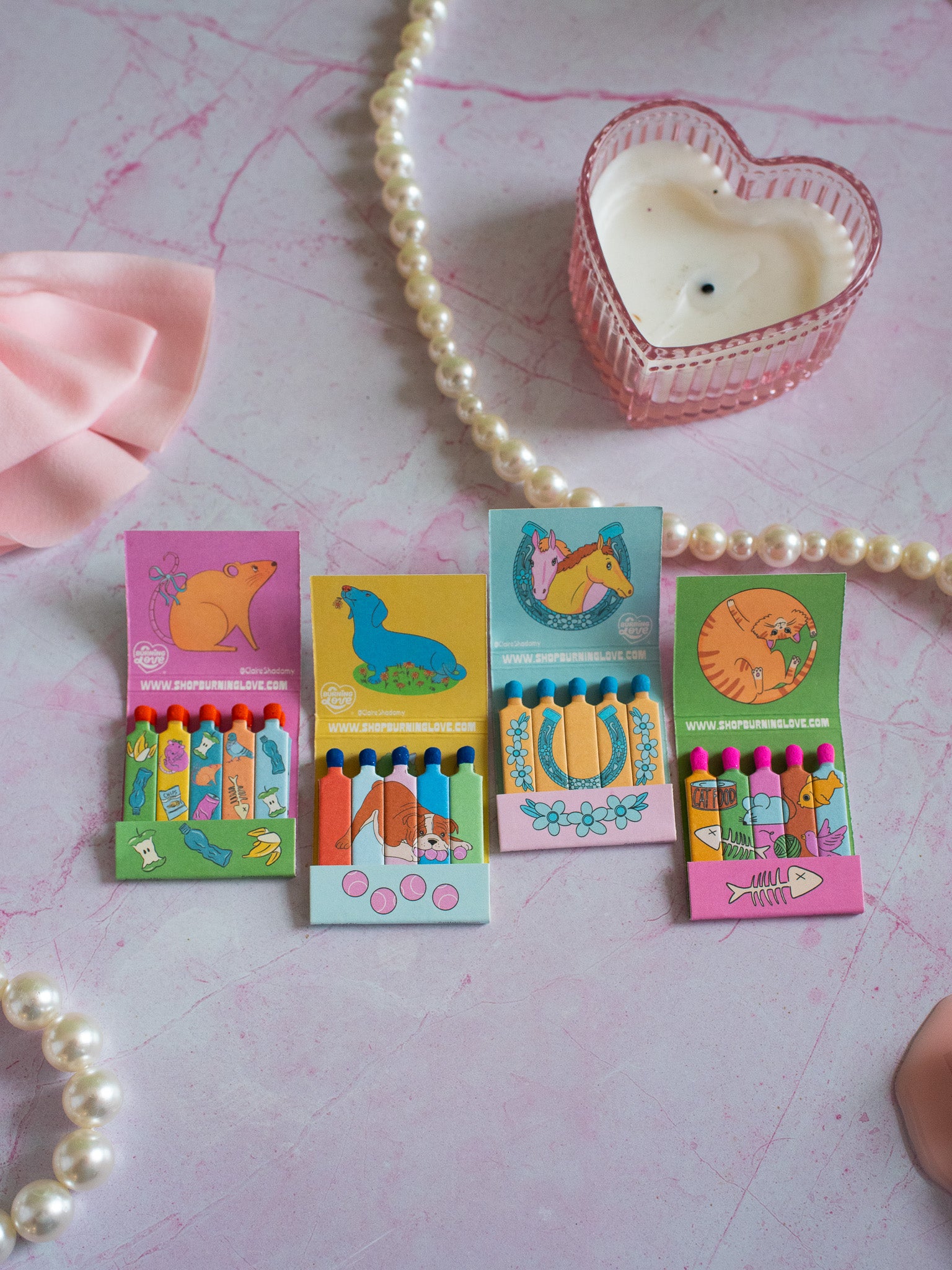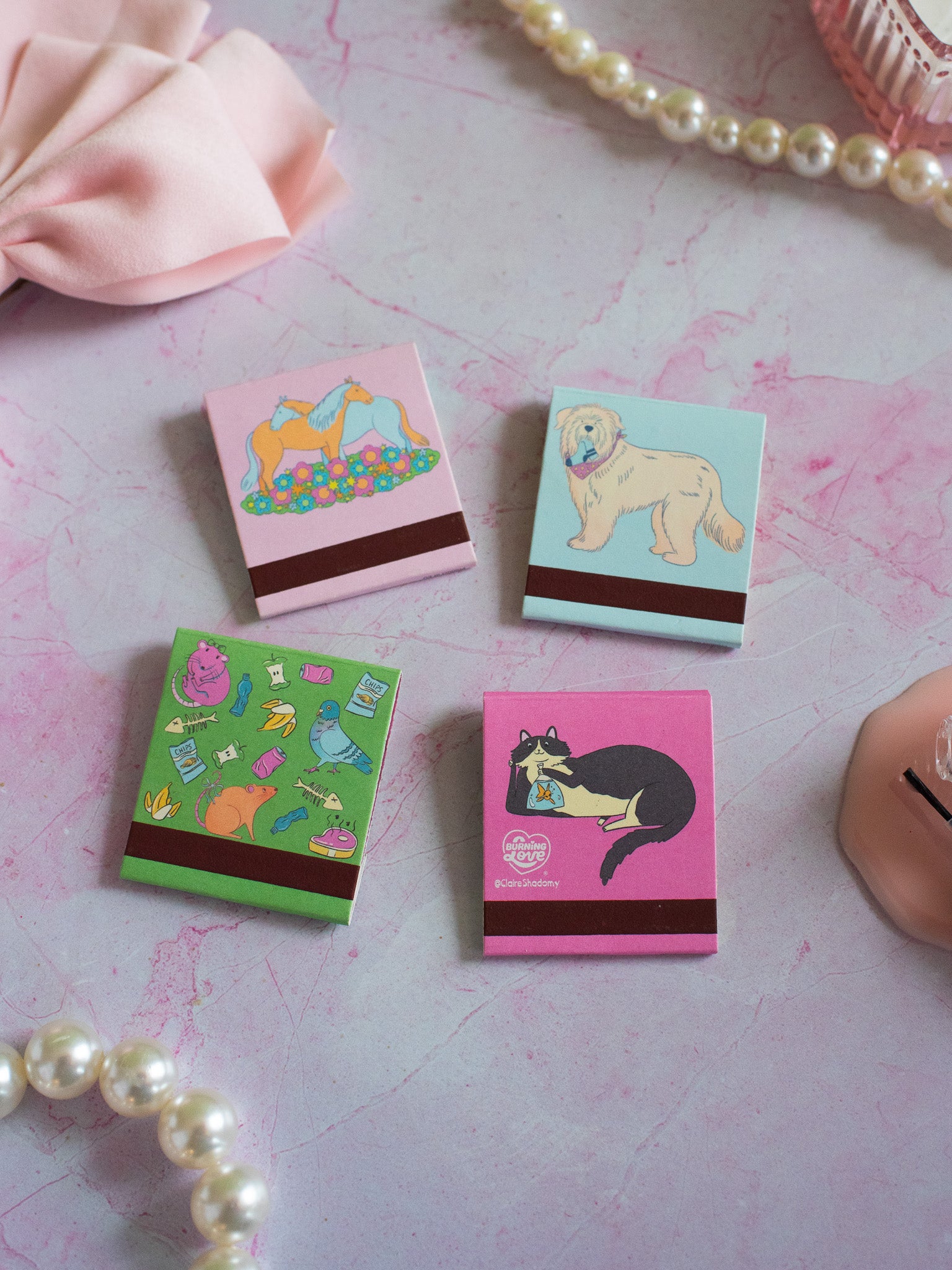 Each matchbook features a pet or a theme - cats, dogs, trash animals and horses! The inside of the matchbook has even more art on the book and the matches!