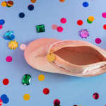 She's pirouetting her way into our hearts! Conveniently hold small items like cash, cards, lip gloss, or whatever else fits! Cute AND functional! With a ribbon loop on the heel, you can easily attach her to your purse, backpack, dance bag, etc.