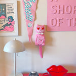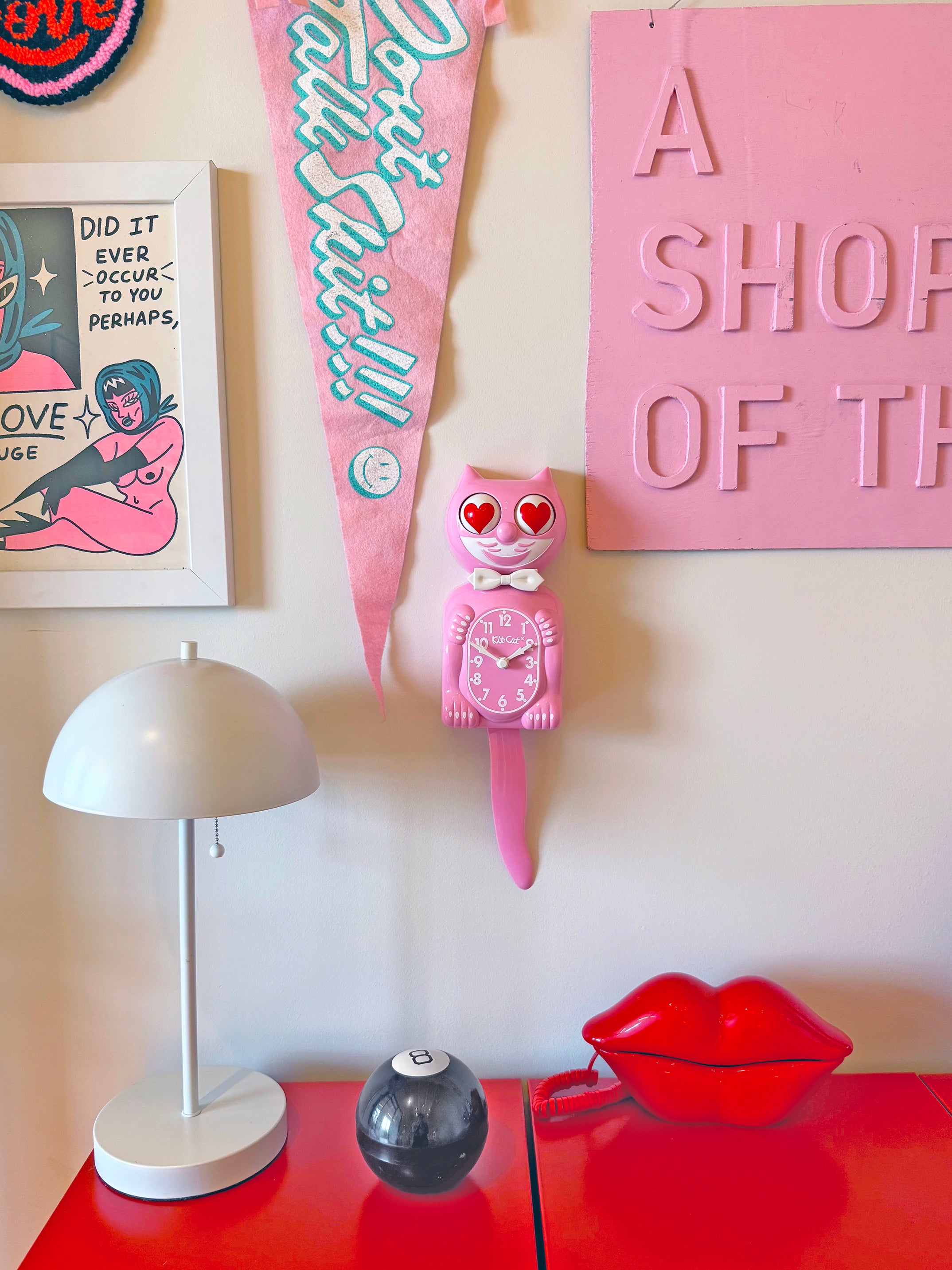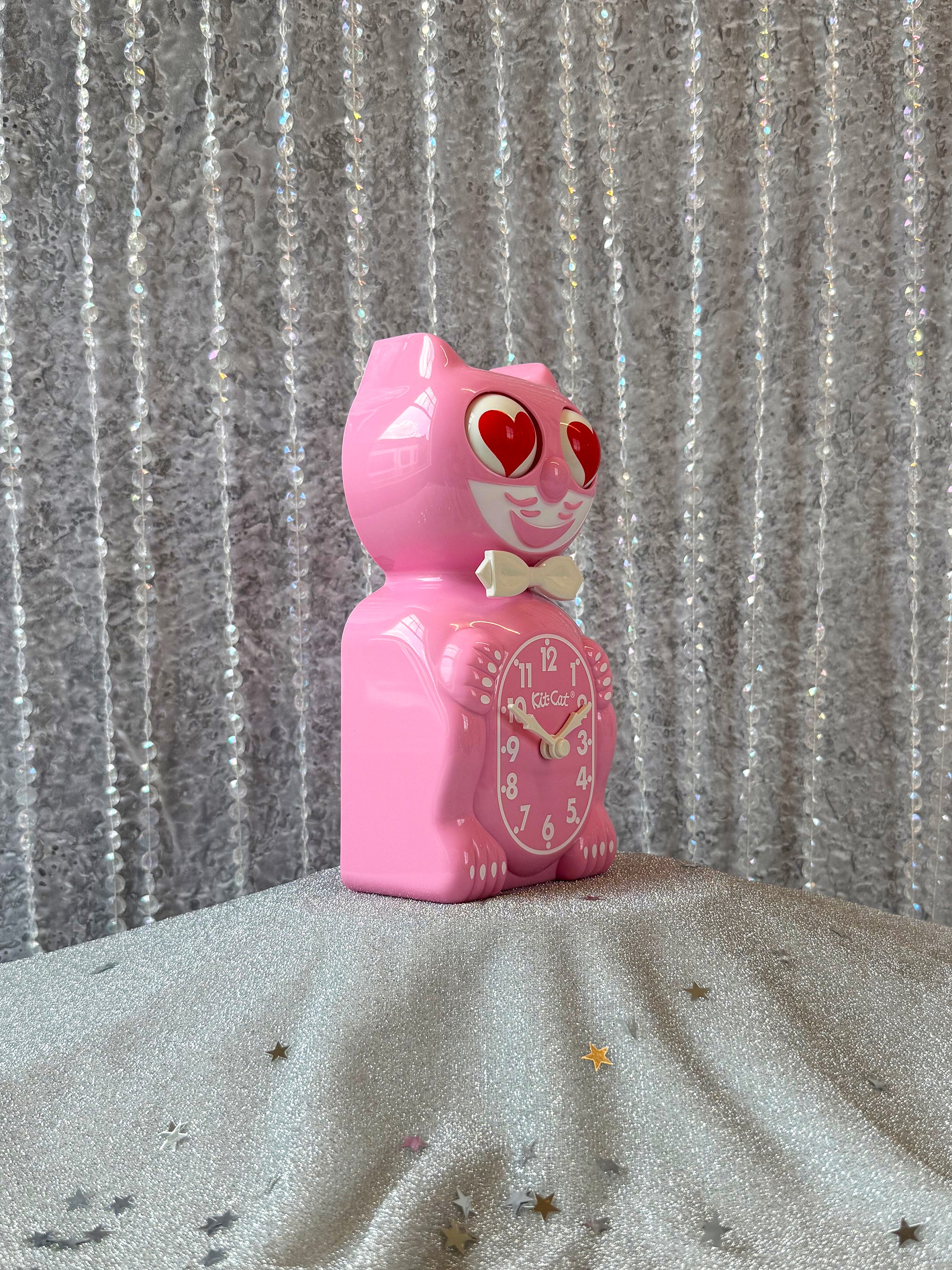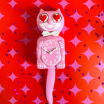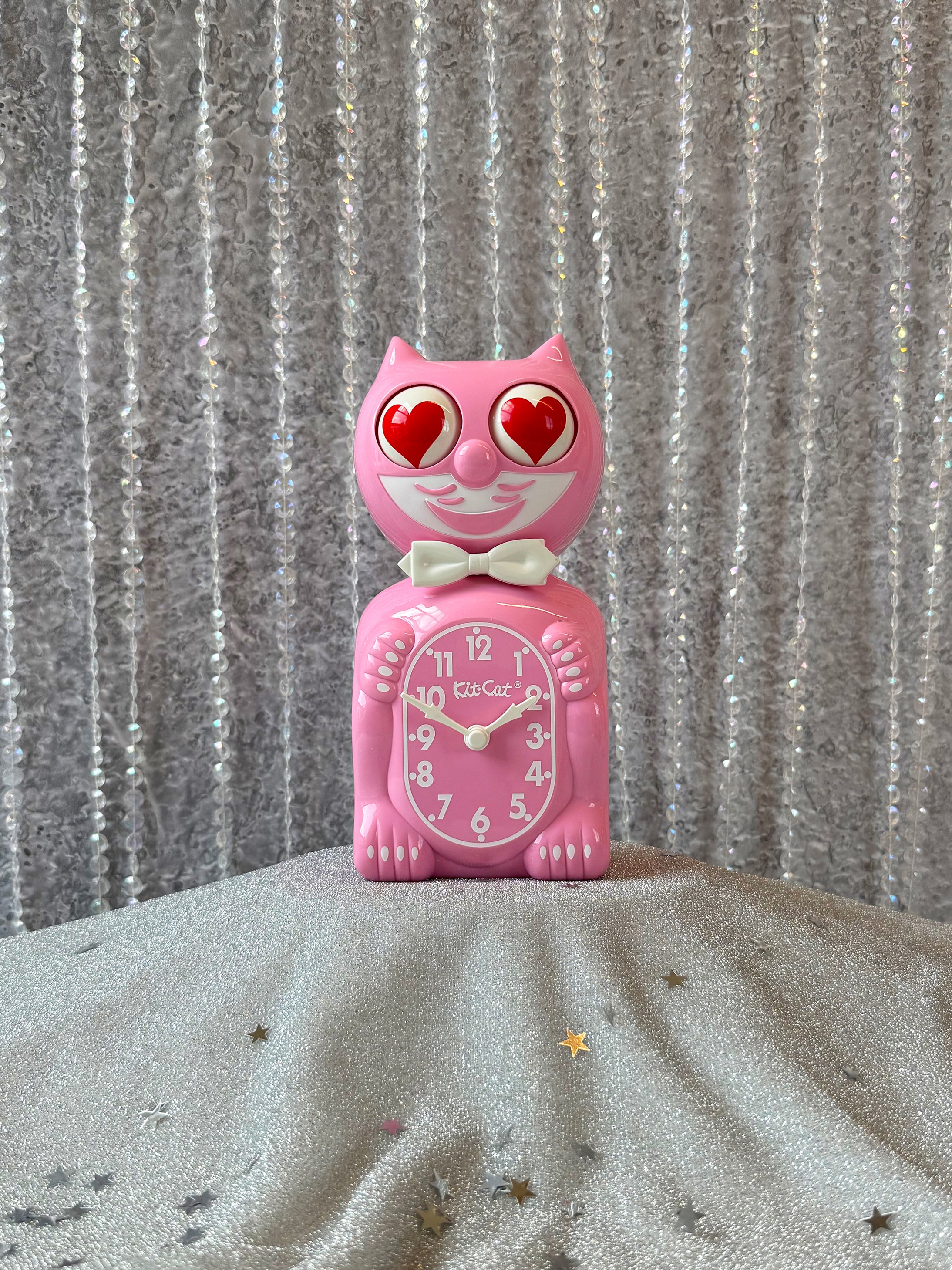 Hold onto your hats and say to hello to this heart eyes limited edition pink satin Kit-Cat Klock!