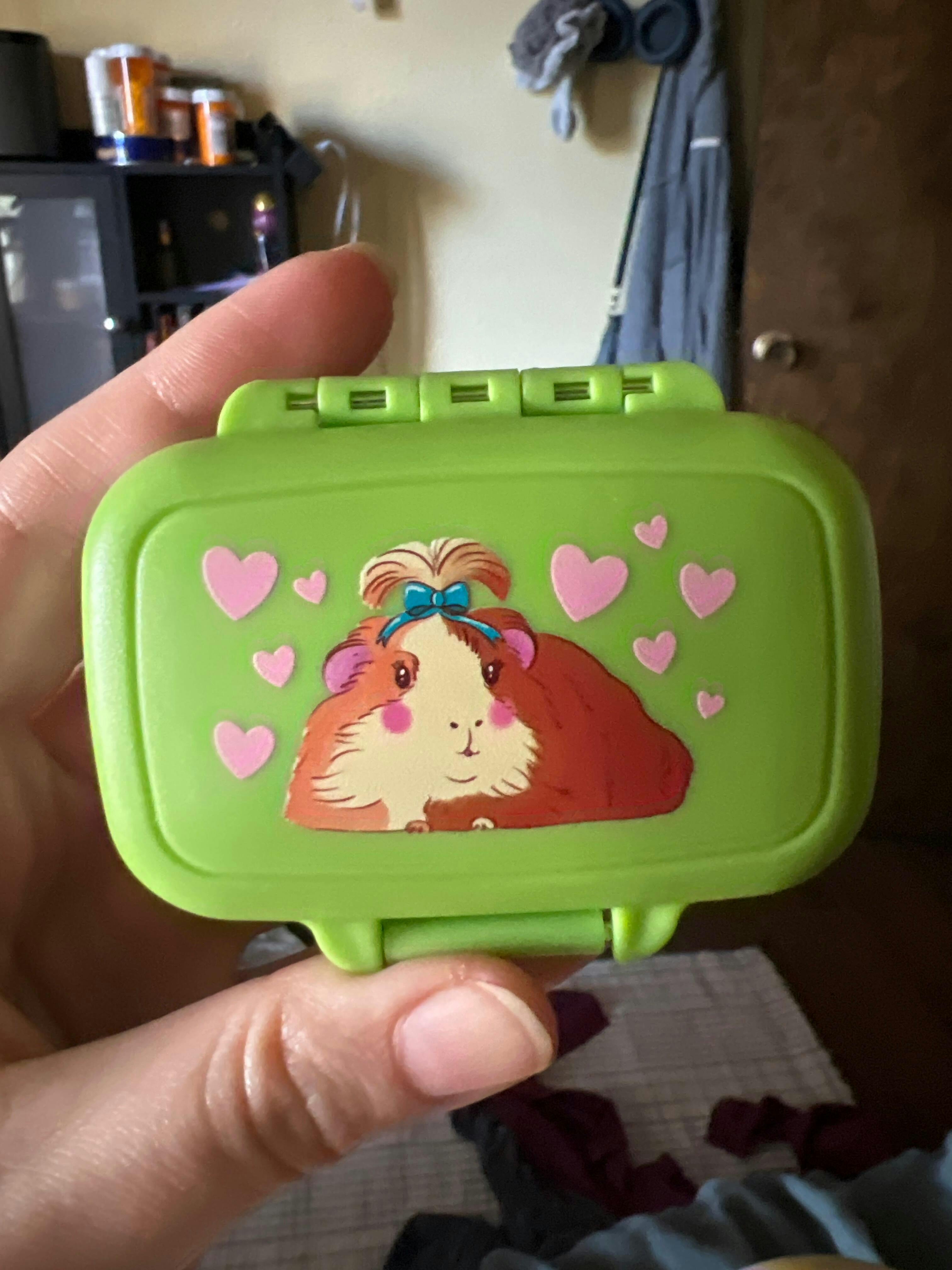 Carry your meds and vitamins in style with this green pill case that has two convenient, removable dividers on the inside that creates 3 separate compartments. Shaped like an adorable mini suitcase with the sweetest illustration of a guinea pig wearing a blue bow surrounded by hearts - AH so cute!! Water proof + smell proof!