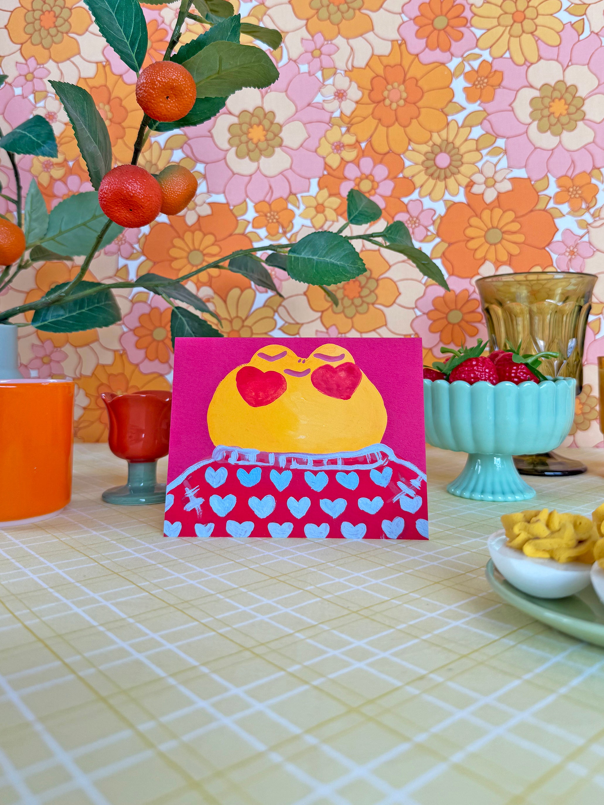 This card features a cute yellow frog in a red and blue heart sweater, serenely thinking about his sweetheart! How cute!