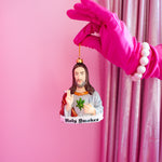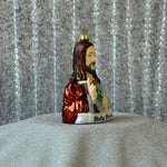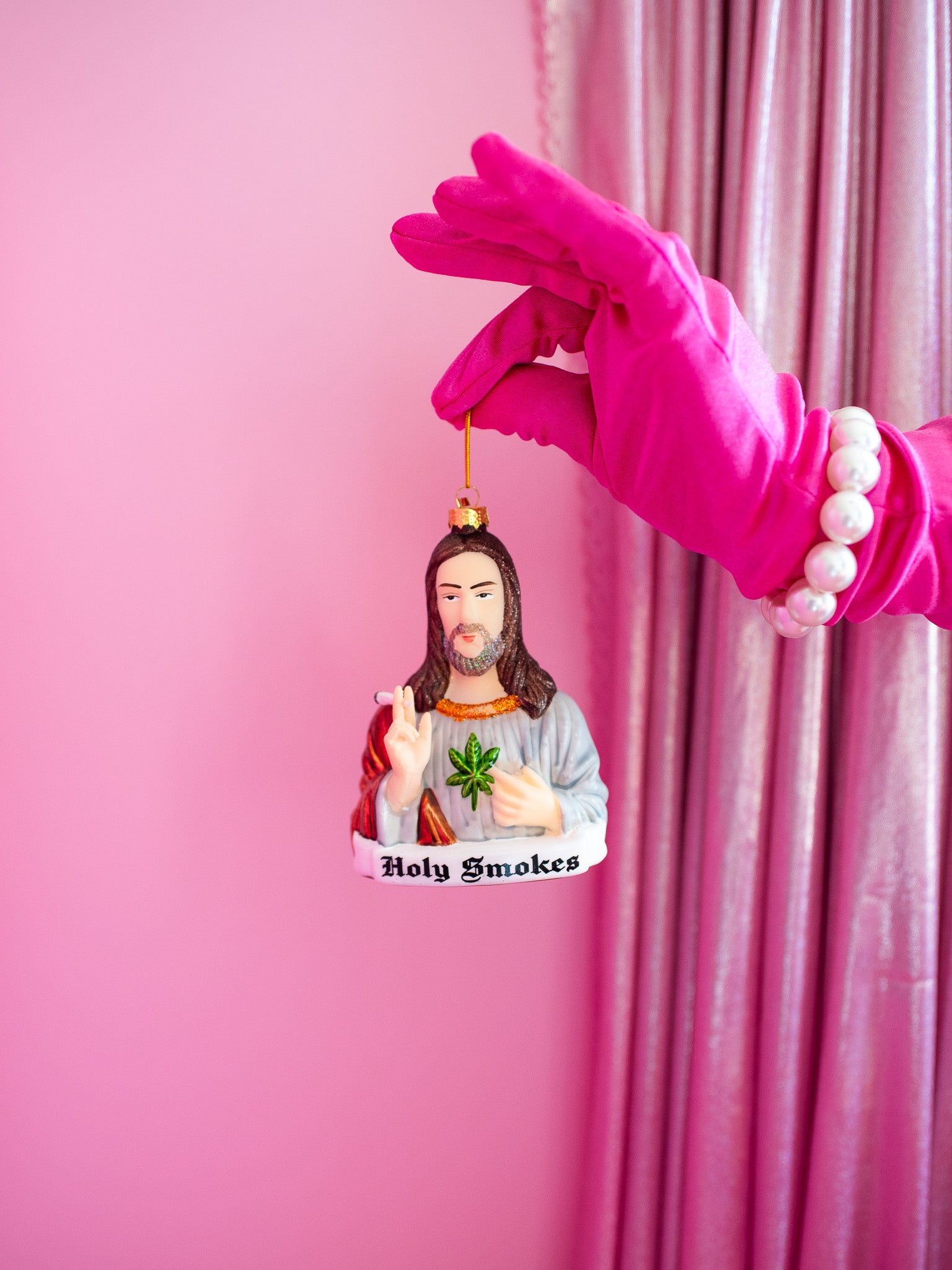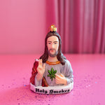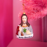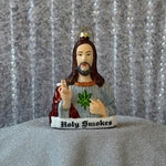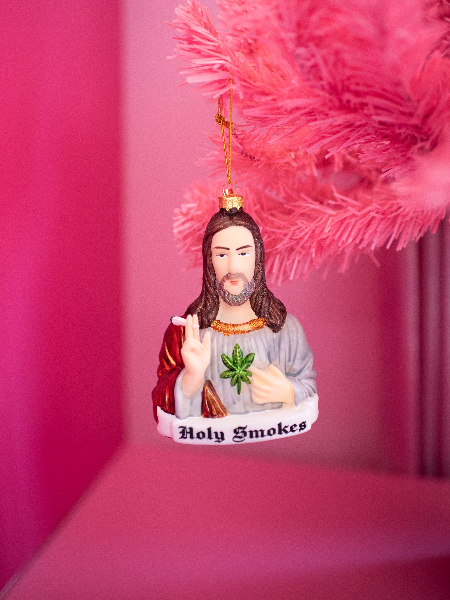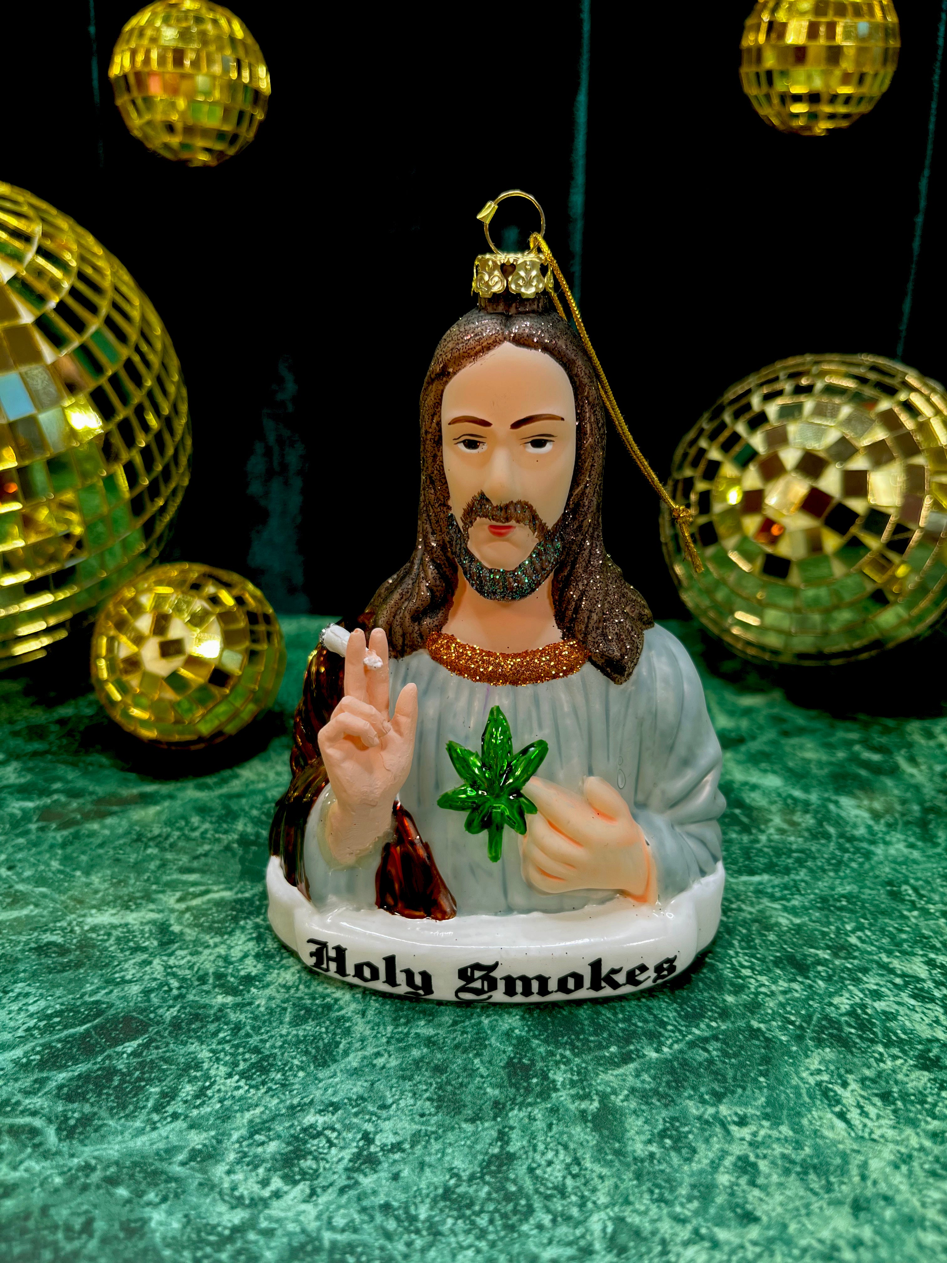 This ornament is made of glass and is shaped like Jesus. He's holding a joint. Instead of a sacred heart, there's a mary jane leaf. The perf gift for your stoner friend <3