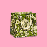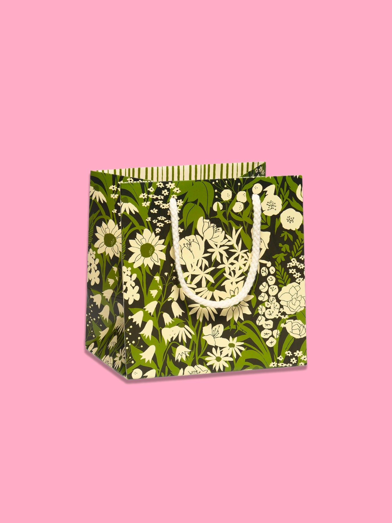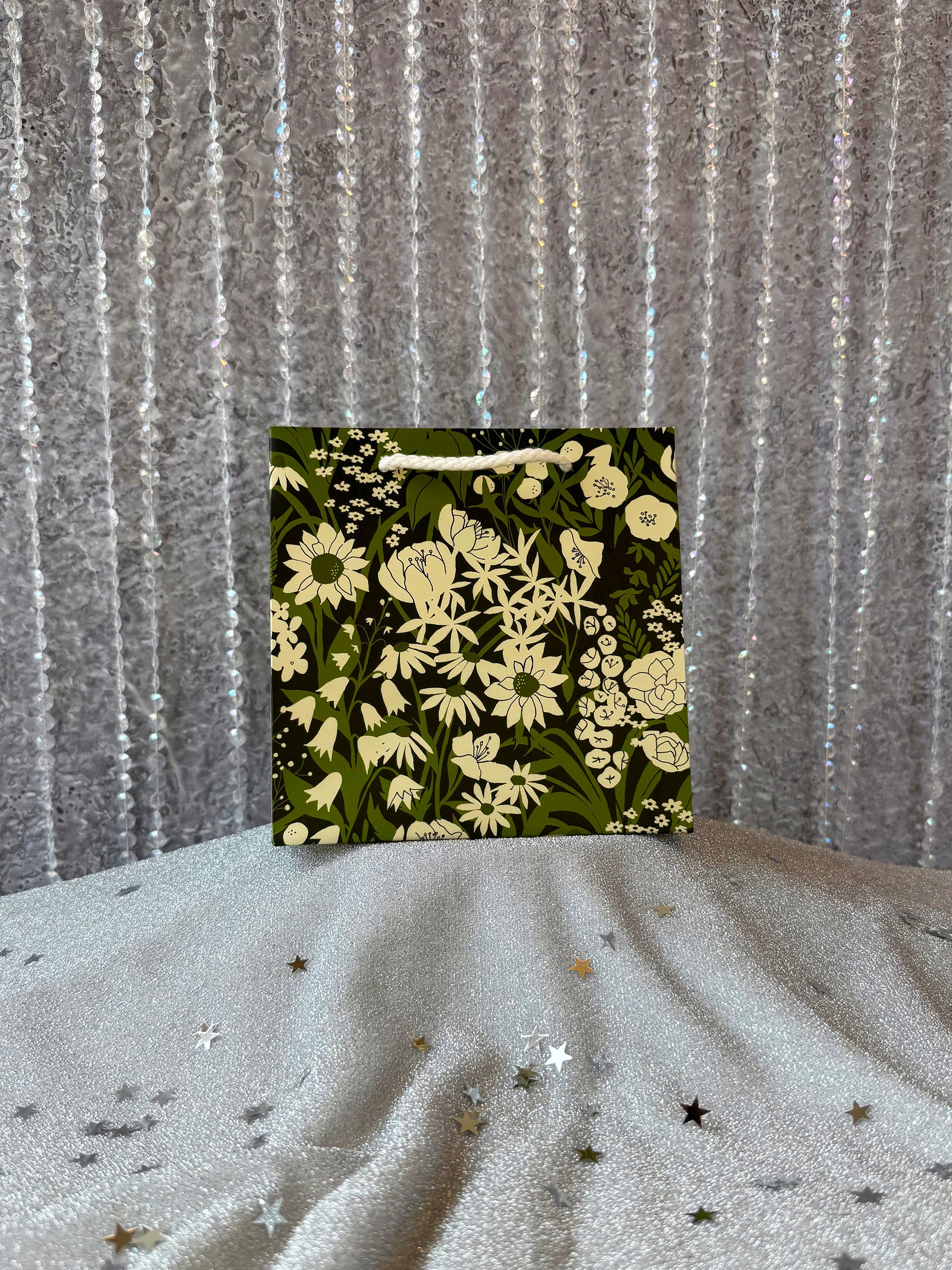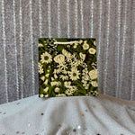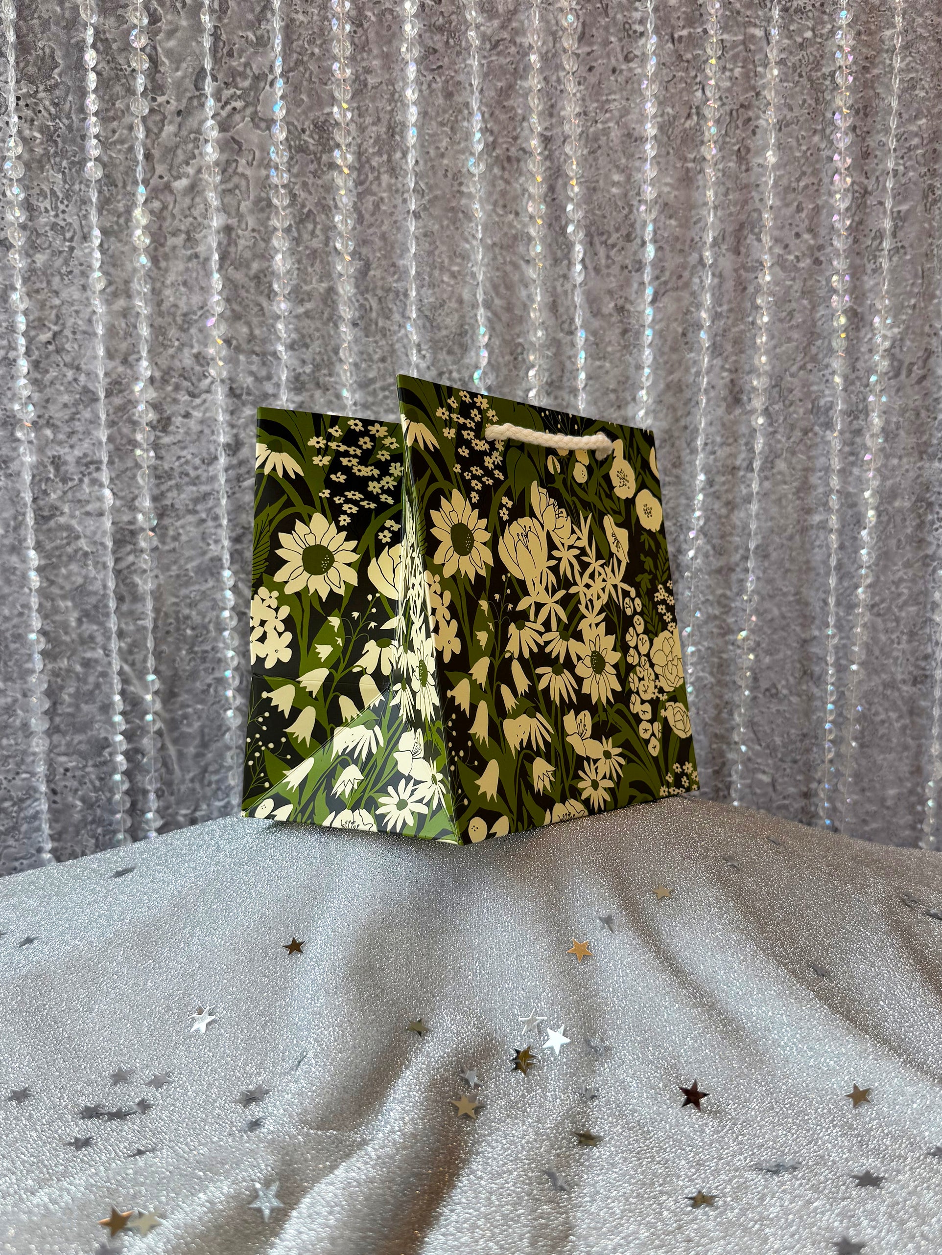 The perfect gift bag for your next party! Features a beautiful green and white wildflower print on a black background! Complete with matching white cotton rope handles for convenient carrying!