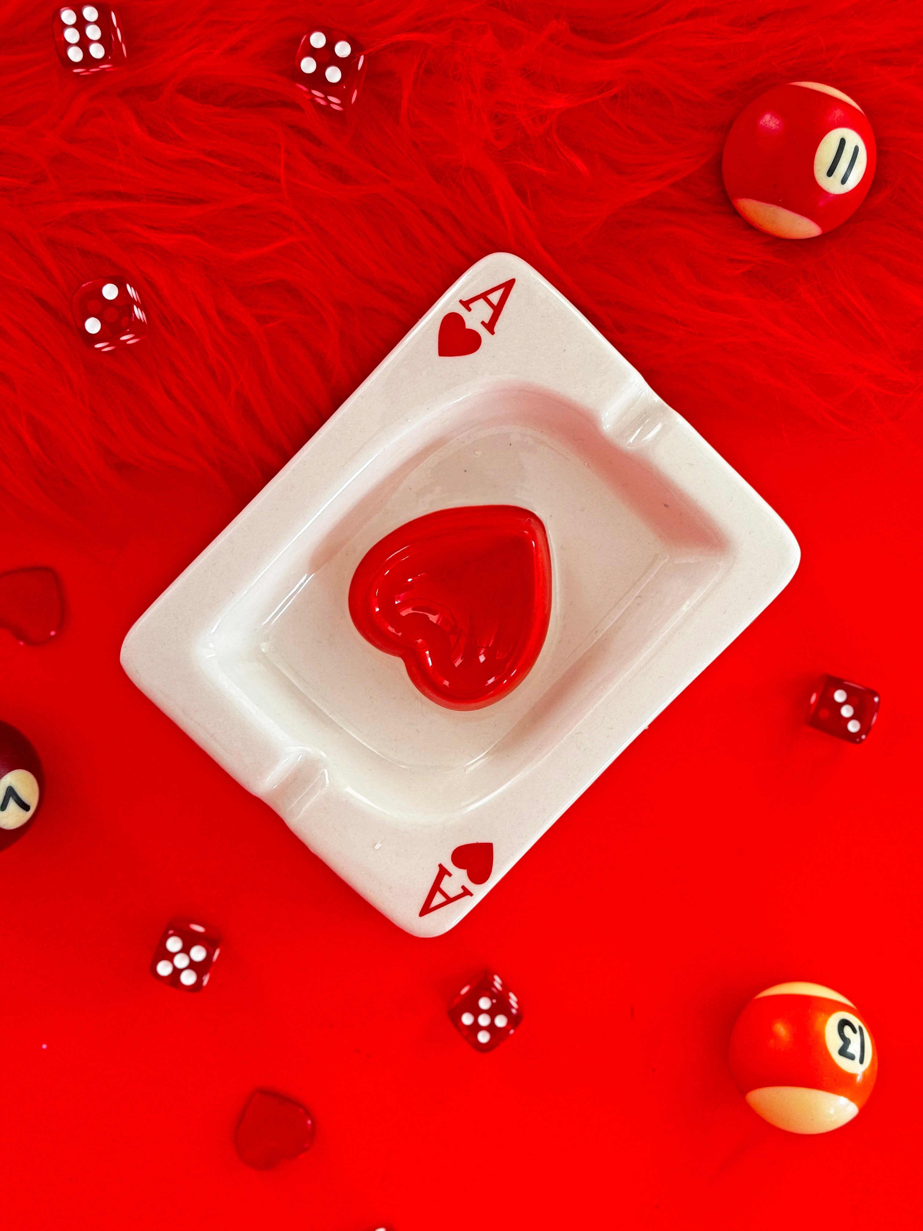 This ash tray brings some perfect vintage vibes. Made entirely of substantial ceramic, this ash tray is decorated with an ace of hearts design and features sculptural elements like the heart in the center and dents to rest your cig.