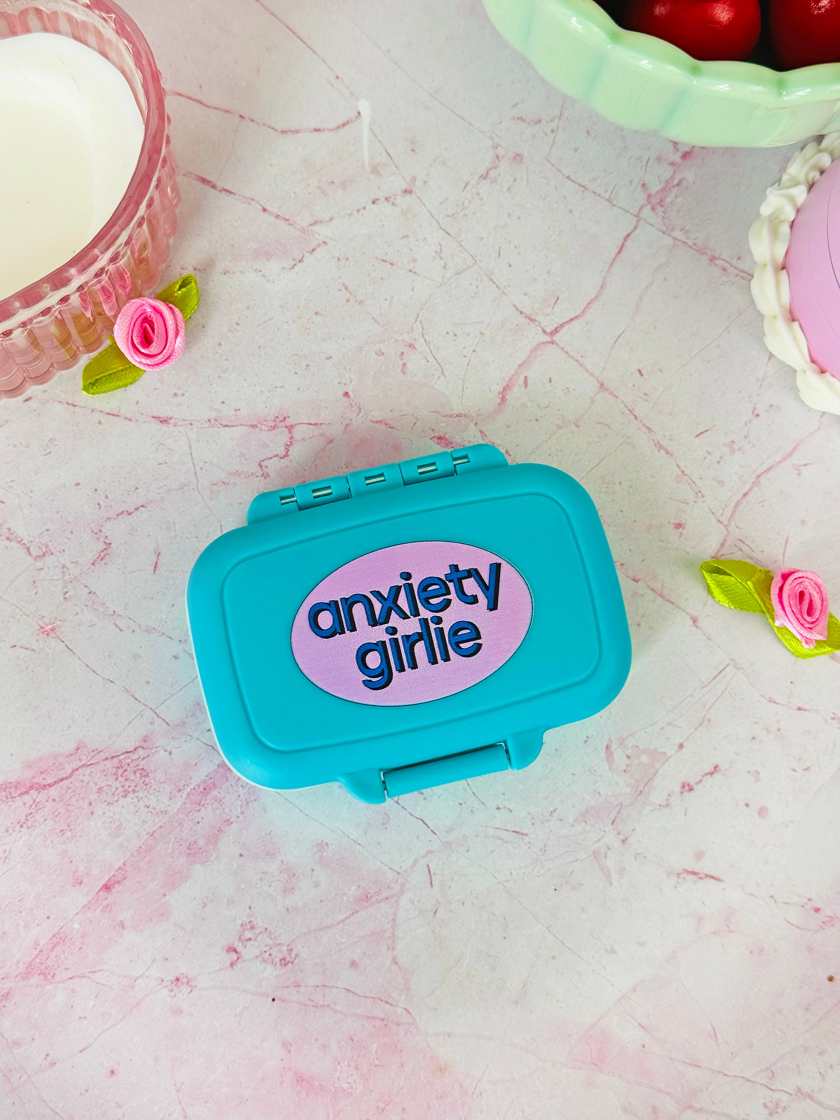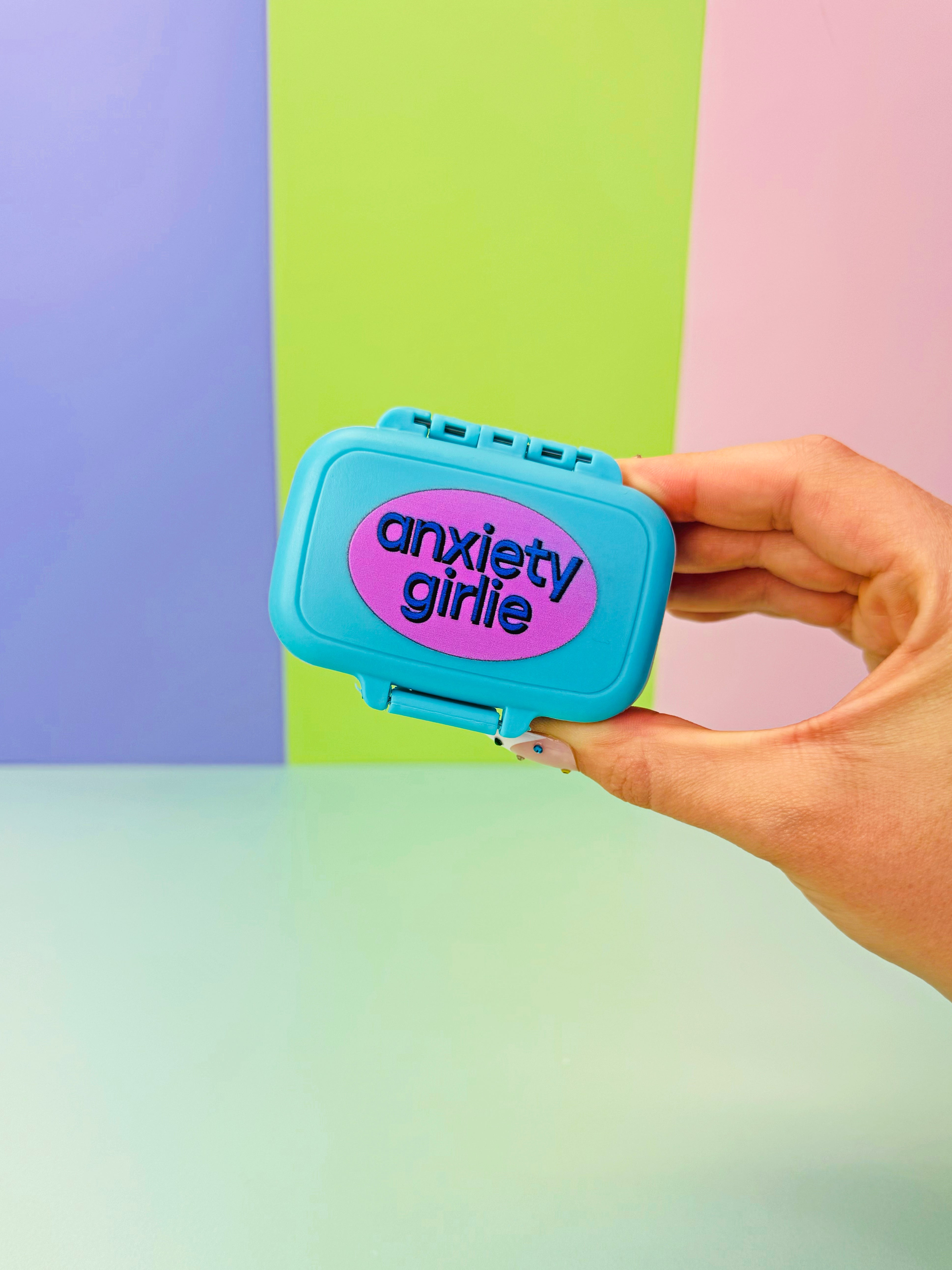 Carry your meds and vitamins in style with this blue pill case that has two convenient, removable dividers on the inside that creates 3 separate compartments . Shaped like an adorable mini suitcase. Water proof + smell proof!