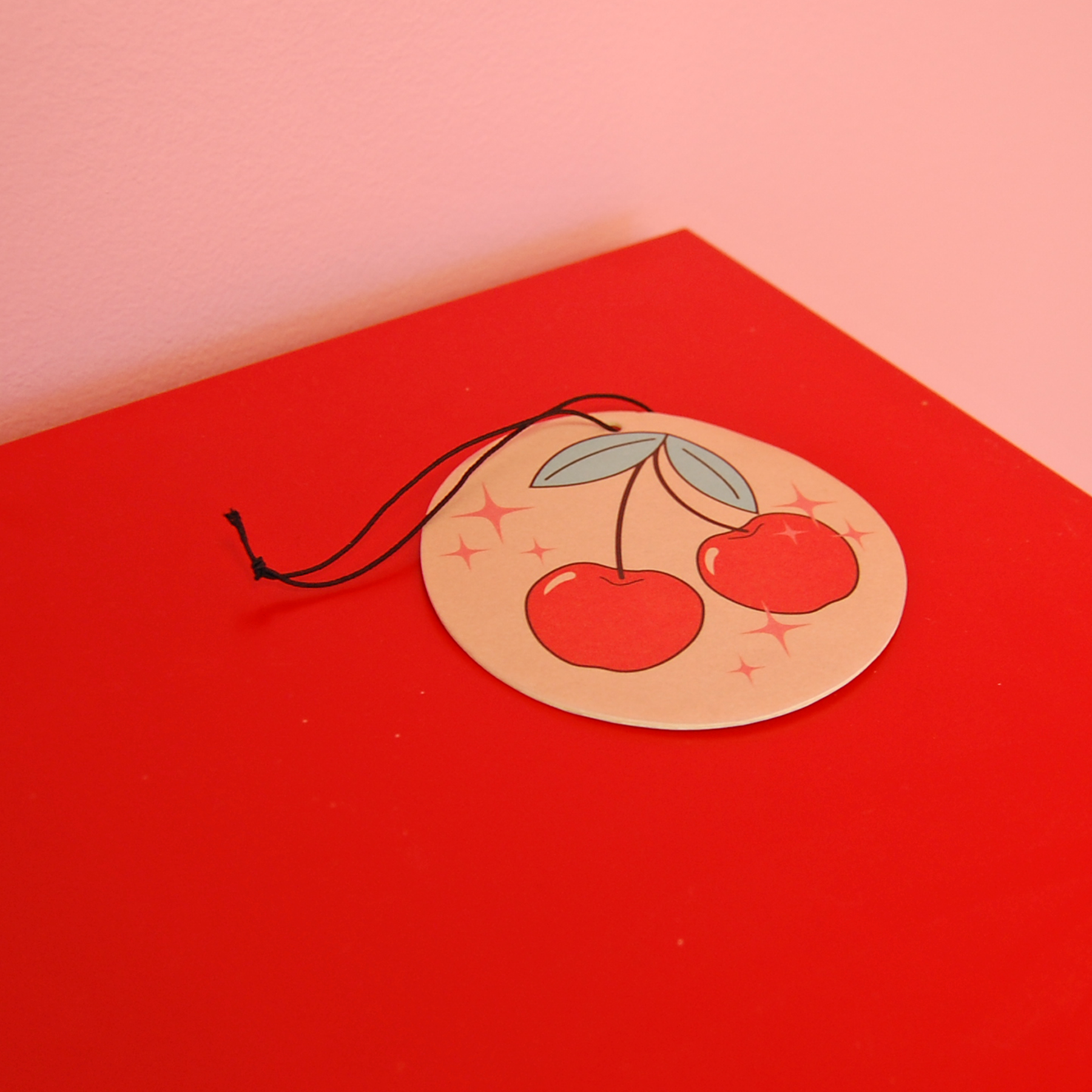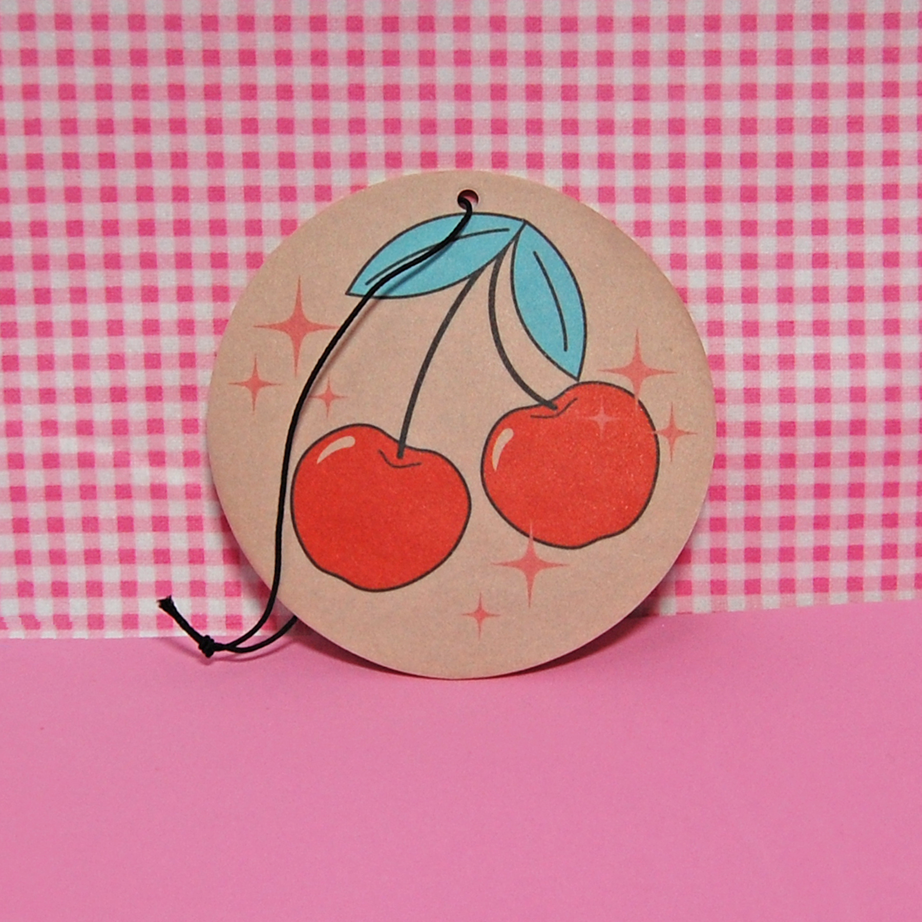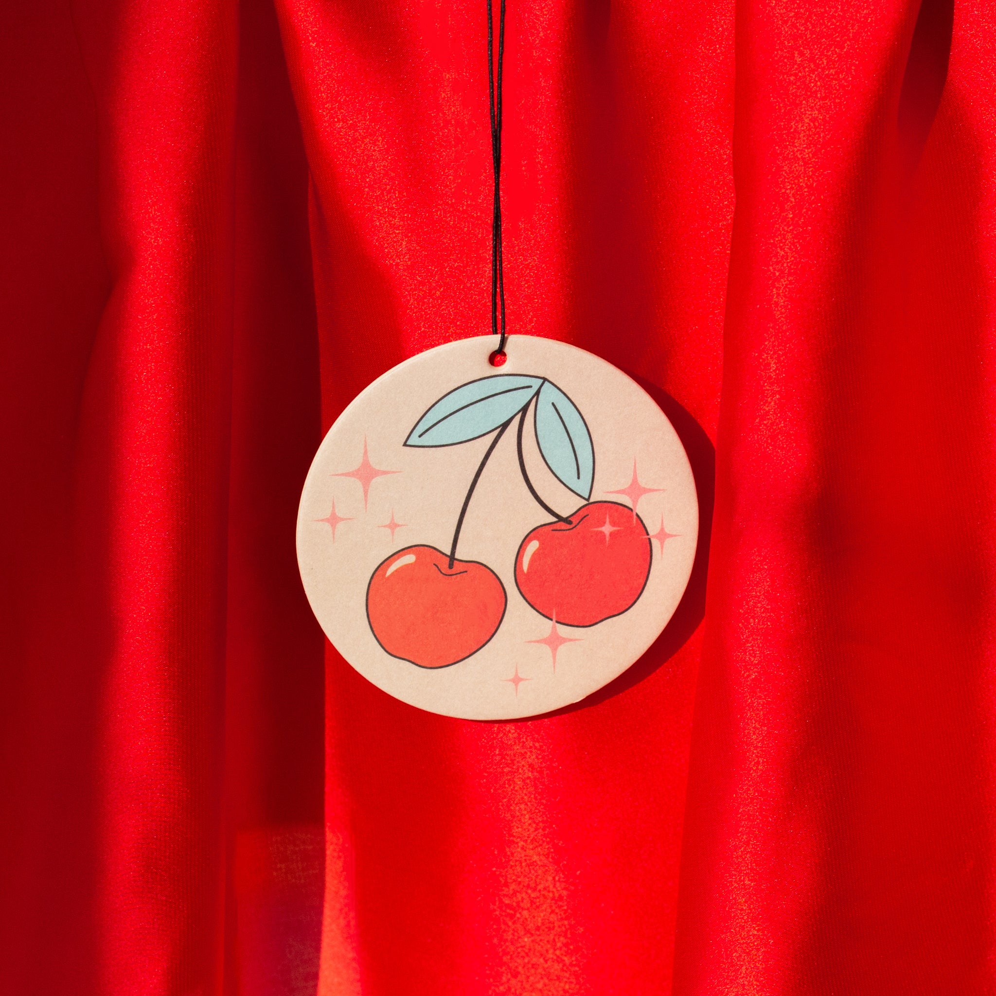 Air freshener is cherry scented and comes with an elastic cord to loop around a rearview mirror.