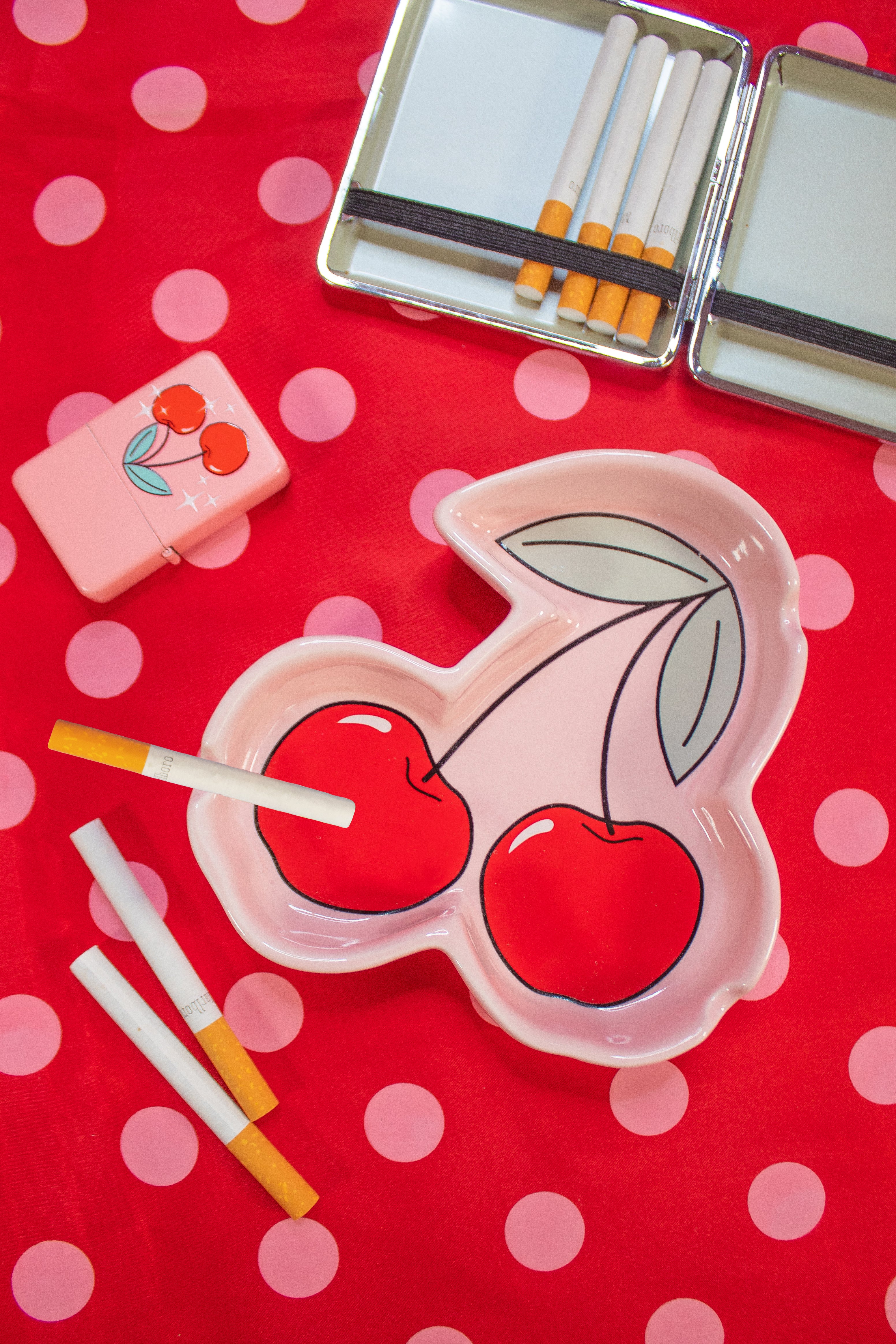 Designed by me, the girl writing this copy and taking these photos lol, this ashtray is handcrafted of substantial ceramic in a cherry shape. It matches our cherry grinder!