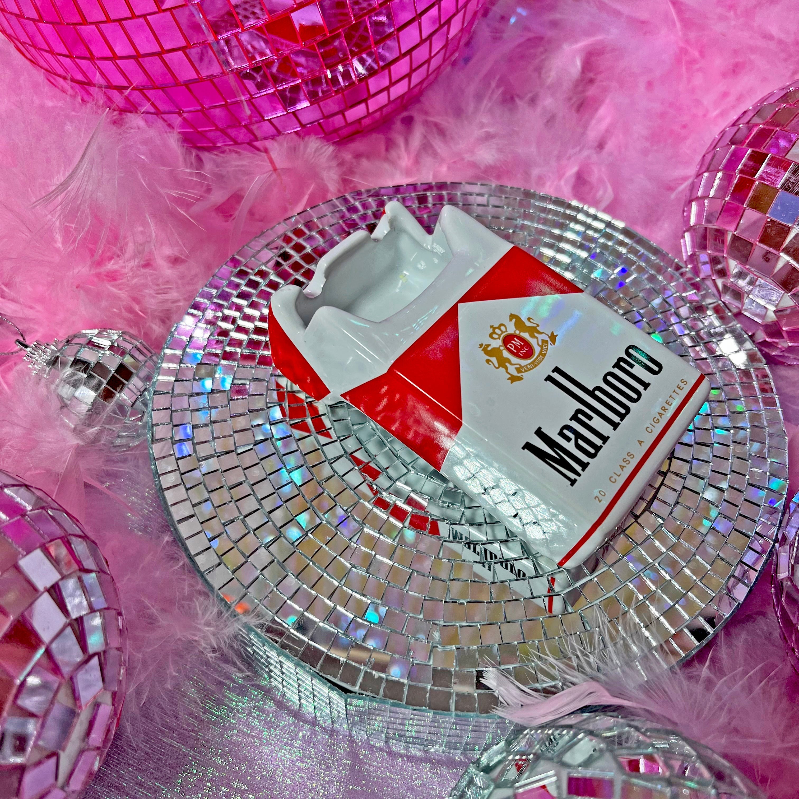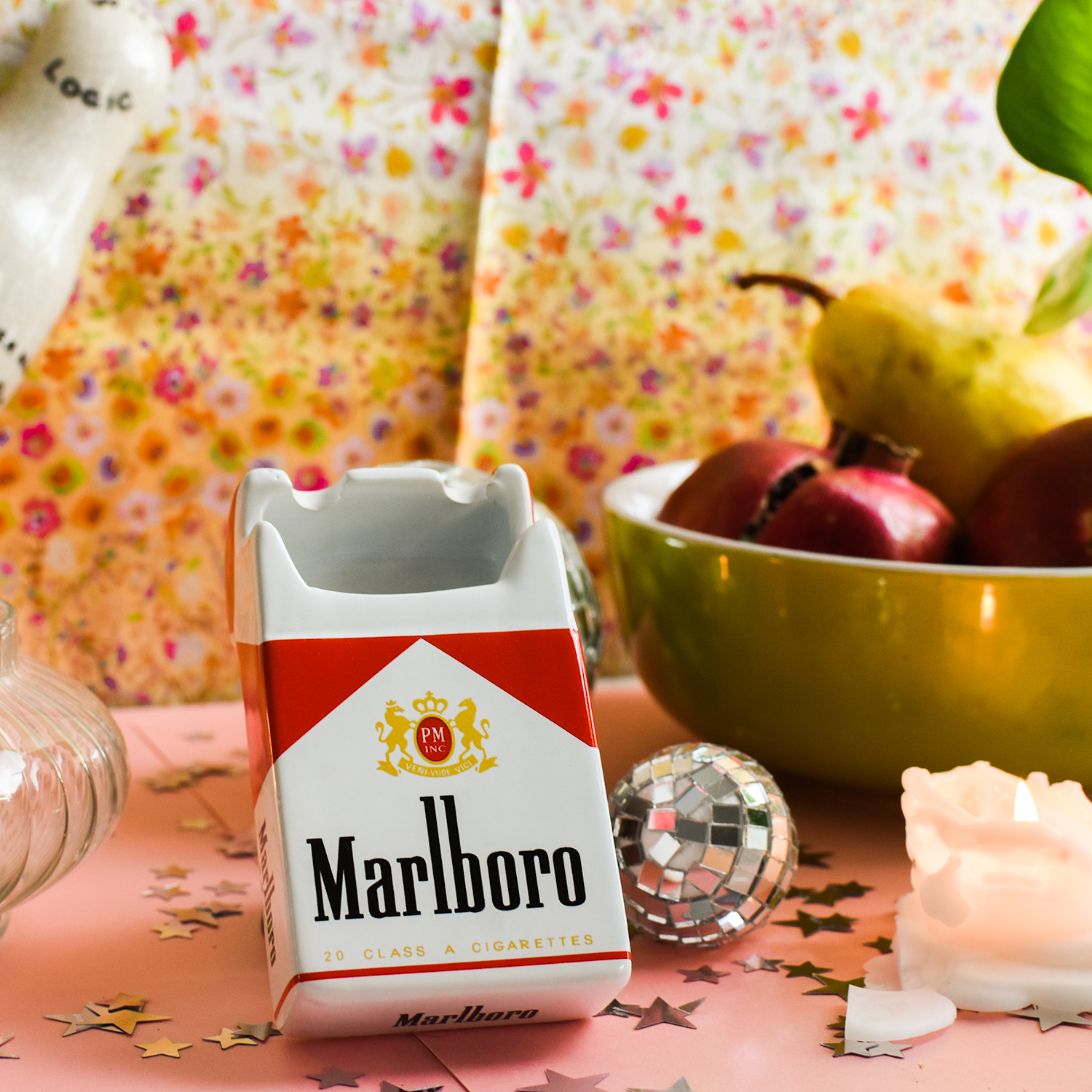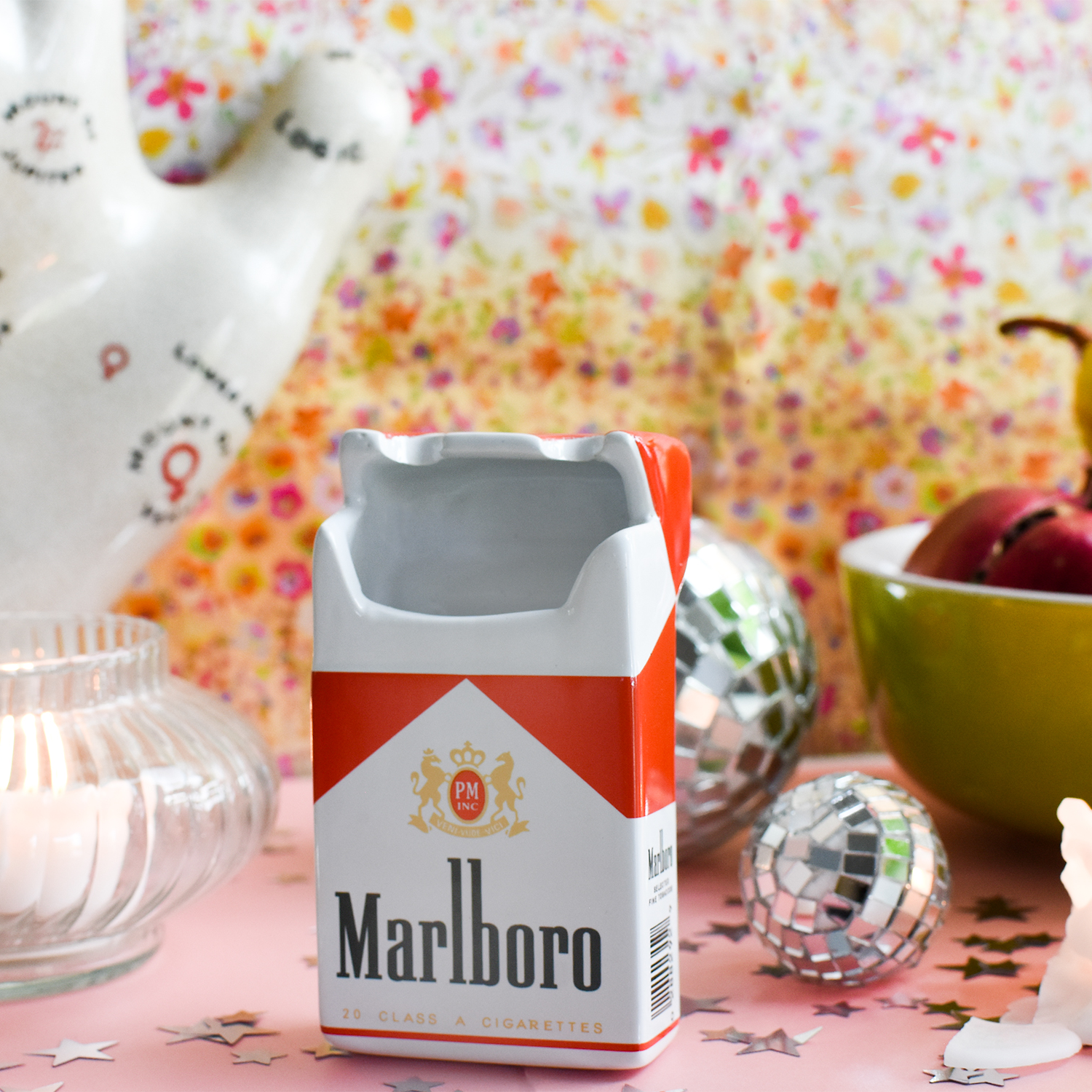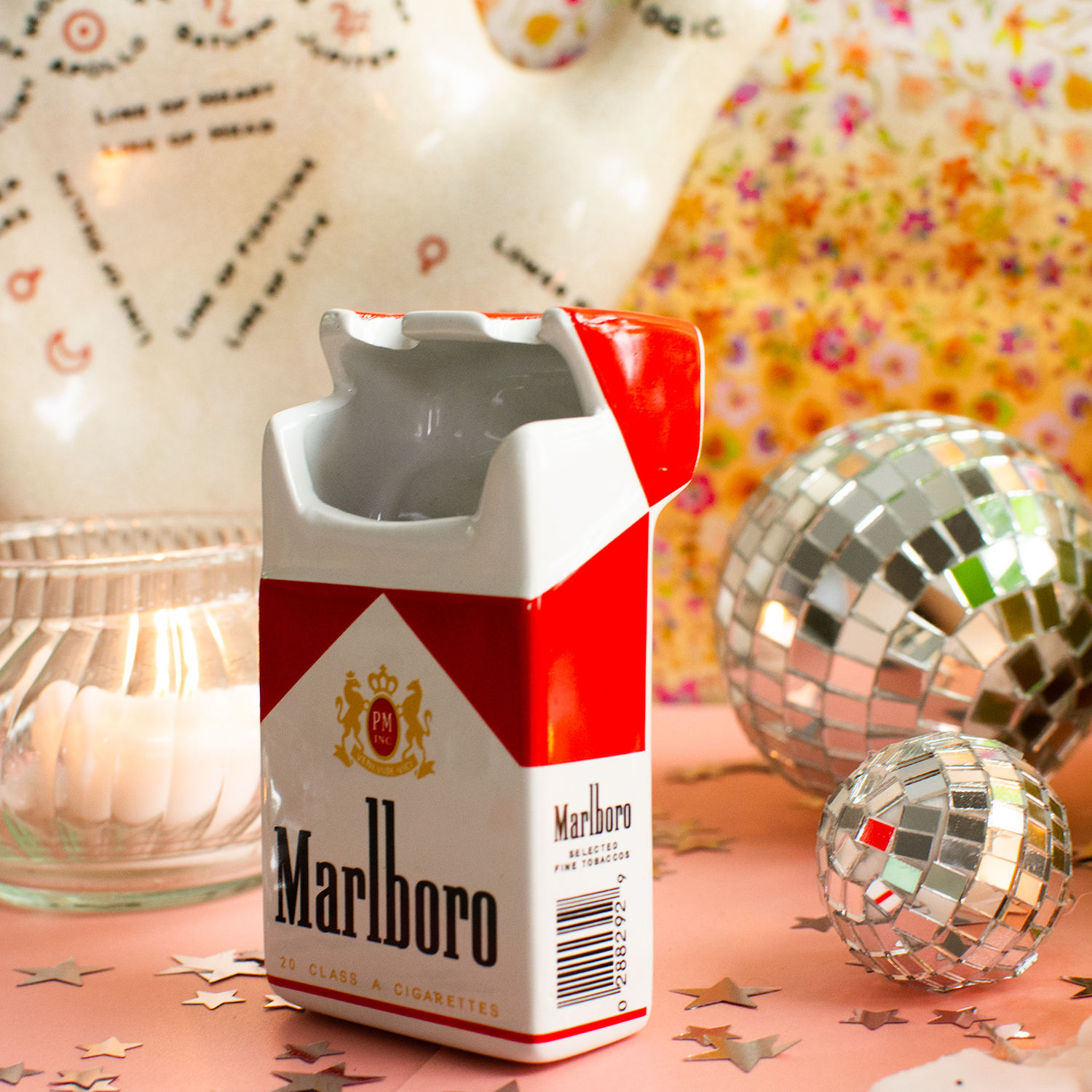 This ash tray brings some perfect vintage vibes. Made entirely of substantial ceramic, this ash tray is decorated to look like a box of your favorite cigs.