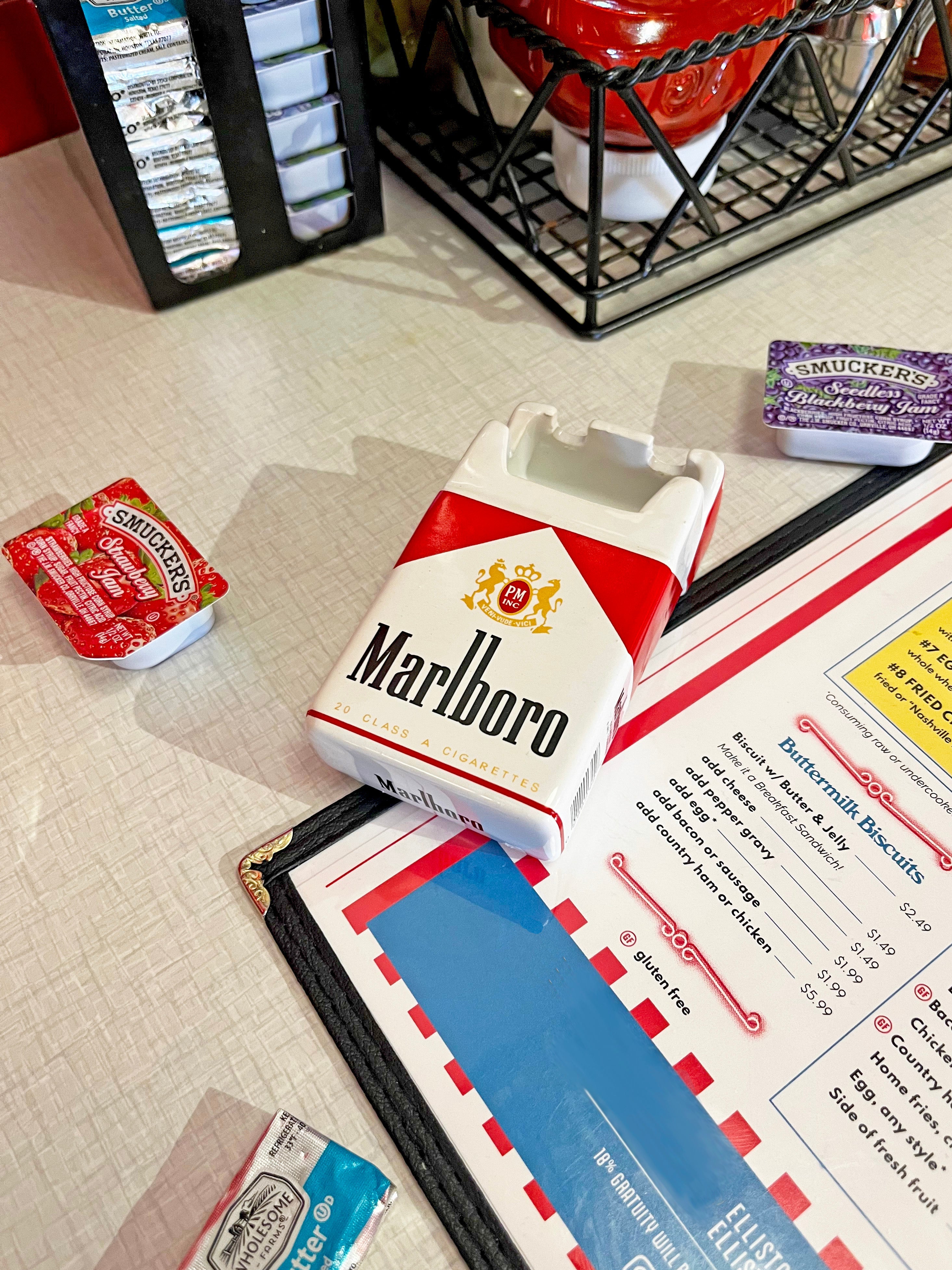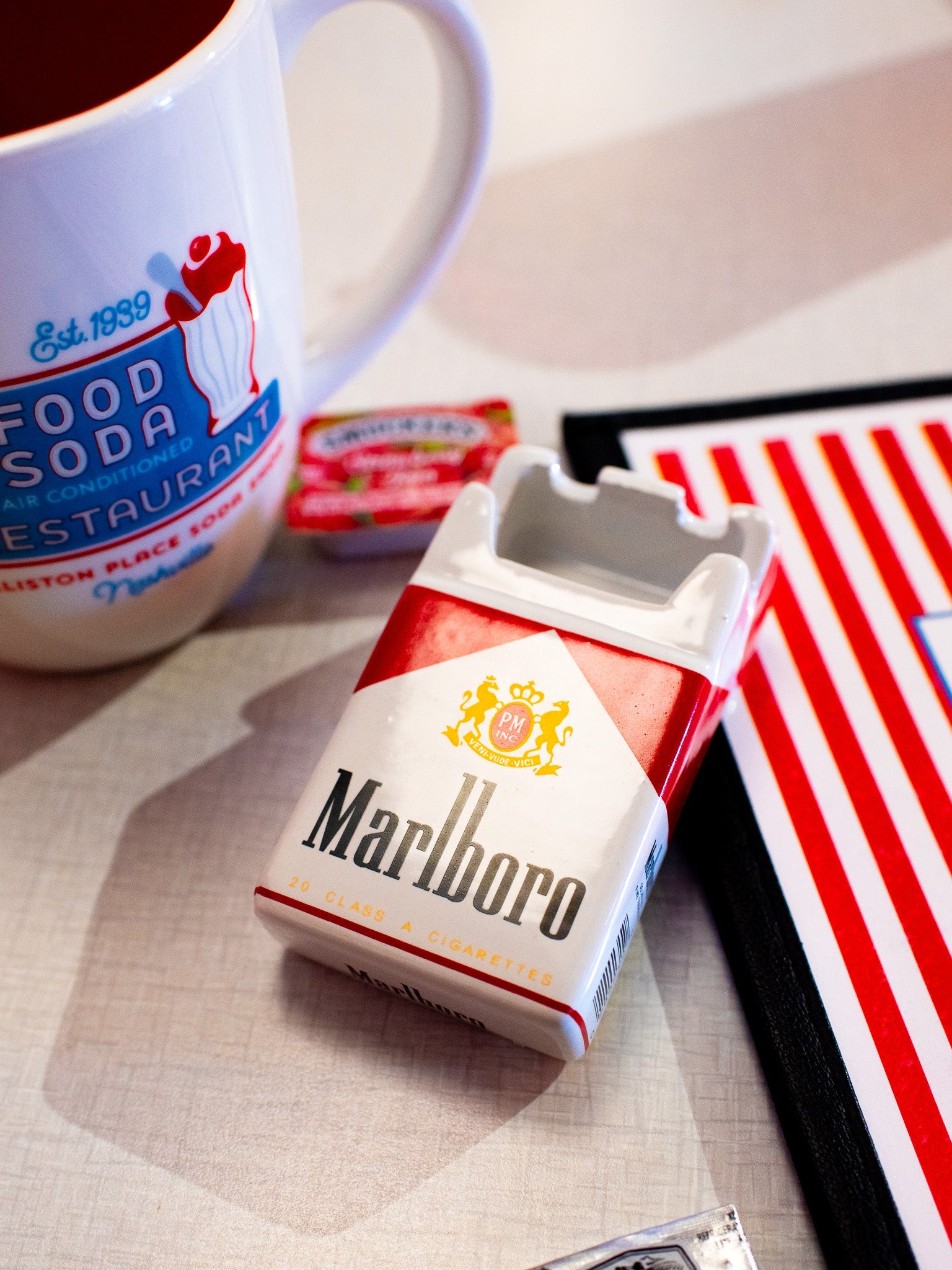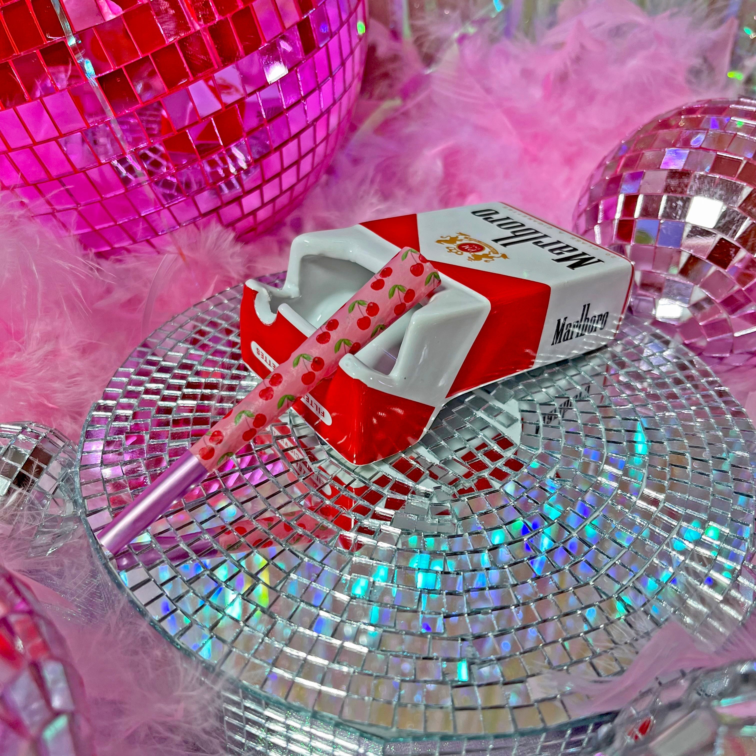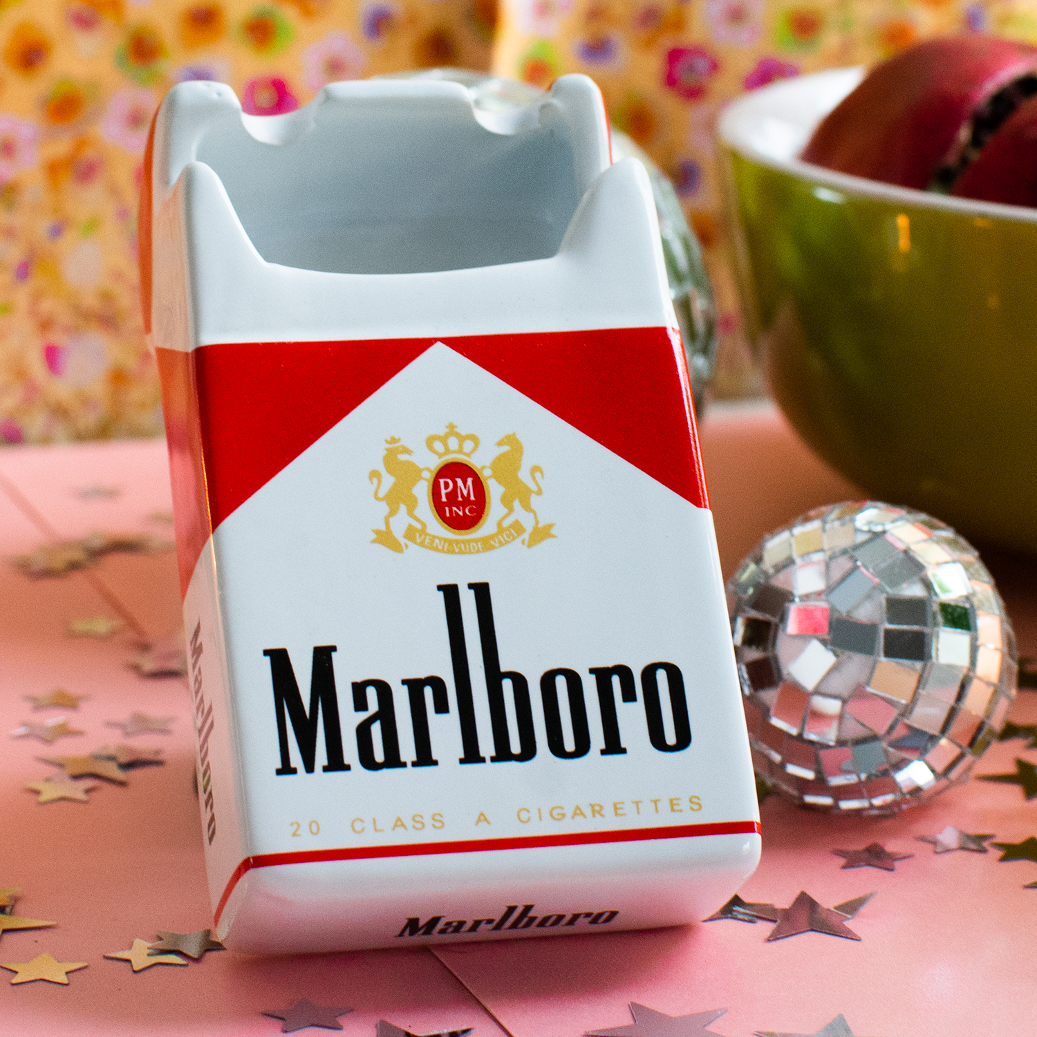 This ash tray brings some perfect vintage vibes. Made entirely of substantial ceramic, this ash tray is decorated to look like a box of your favorite cigs.