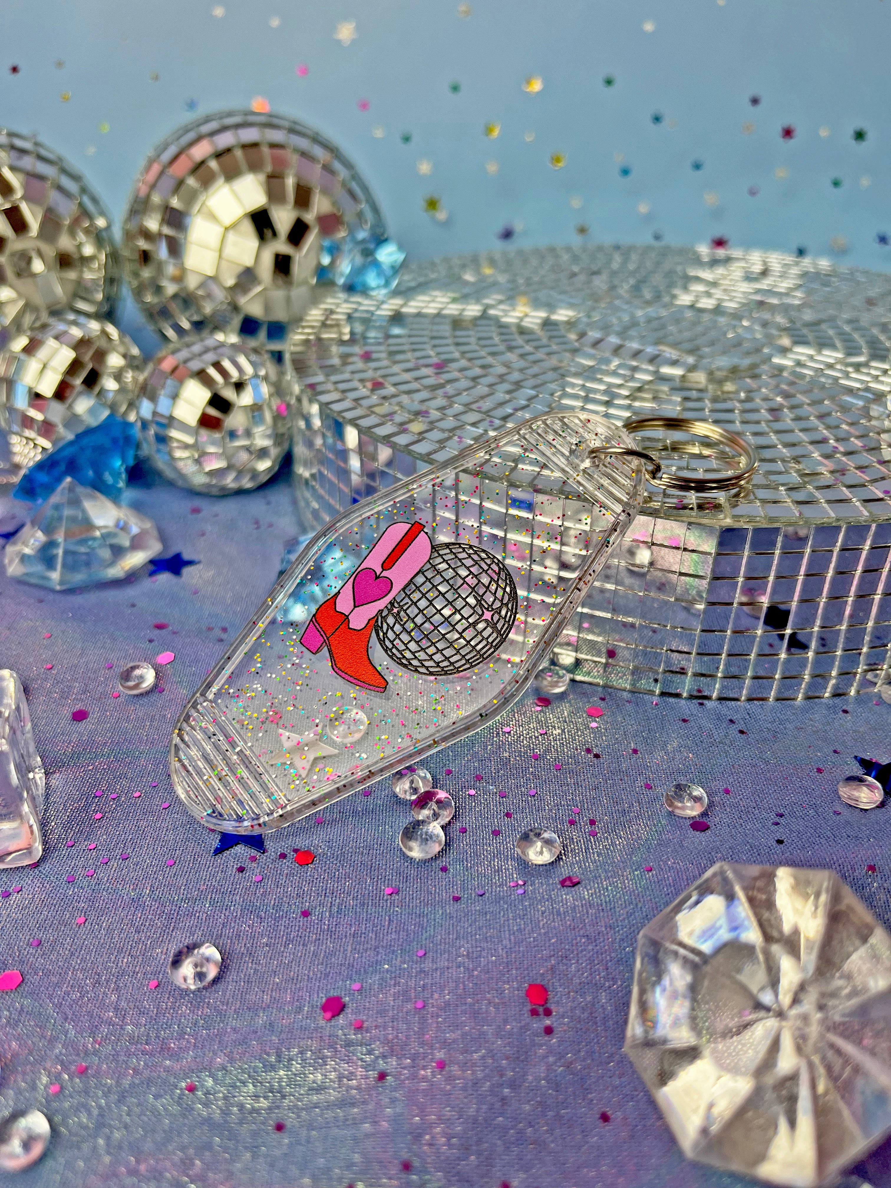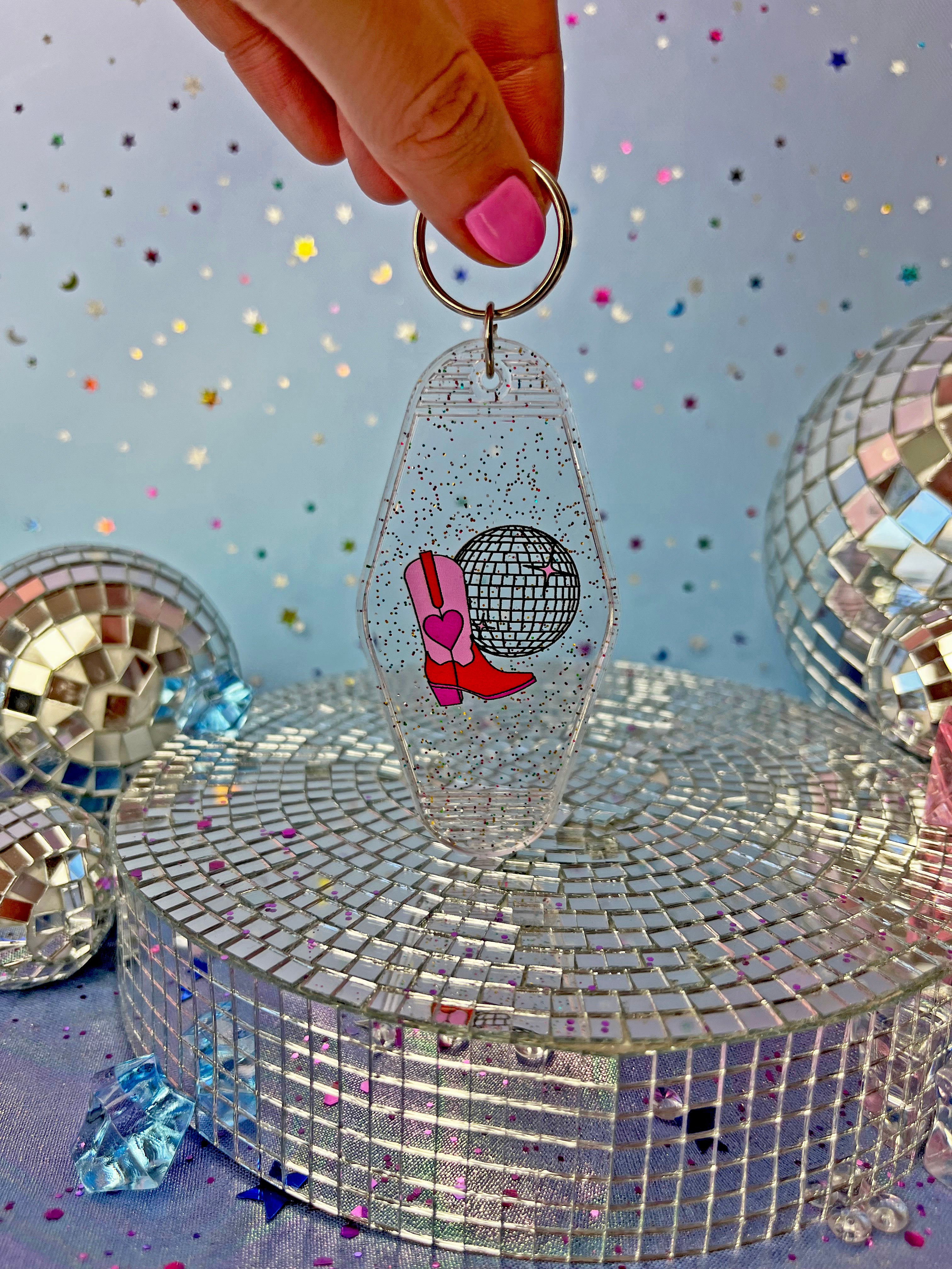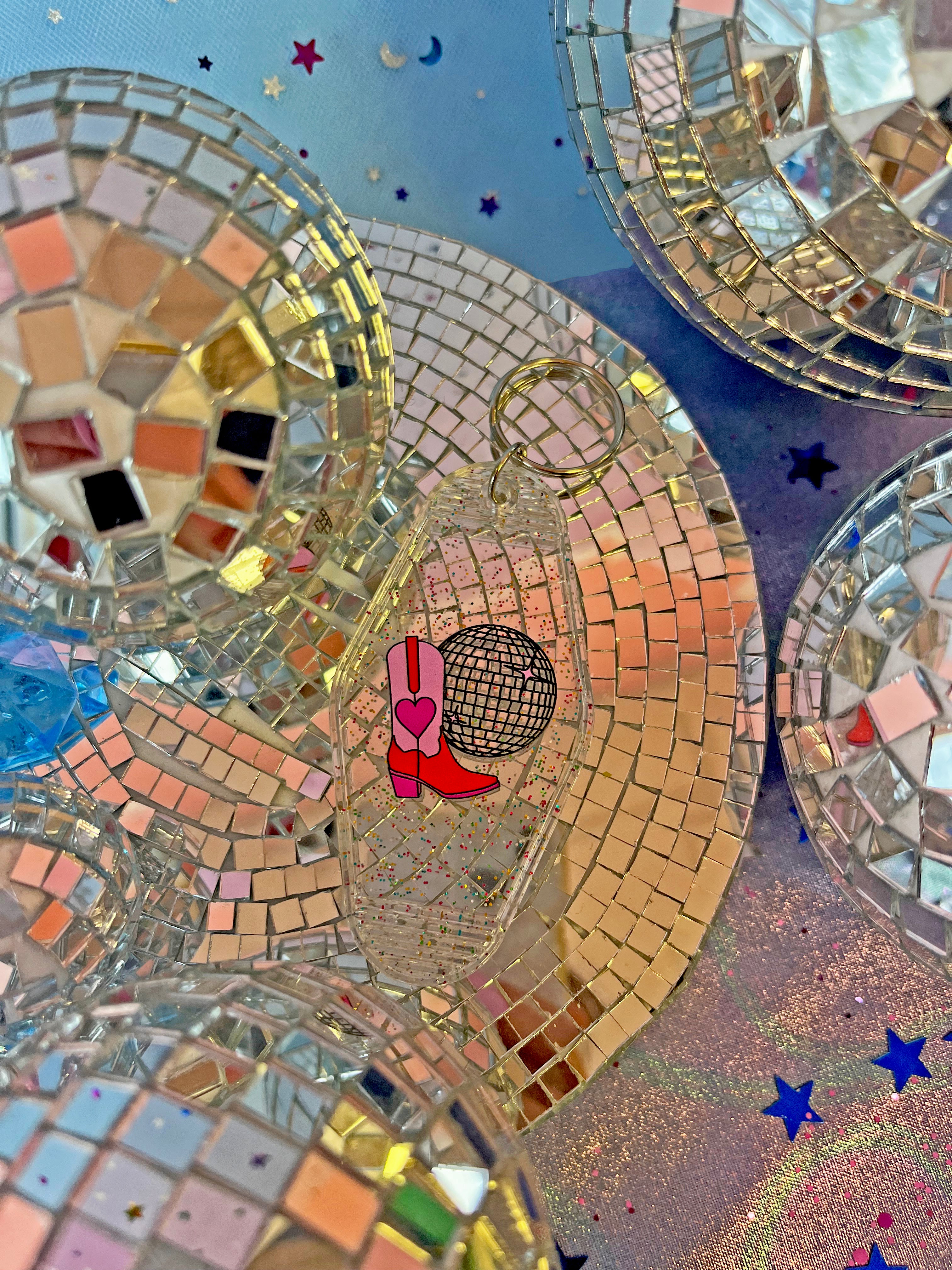 This keychain is adorned with a cute boot and disco ball, drawn by yours truly 😊