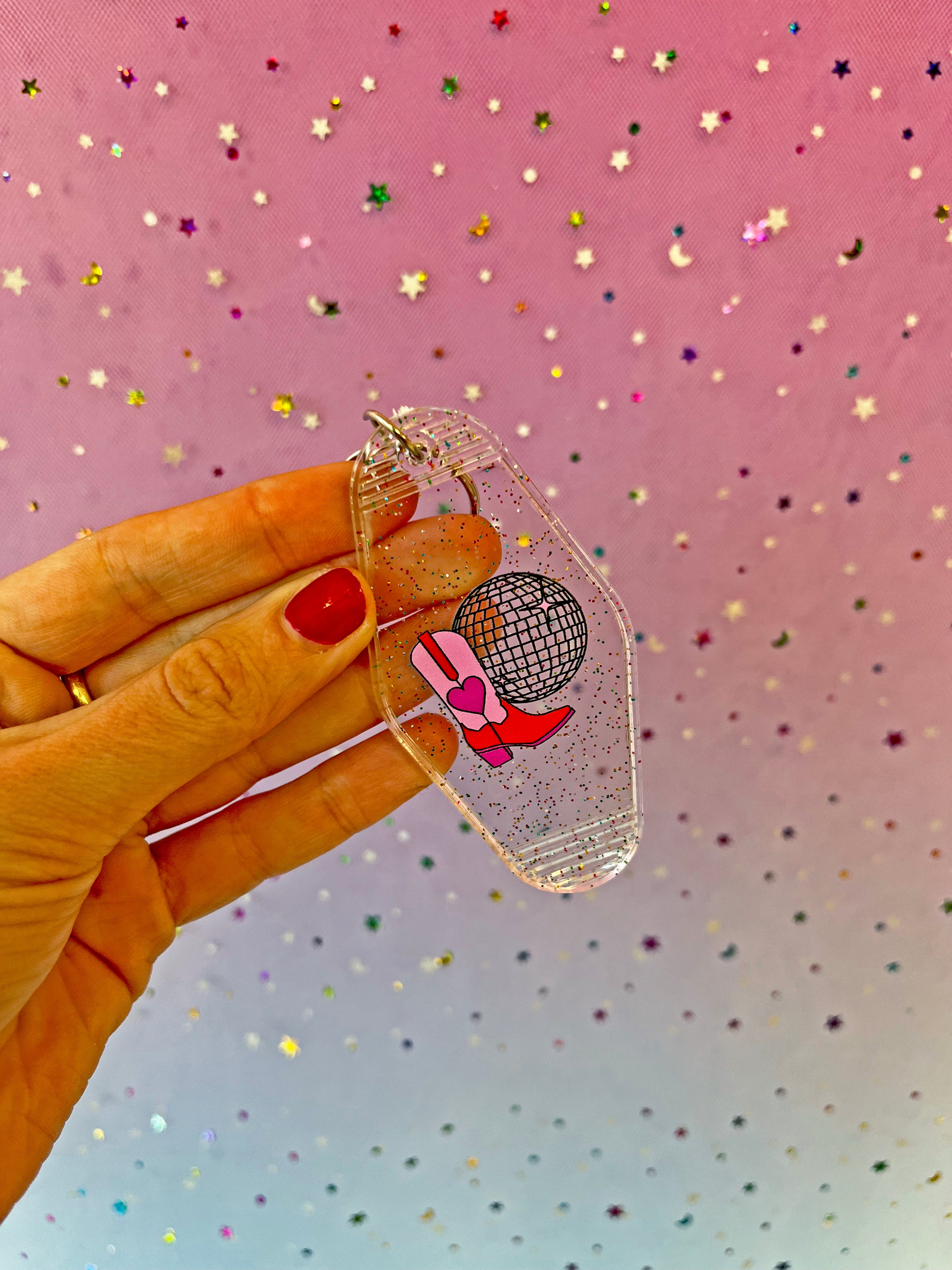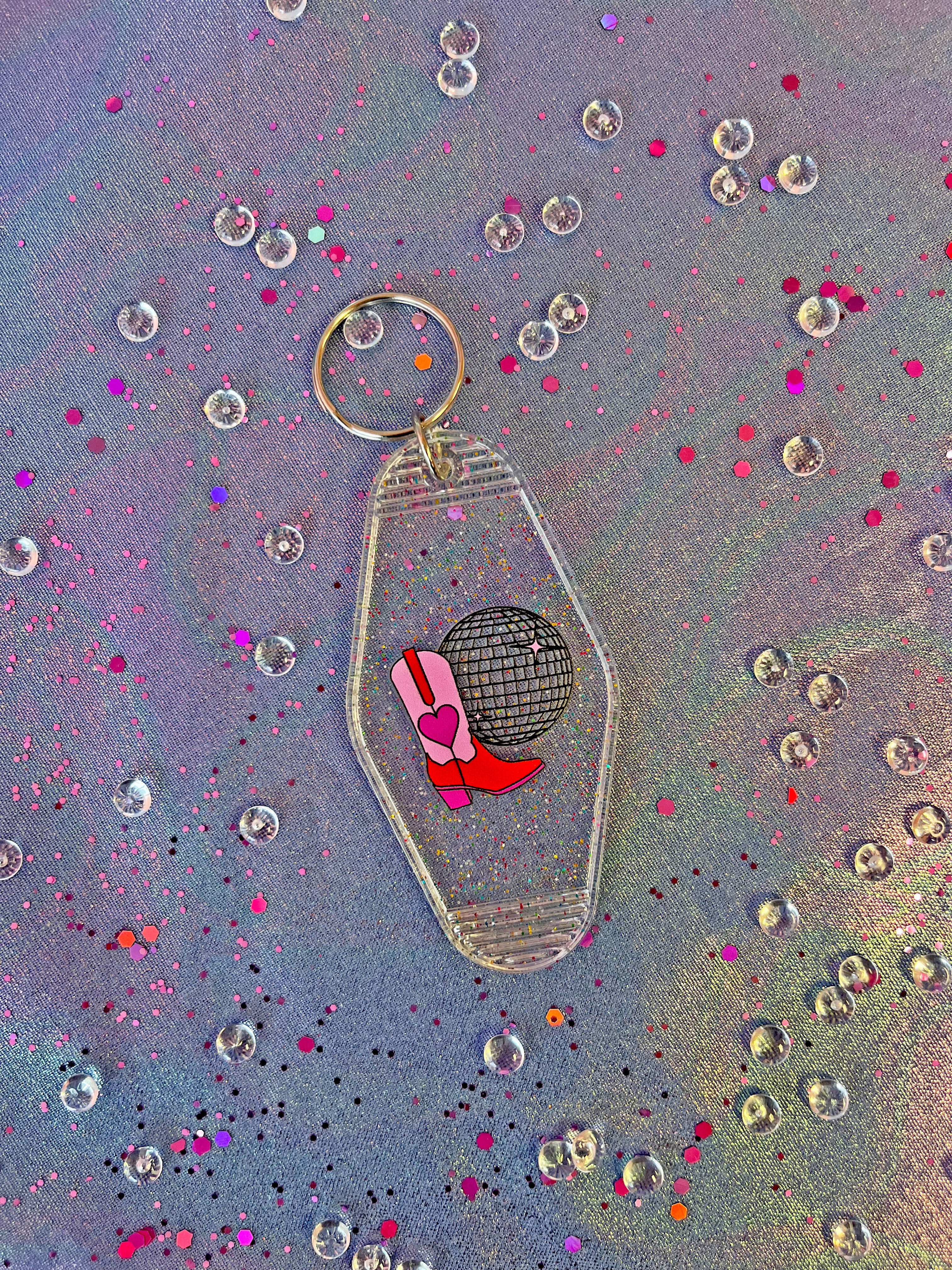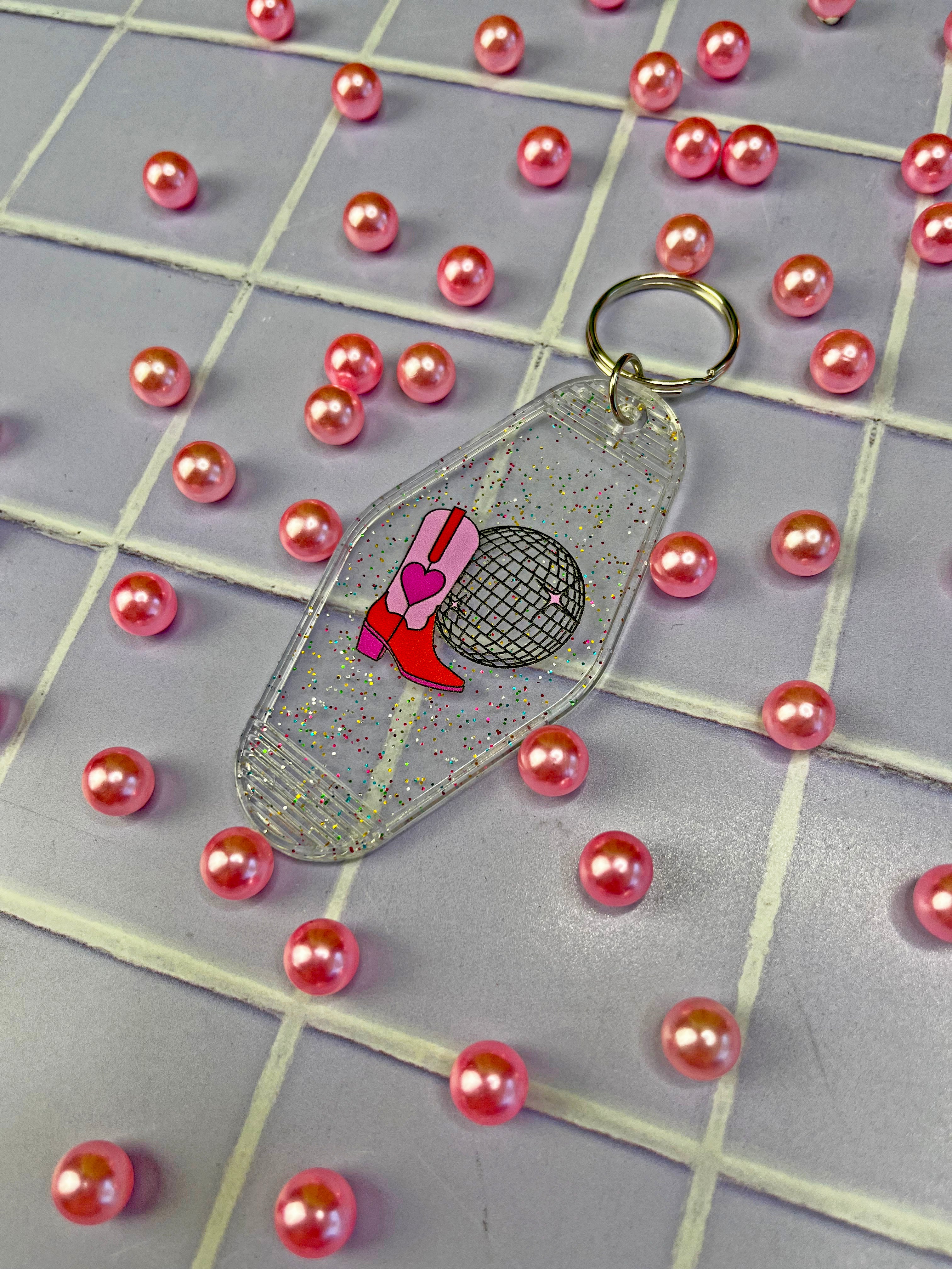 This keychain is adorned with a cute boot and disco ball, drawn by yours truly 😊