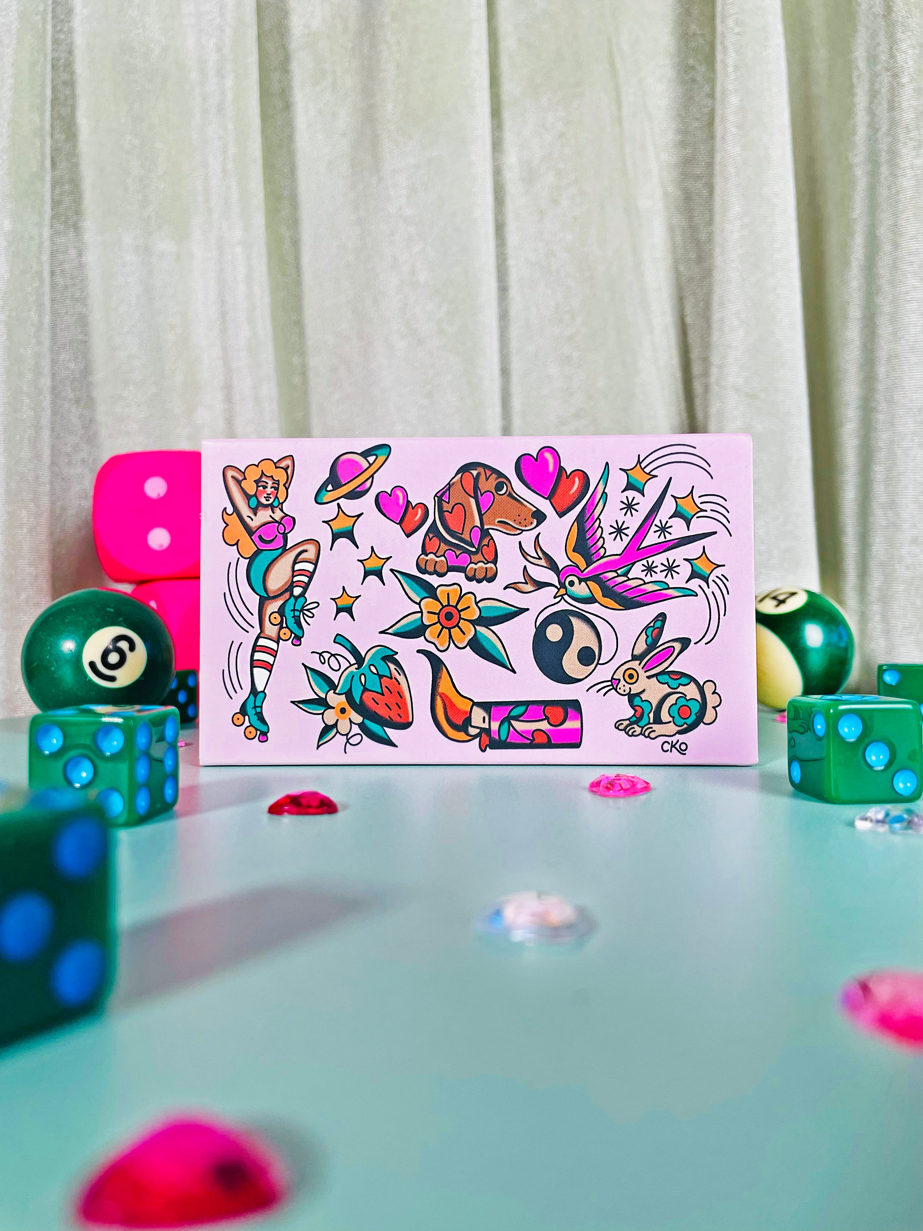 These XL matchboxes feature a striker on one side of the box, pink and green matches, and flash made specially for us by our friend Courtney O'shea at Nashville tattoo shop Black 13 (known on the internet as @CourtneyKoTattoo)!