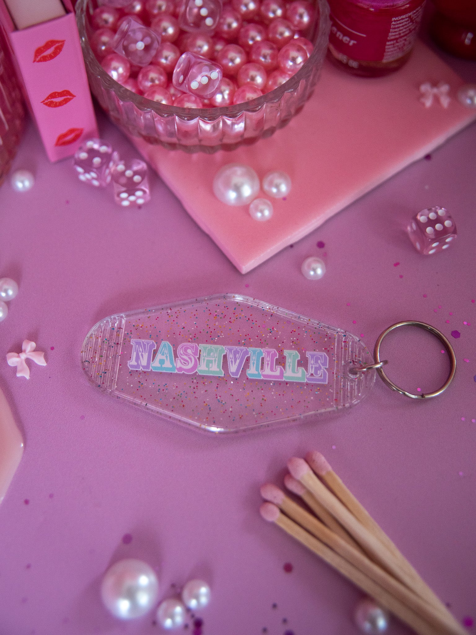 This keychain says NASHVILLE in rainbow pastel letters on a glittery clear motel keychain.