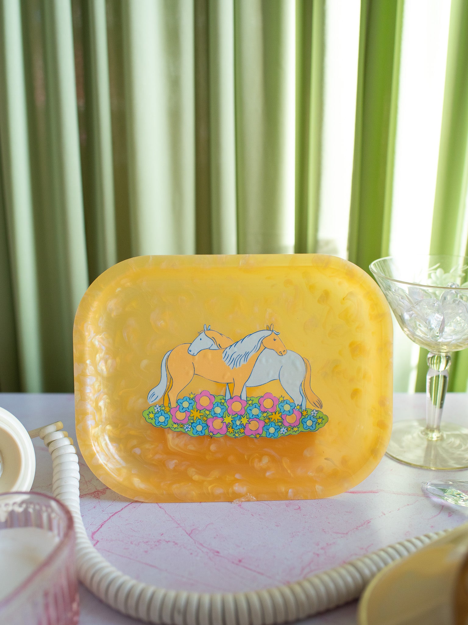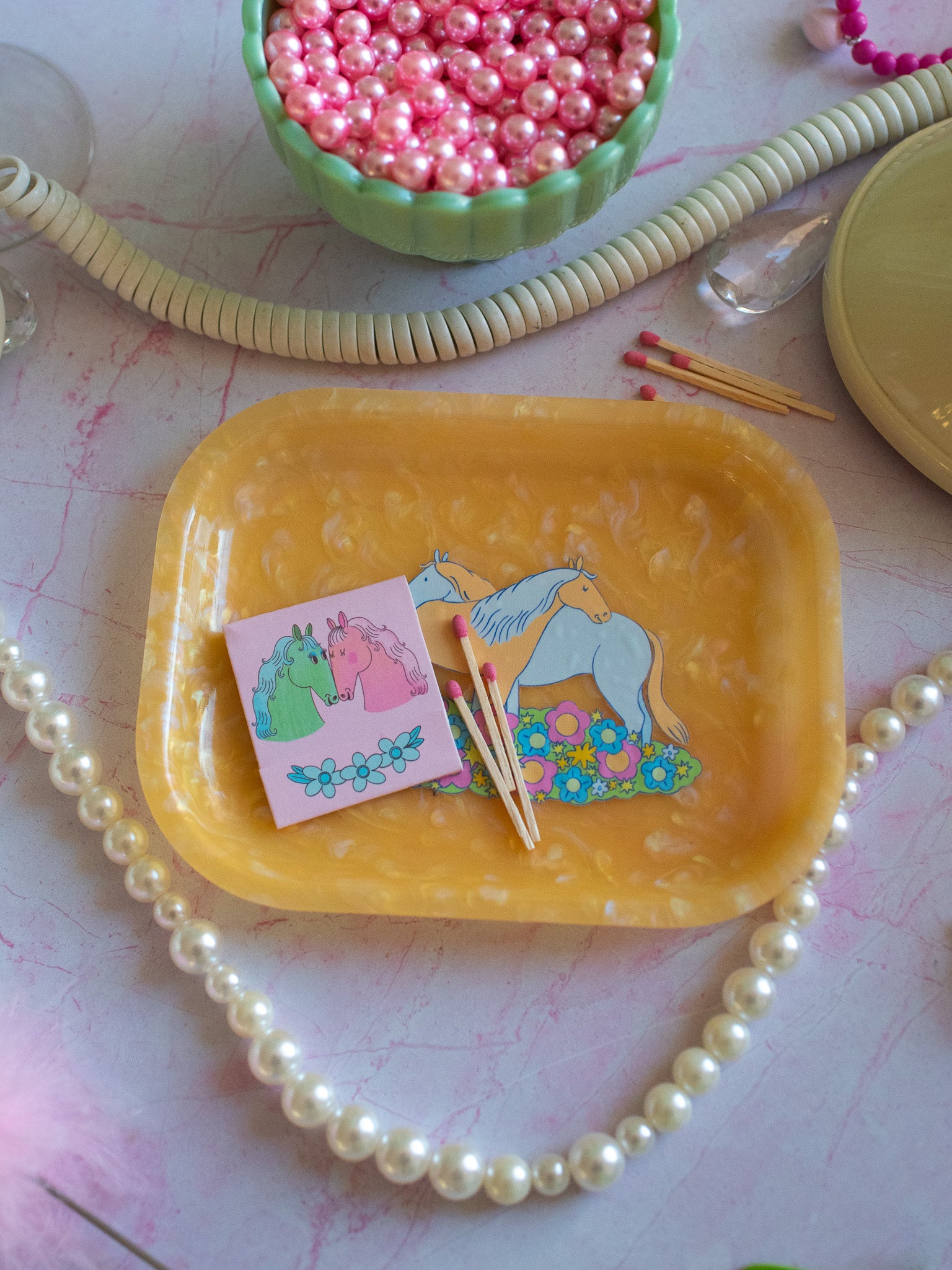This tray is made from a gorgeous pearlescent buttery yellow acetate and is perfect for rolling or you can even use it as a trinket tray! Features two ponies in love <3 drawn by Claire Shadomy!
