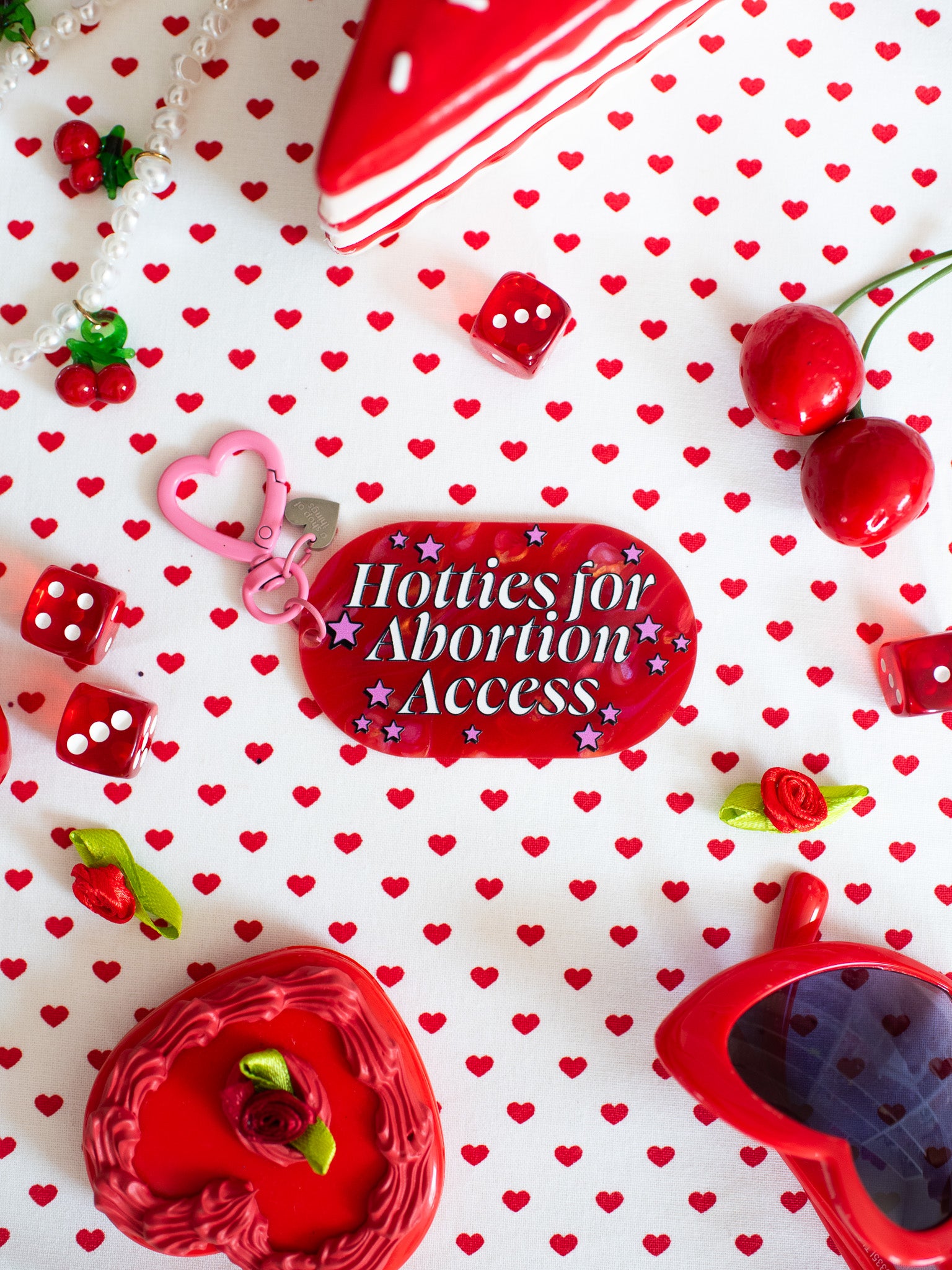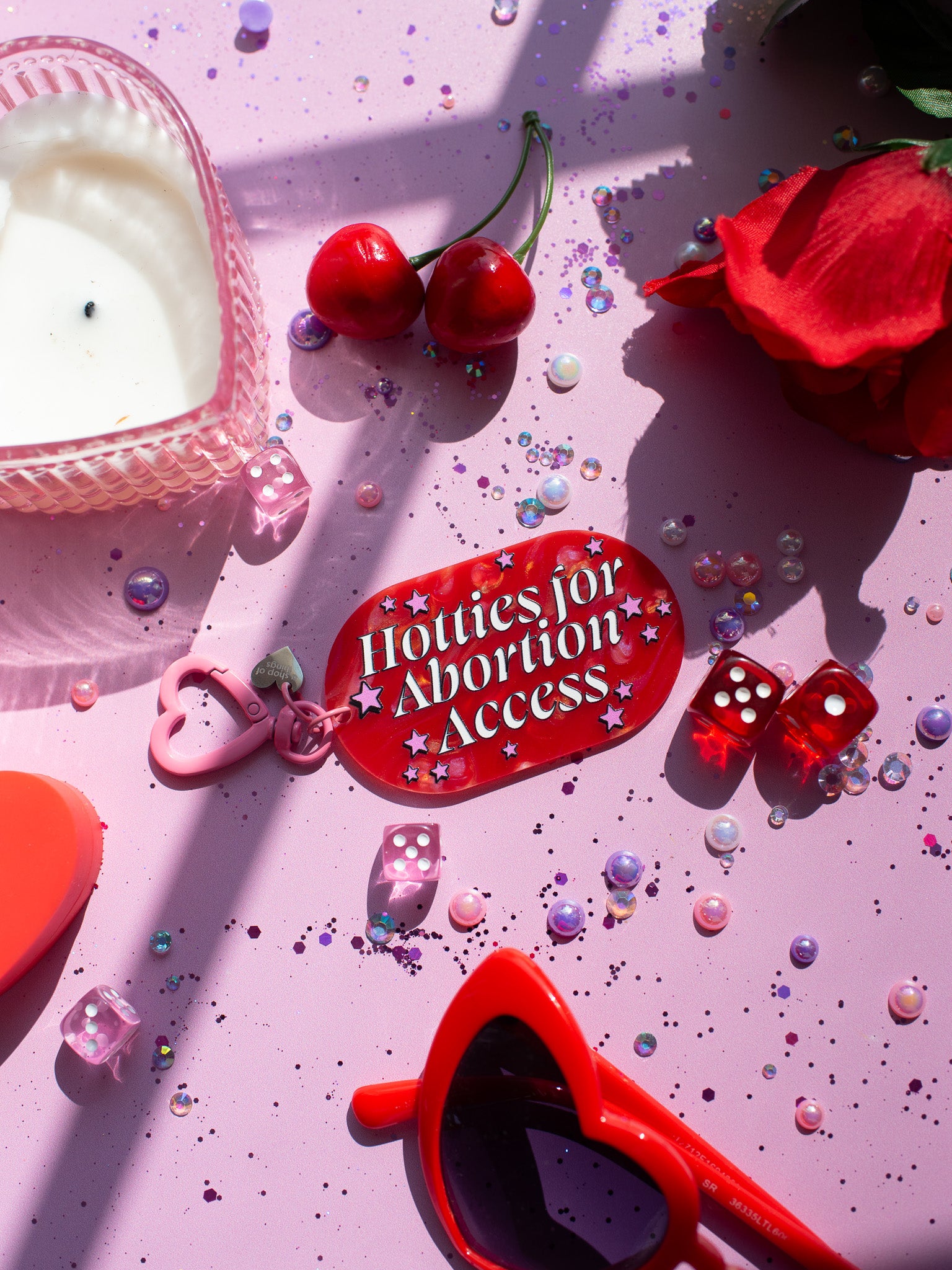 This keychain says: HOTTIES FOR ABORTION ACCESS!