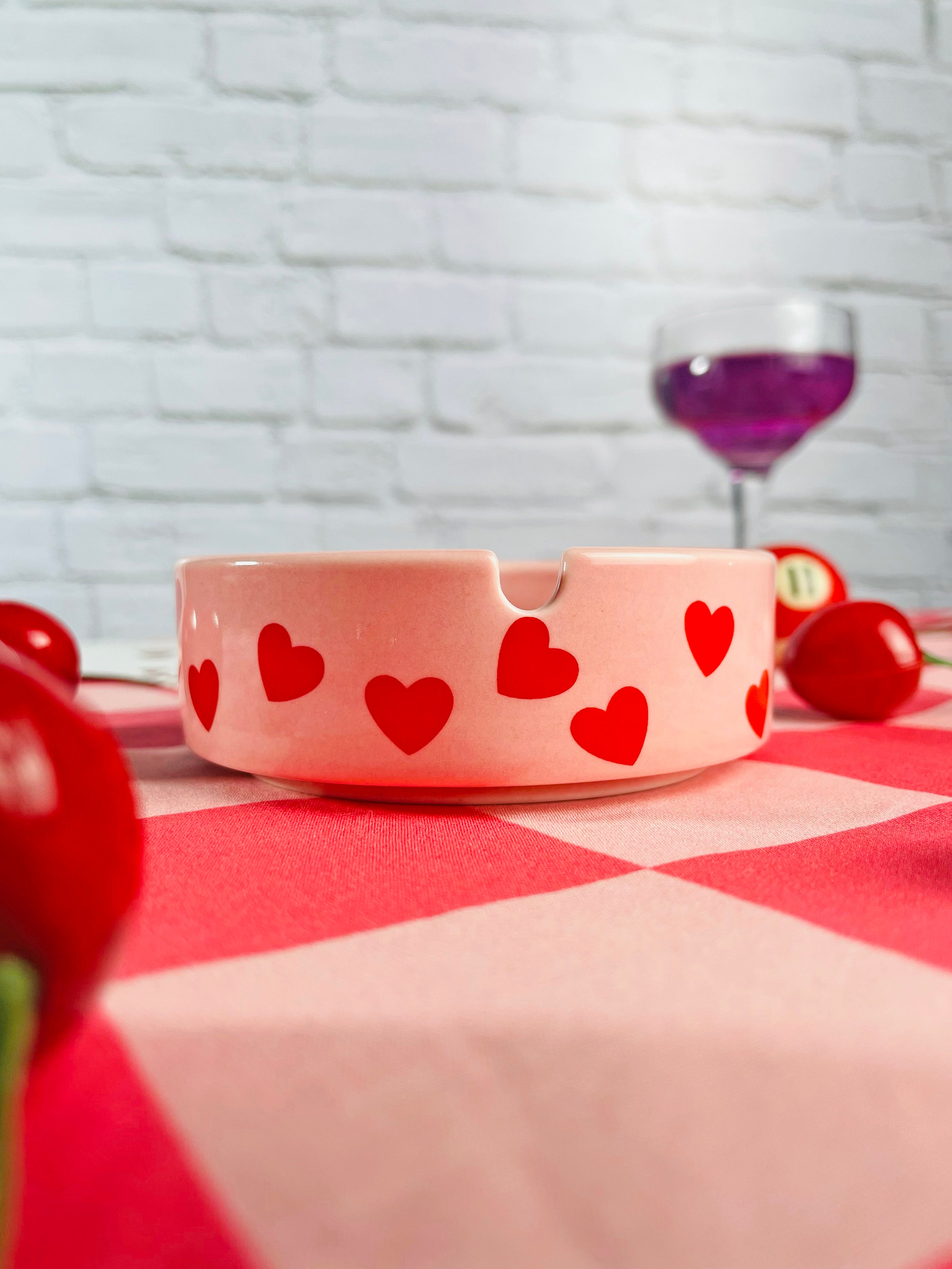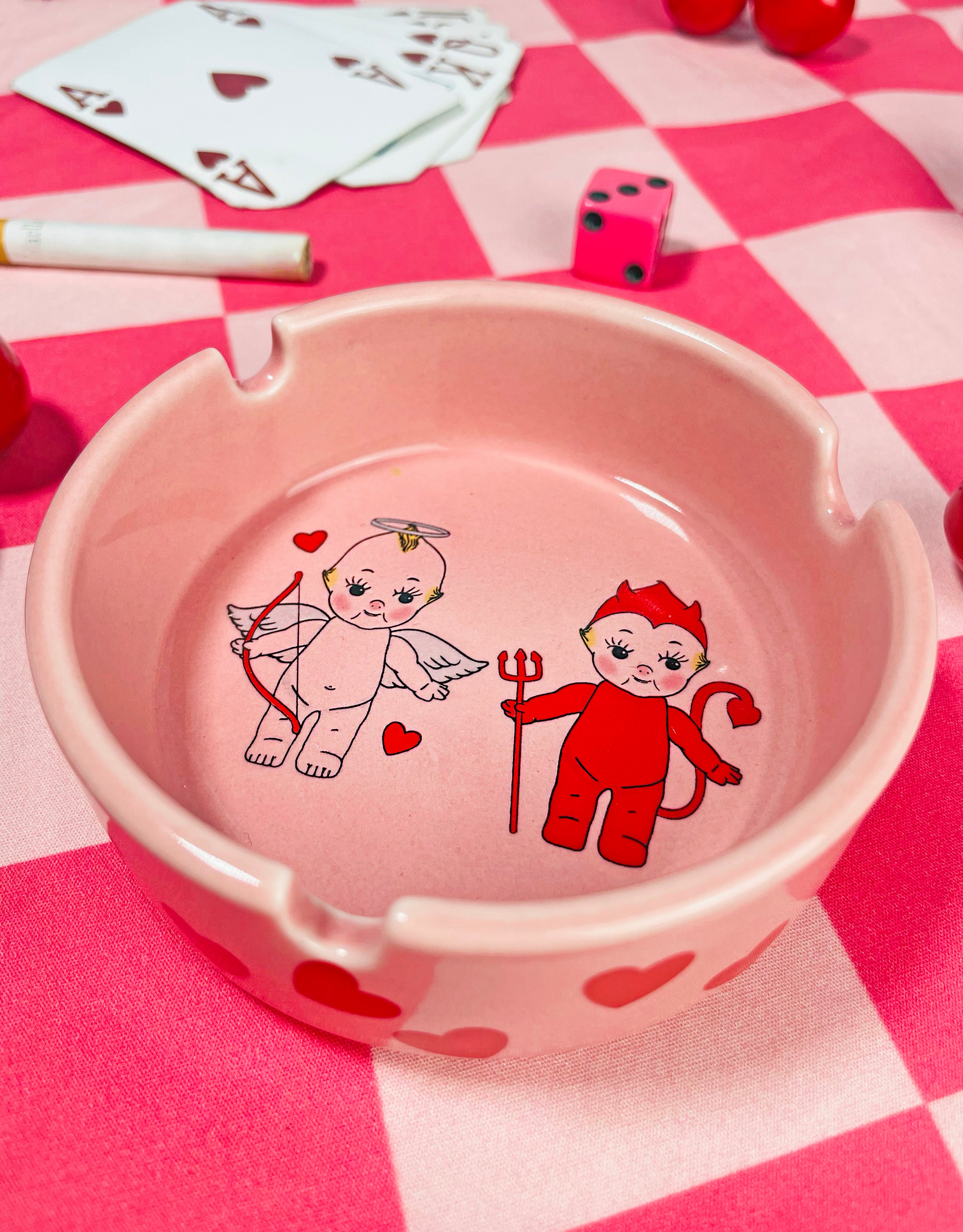 The angel and devil on your shoulder, but make 'em cute! These classic ash trays feature indents for cigs, joints, matches, etc. They are made of ceramic with pink glaze and feature two kewpies in the center. Red hearts decorate the outside of the tray :)