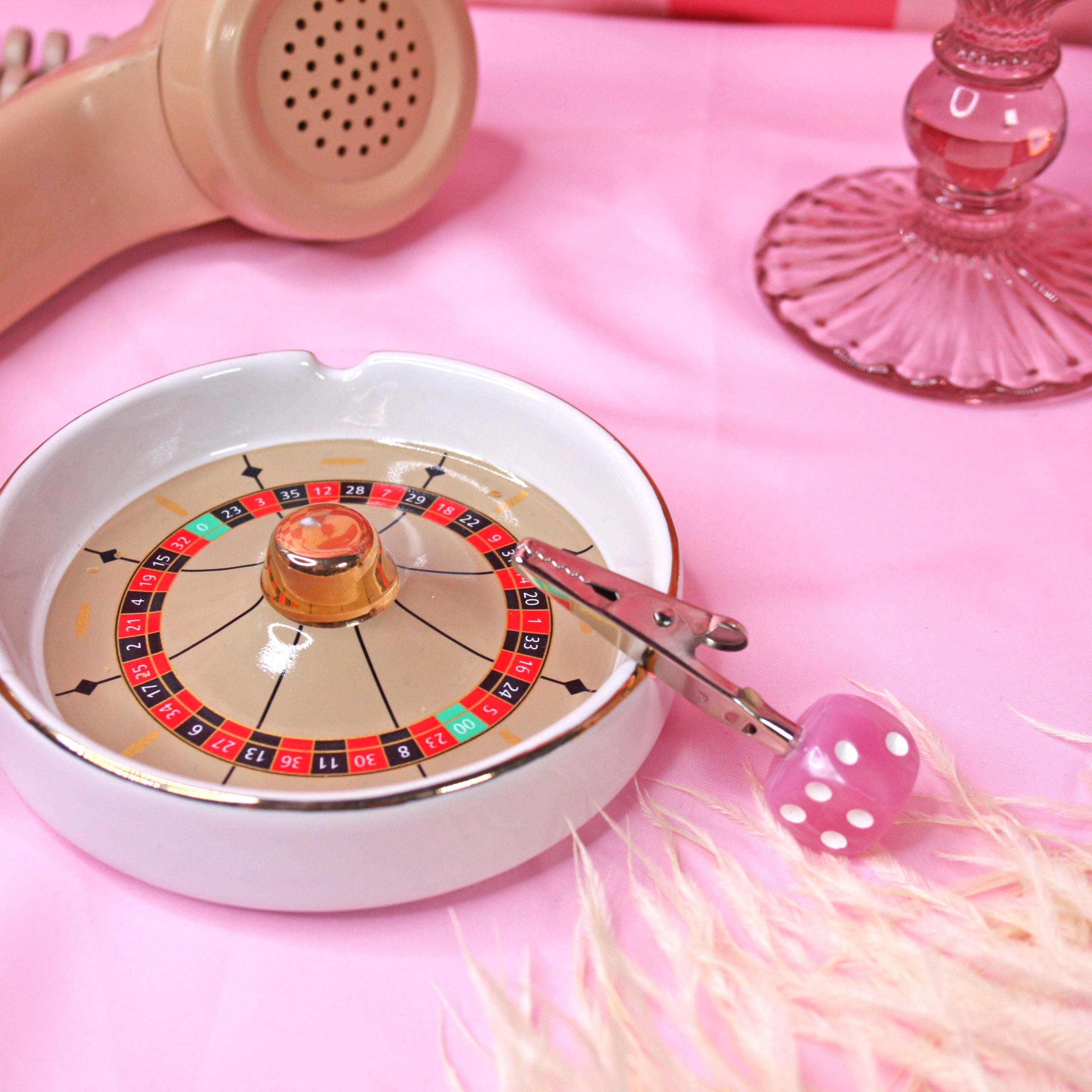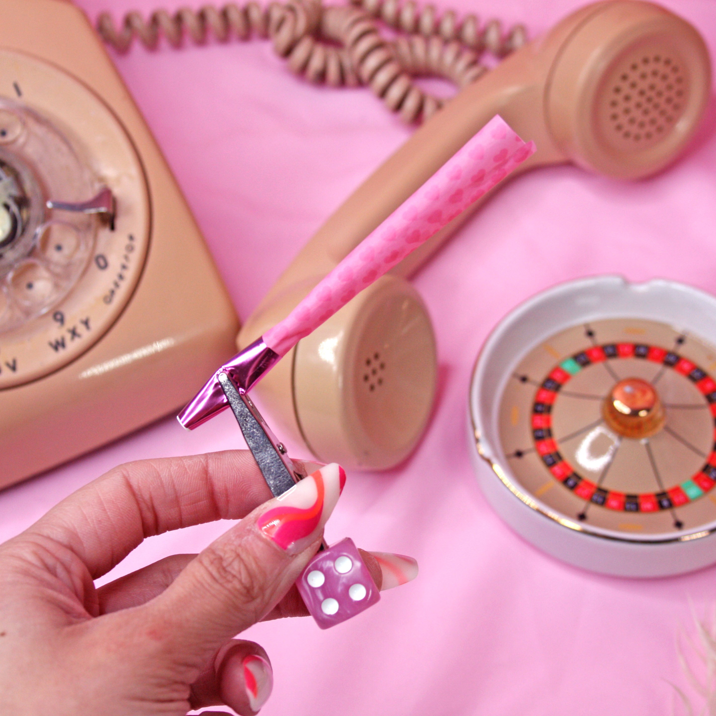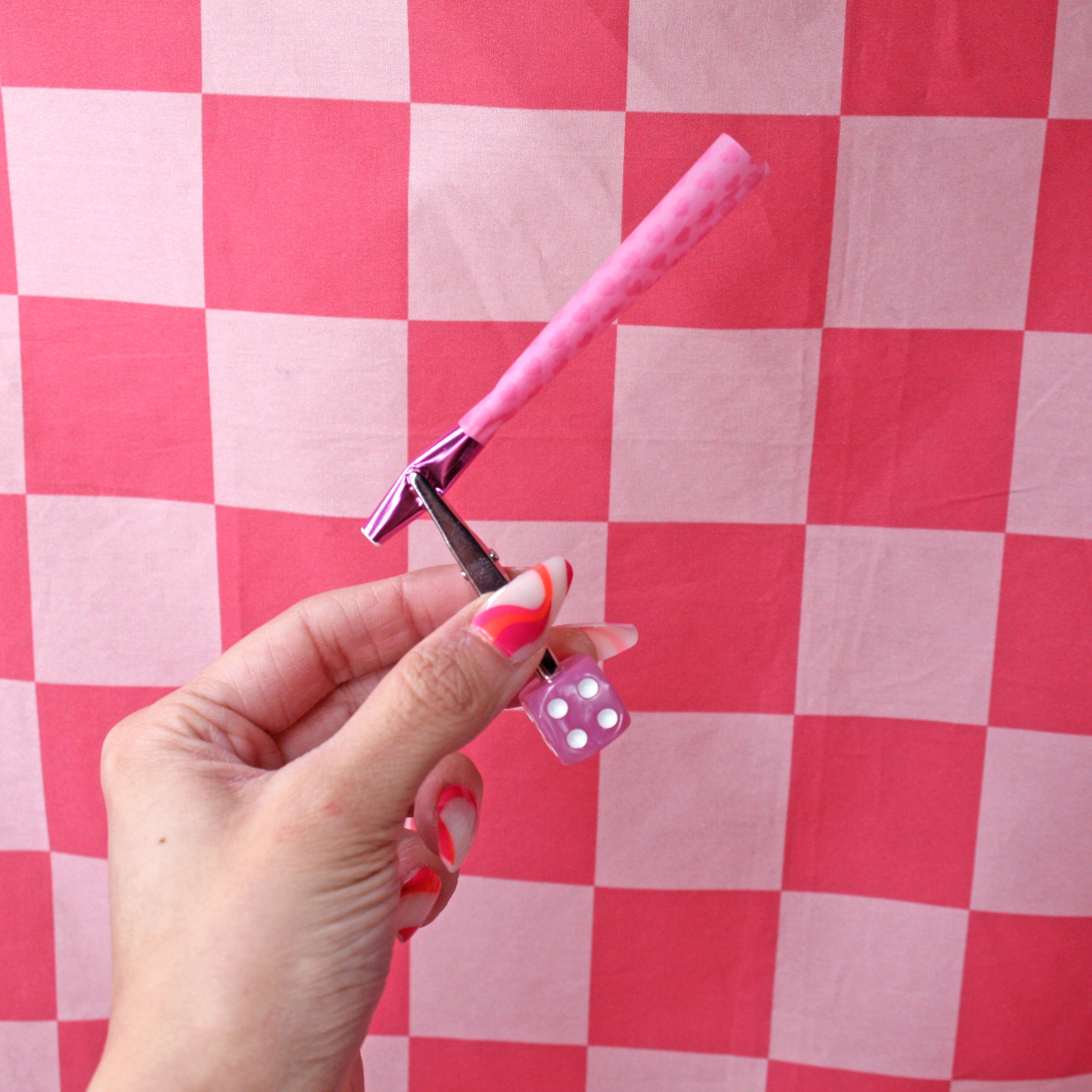 Joint stays clipped between the silver claws on the bottom of the clip. Real pink dice are the base of these clips.
