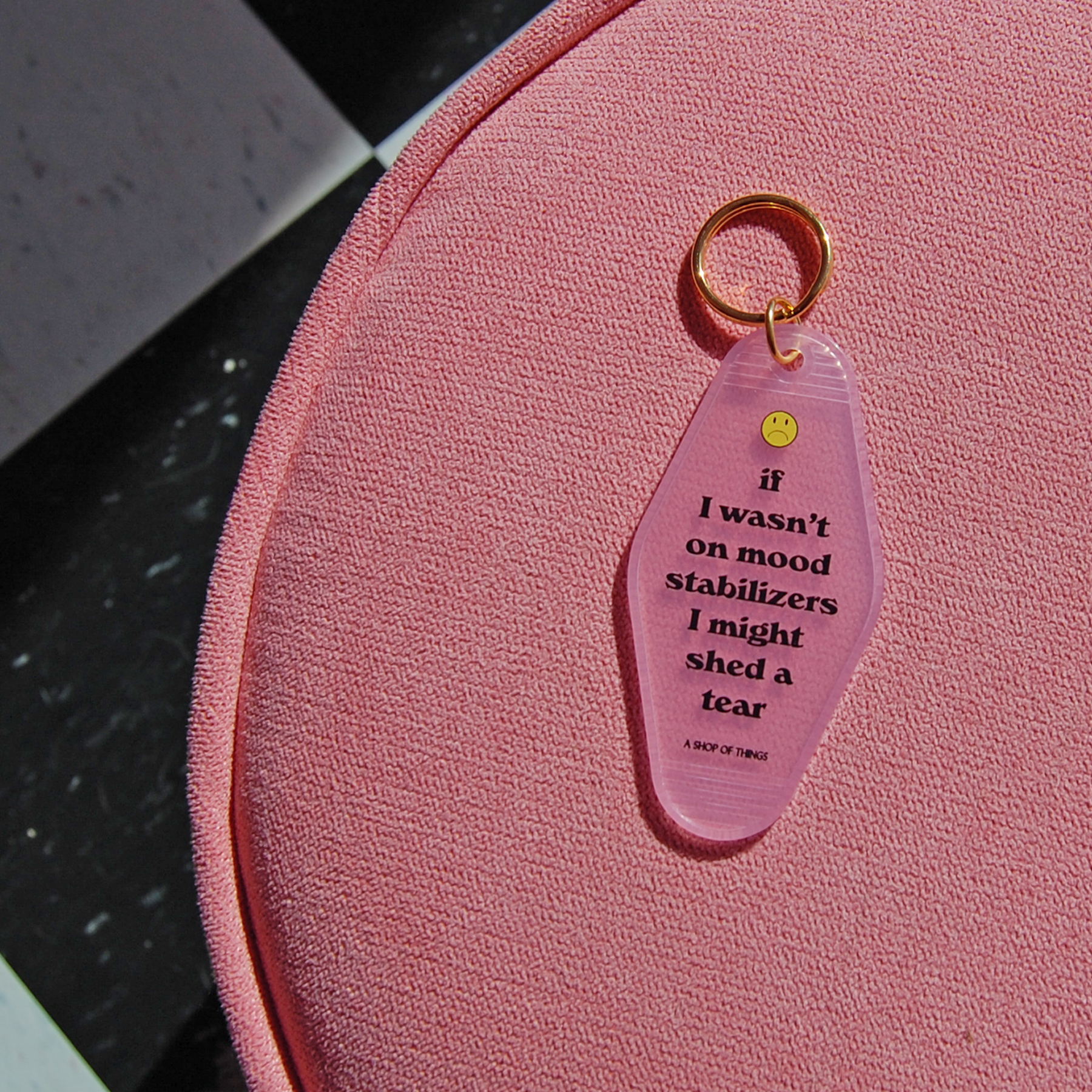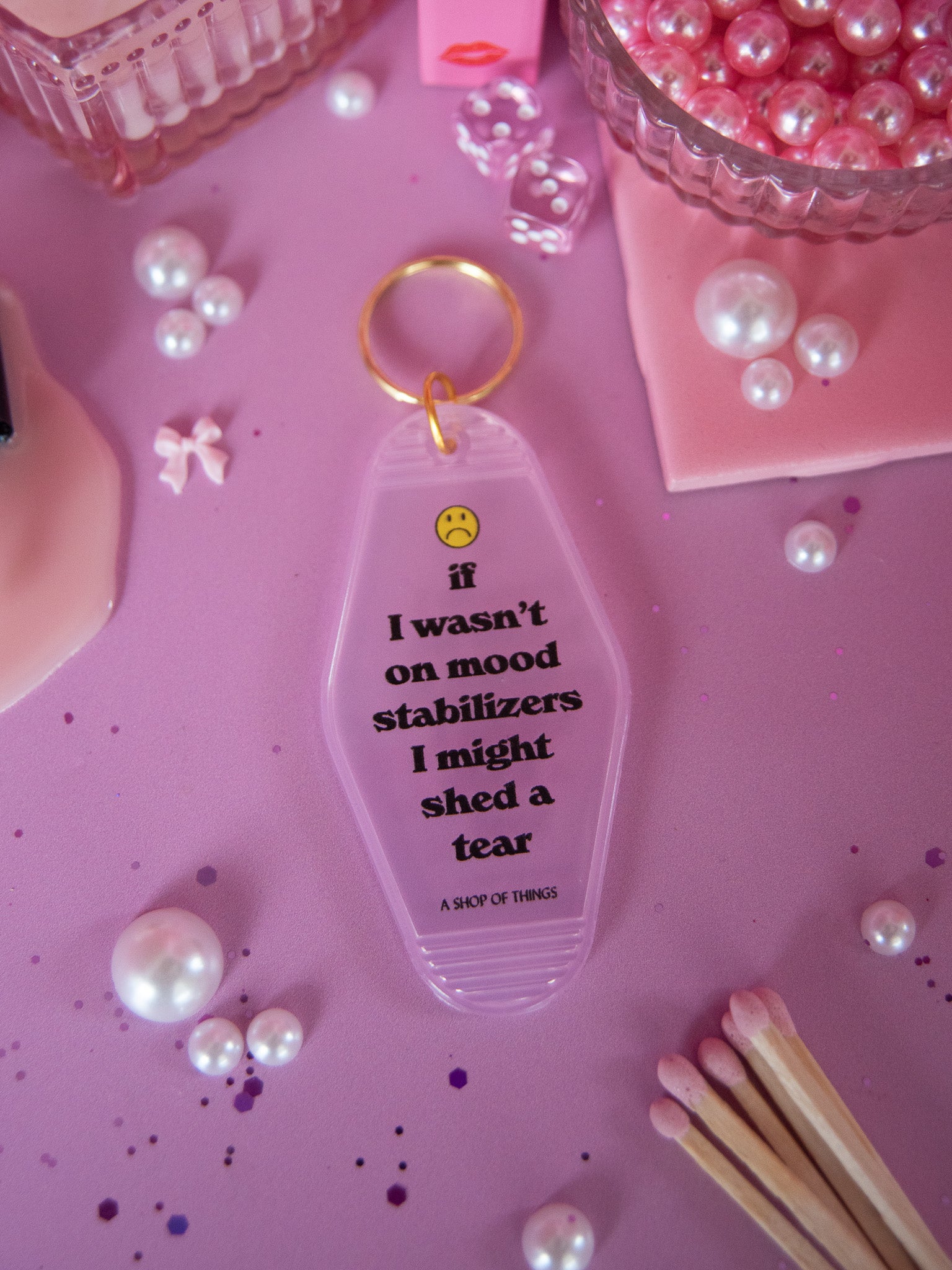 This translucent pink keychain says "if I wasn't on mood stabilizers I might shed a tear"
