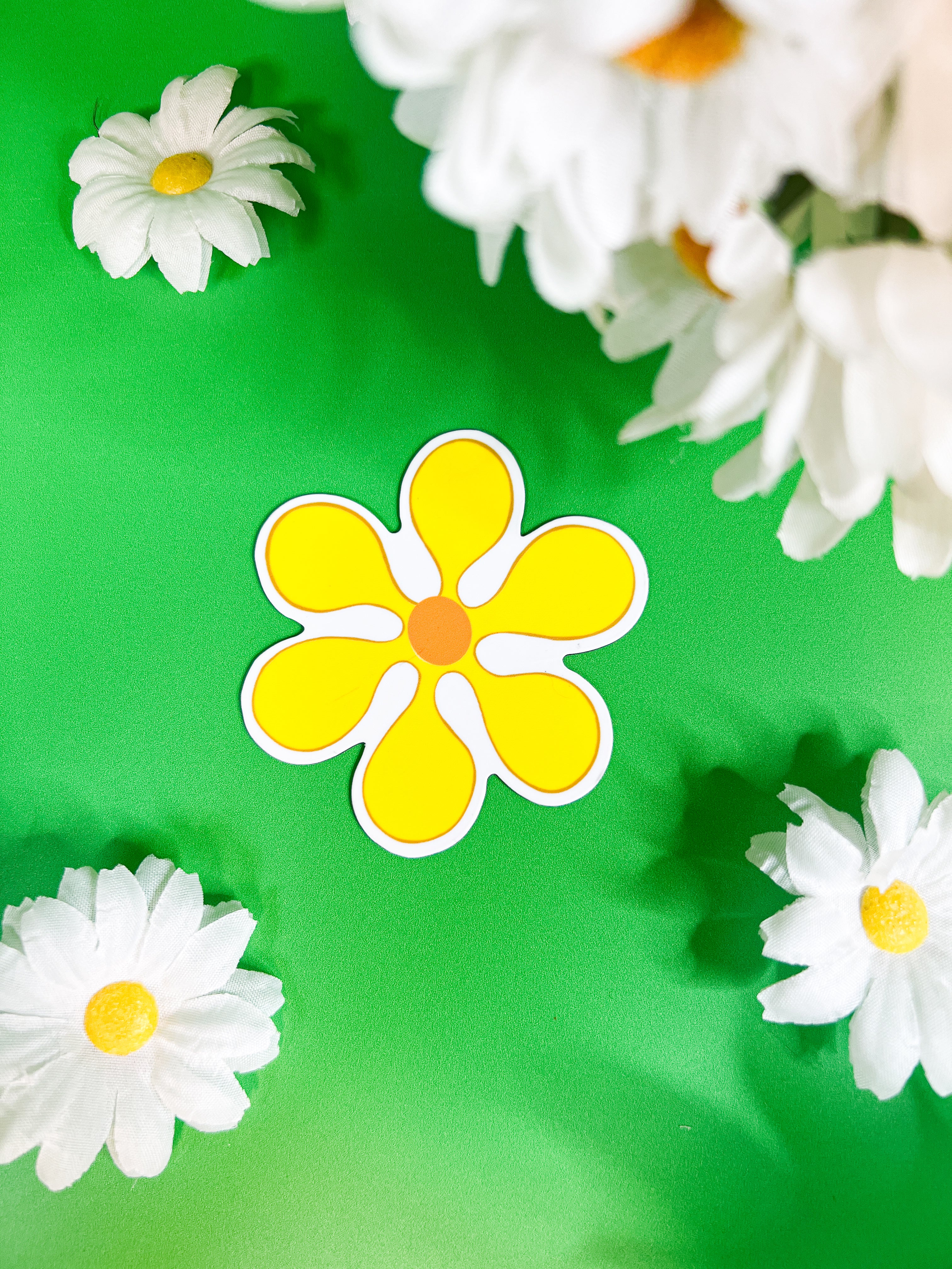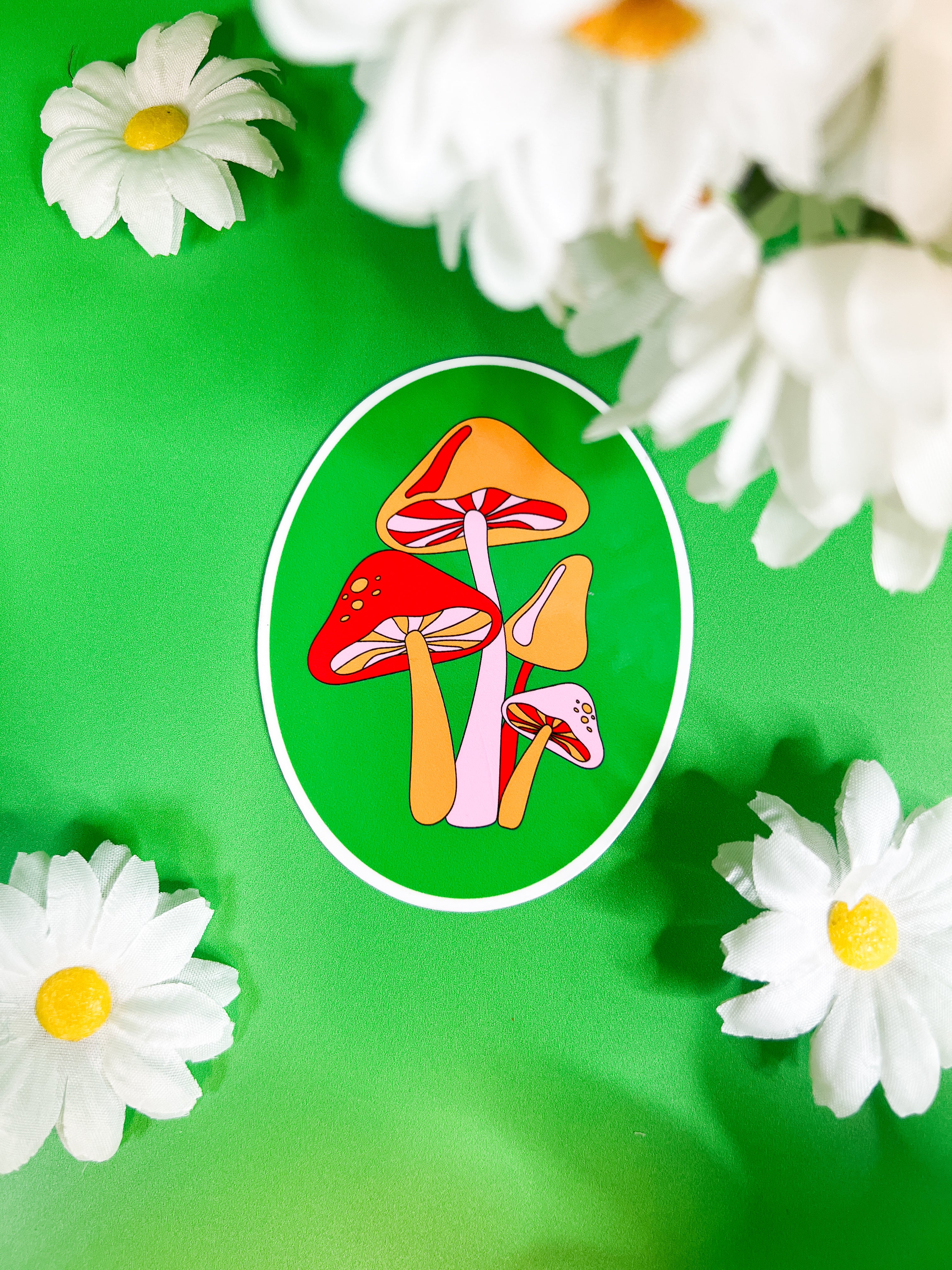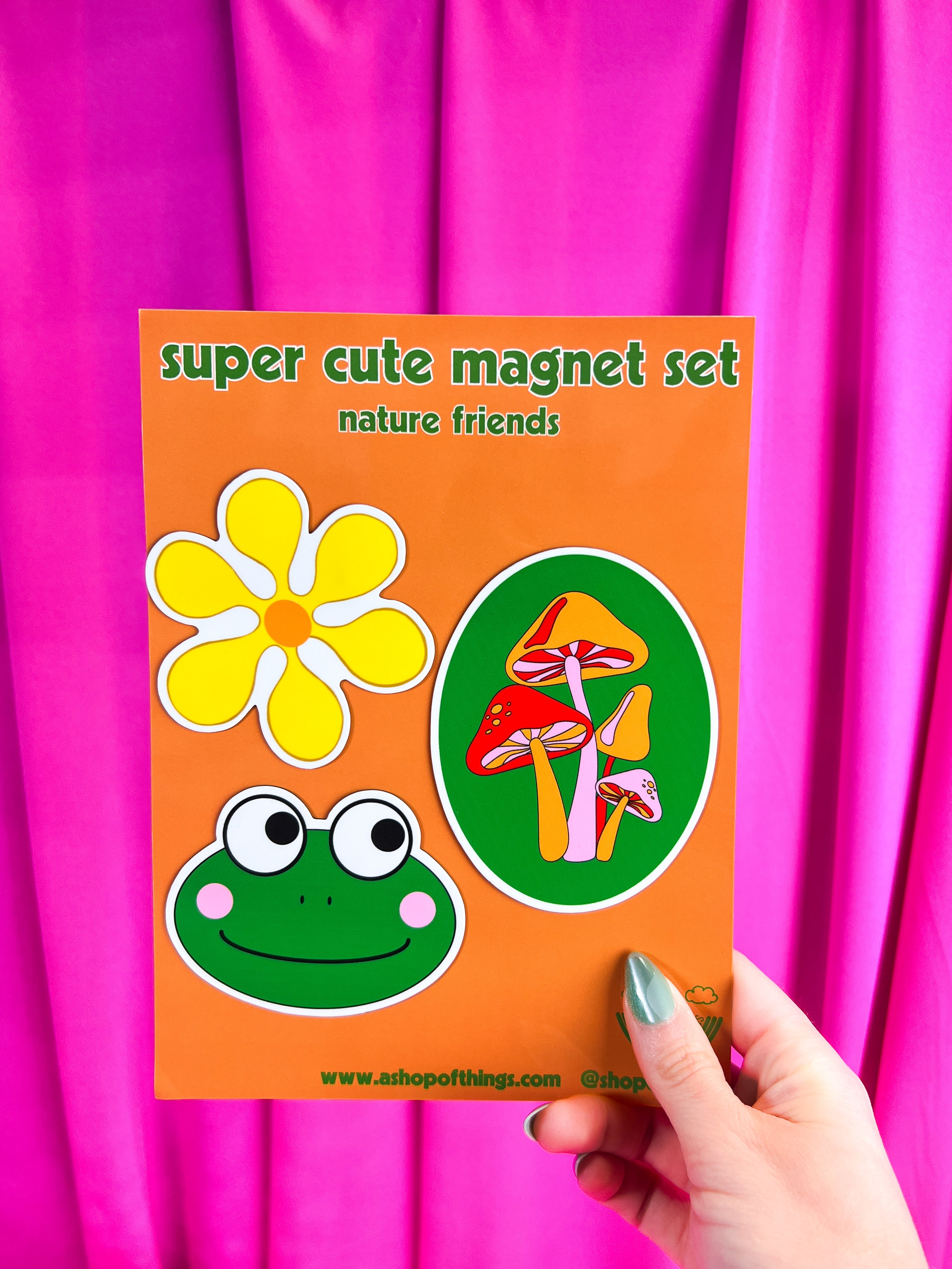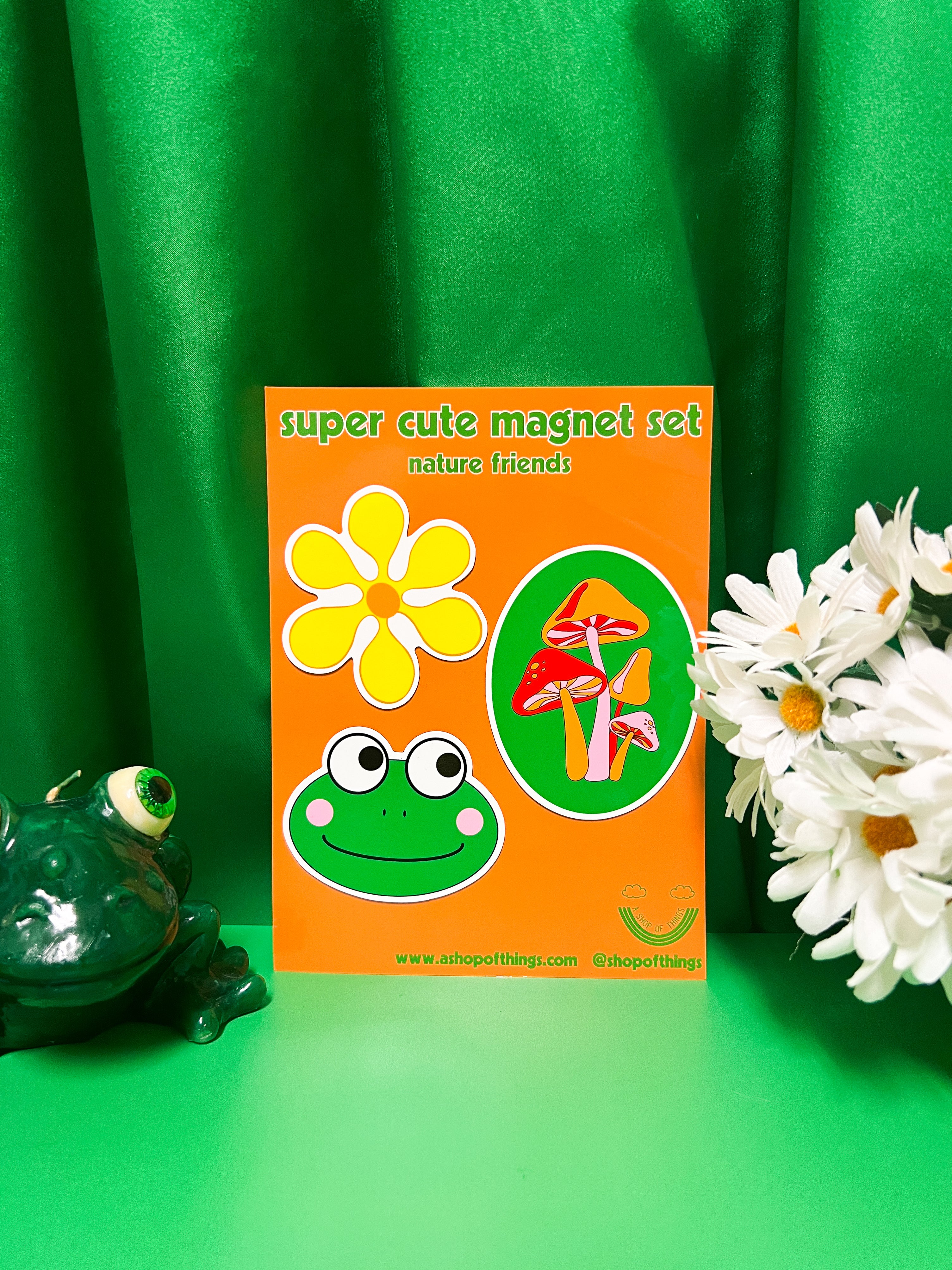 This set includes 3 magnets- a flower, a frog and a mushroom family.