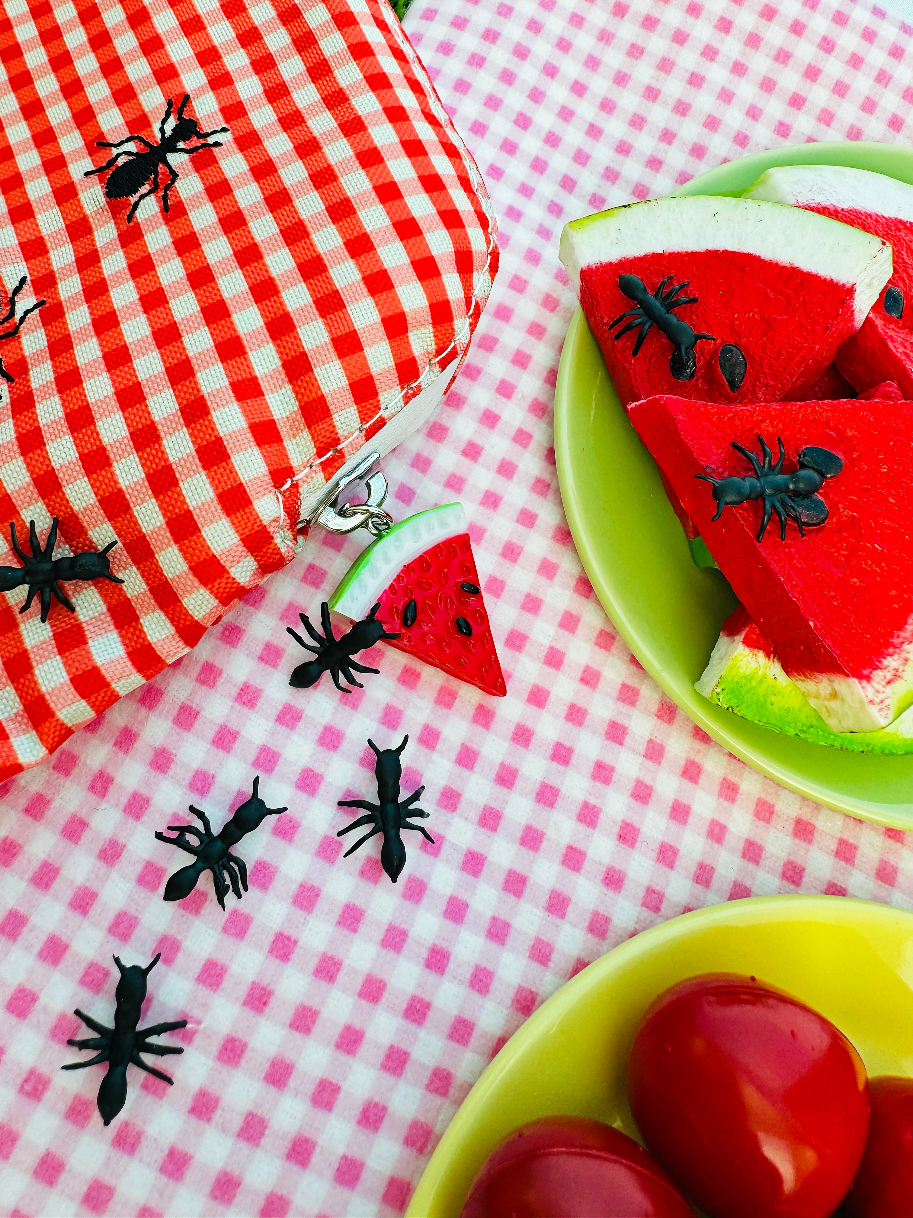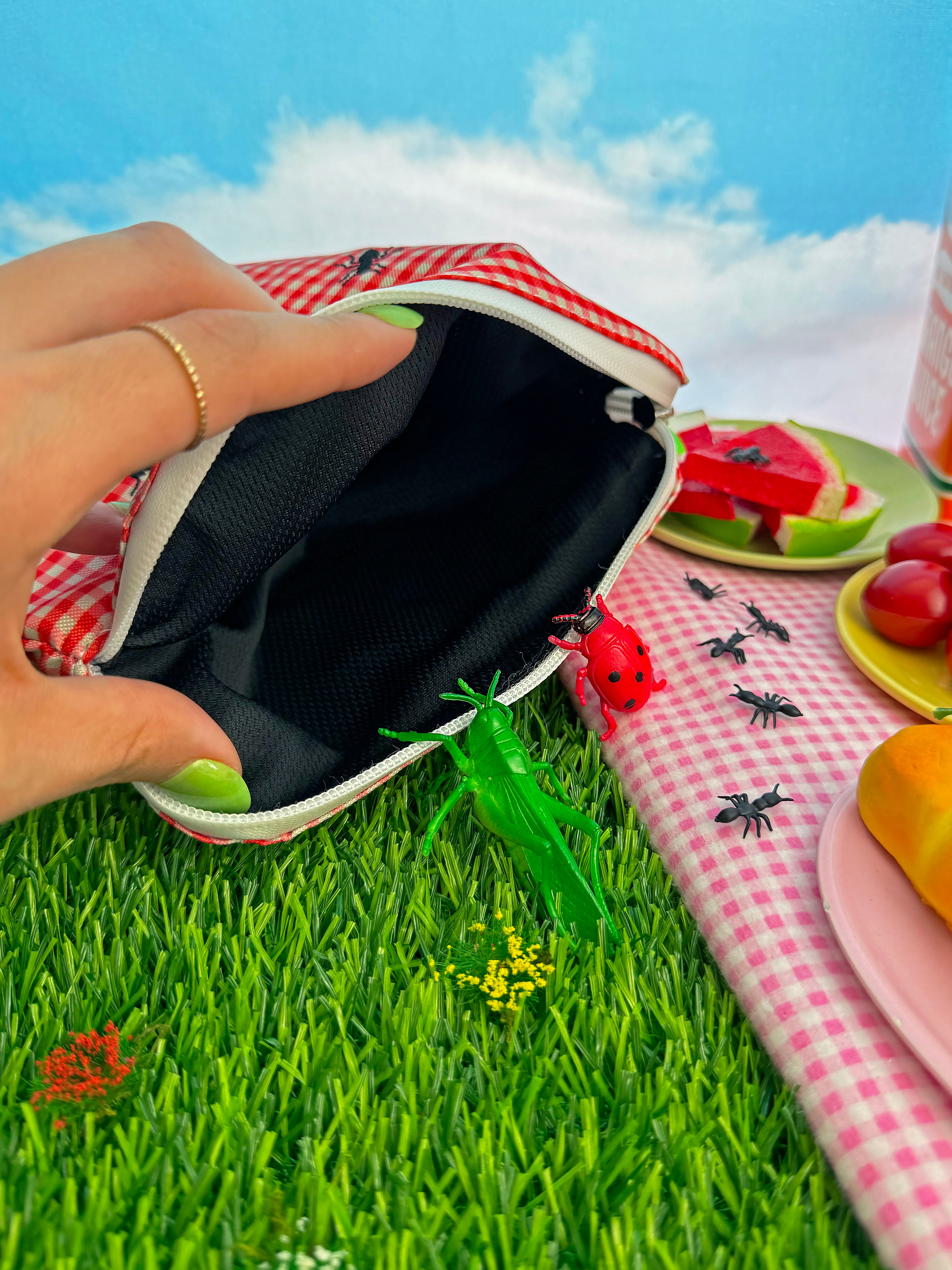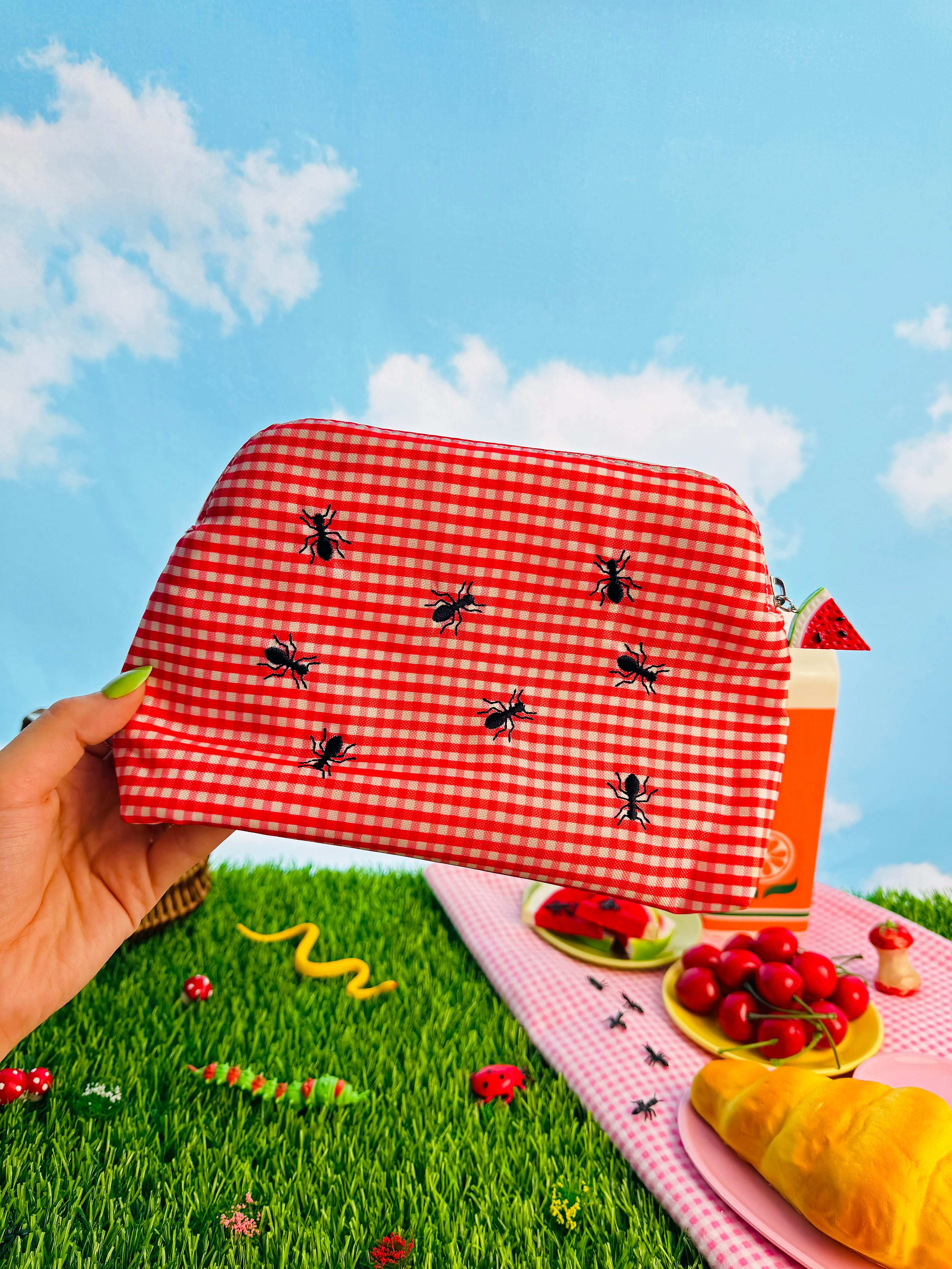 This bag has got it all- it's smell proof and waterproof. Features a gingham print with cute little ants and has a watermelon zipper pull- how freaking adorable?! ππ