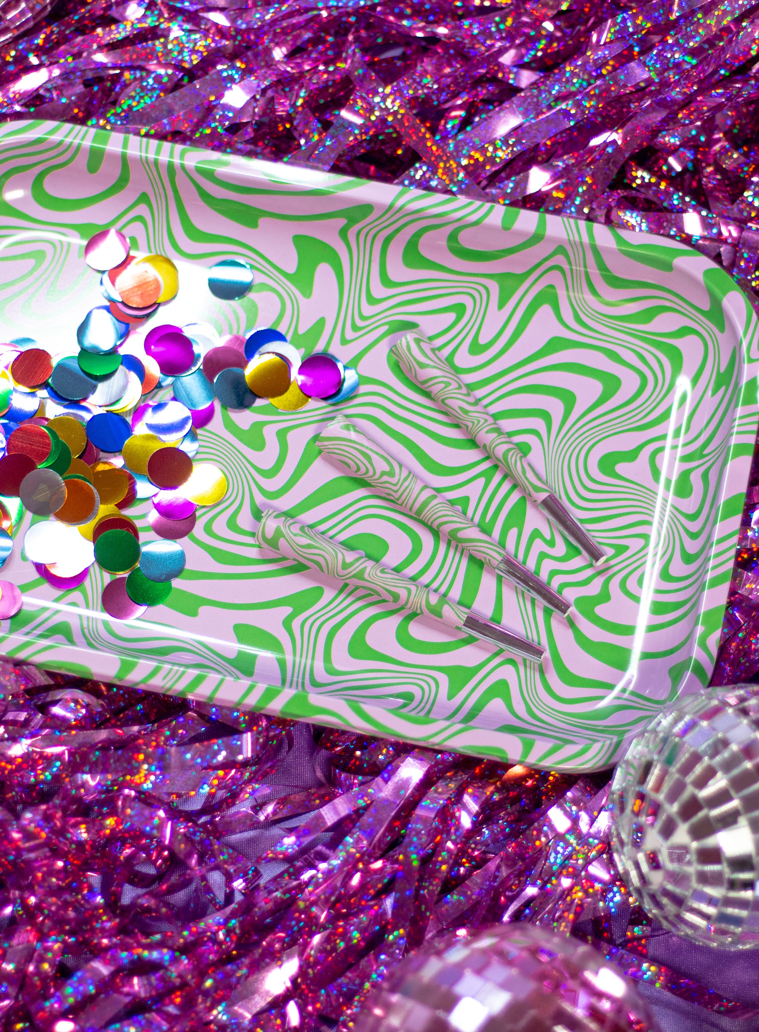 Covered in a trippy swirl, this tray is perf for rolling or as a lil trinket tray around your home.