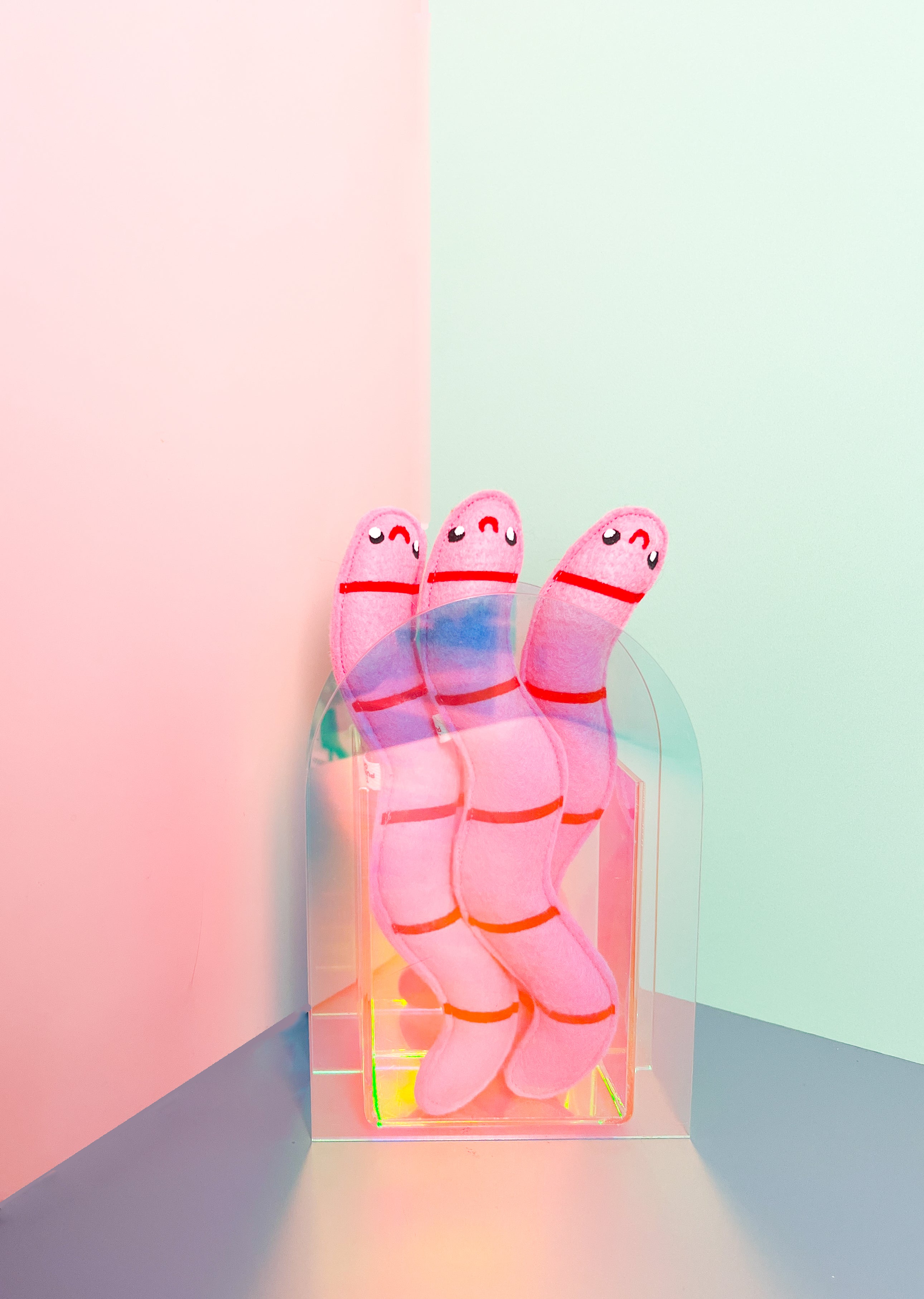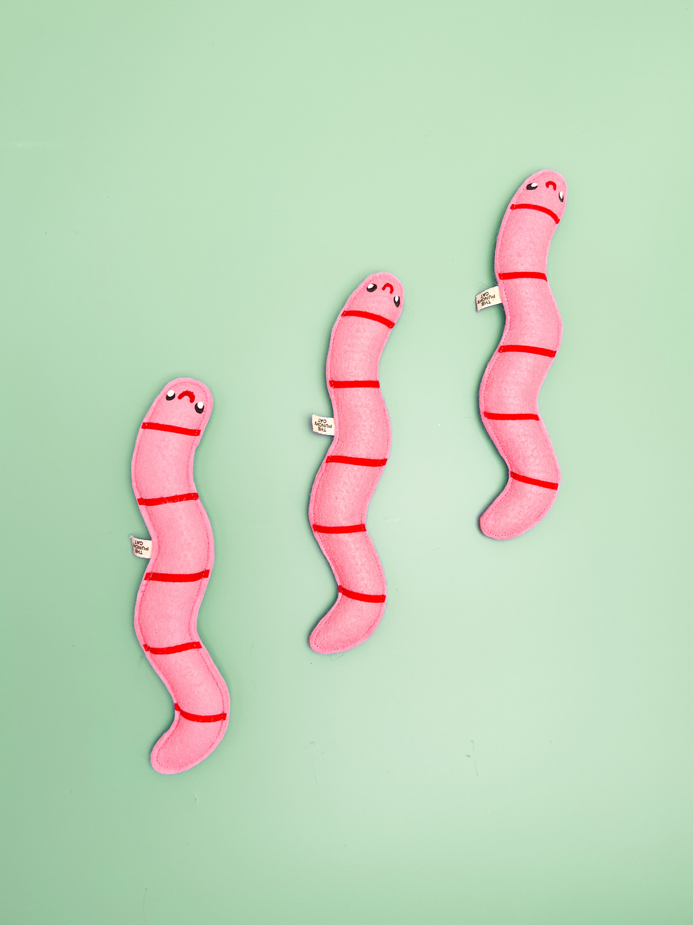 Each worm is one-of-a-kind with variations expected since these are handmade with love by Molly of Punchy Cat Toys in Iowa <3