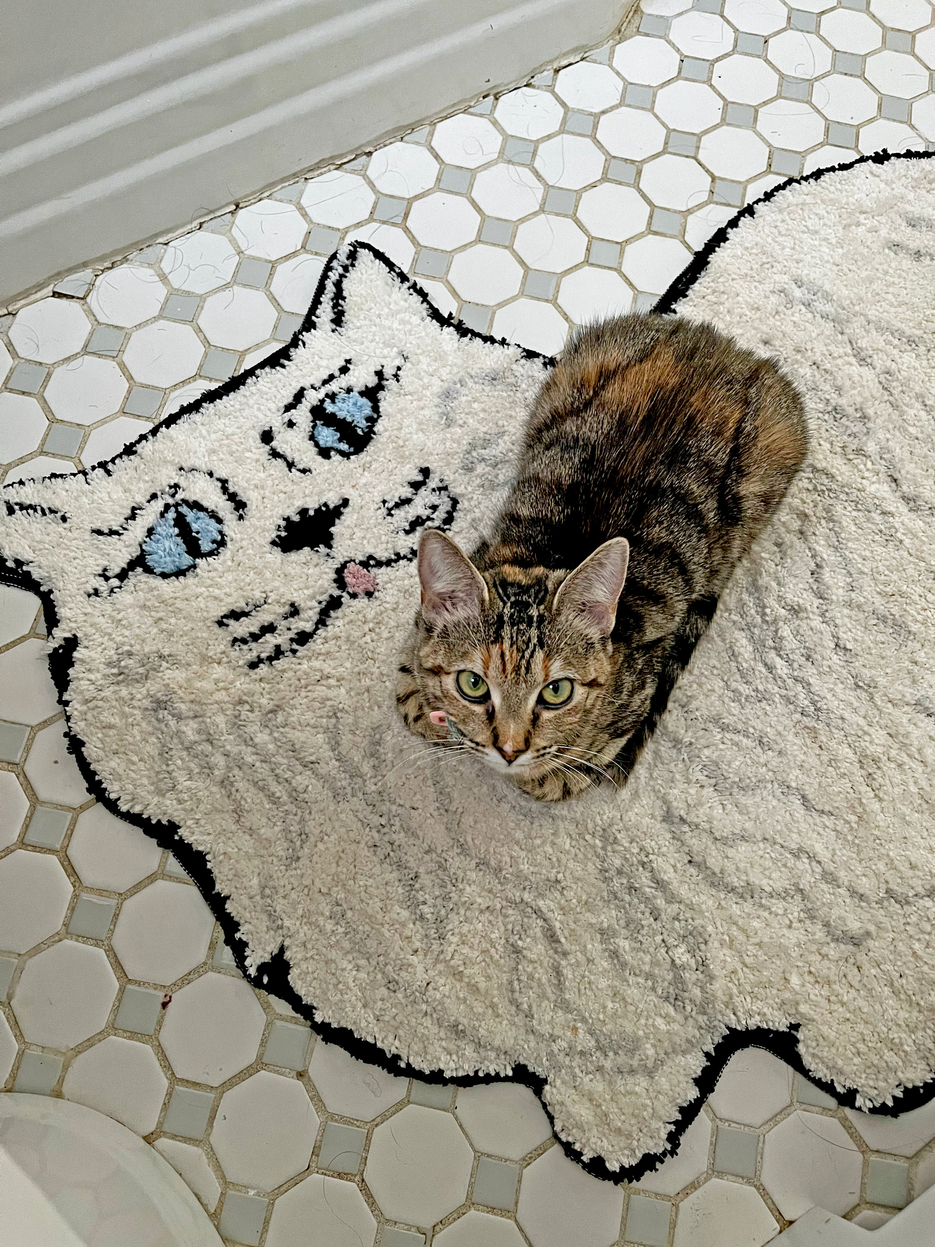 Picked this rug up at an antique mall & i knew i had to have it. It goes so well with my other cat decor. I didn’t expect it to be as soft as it is too!
