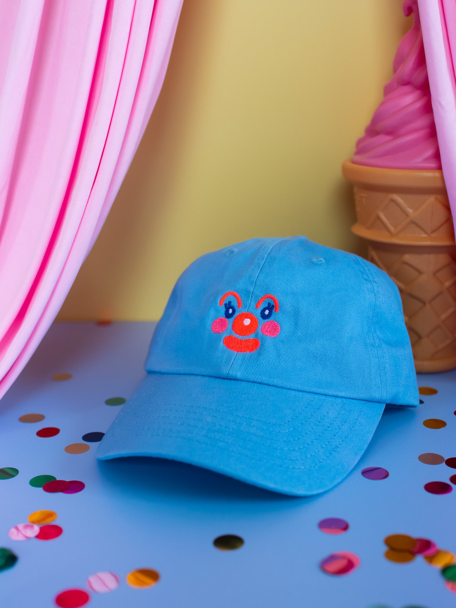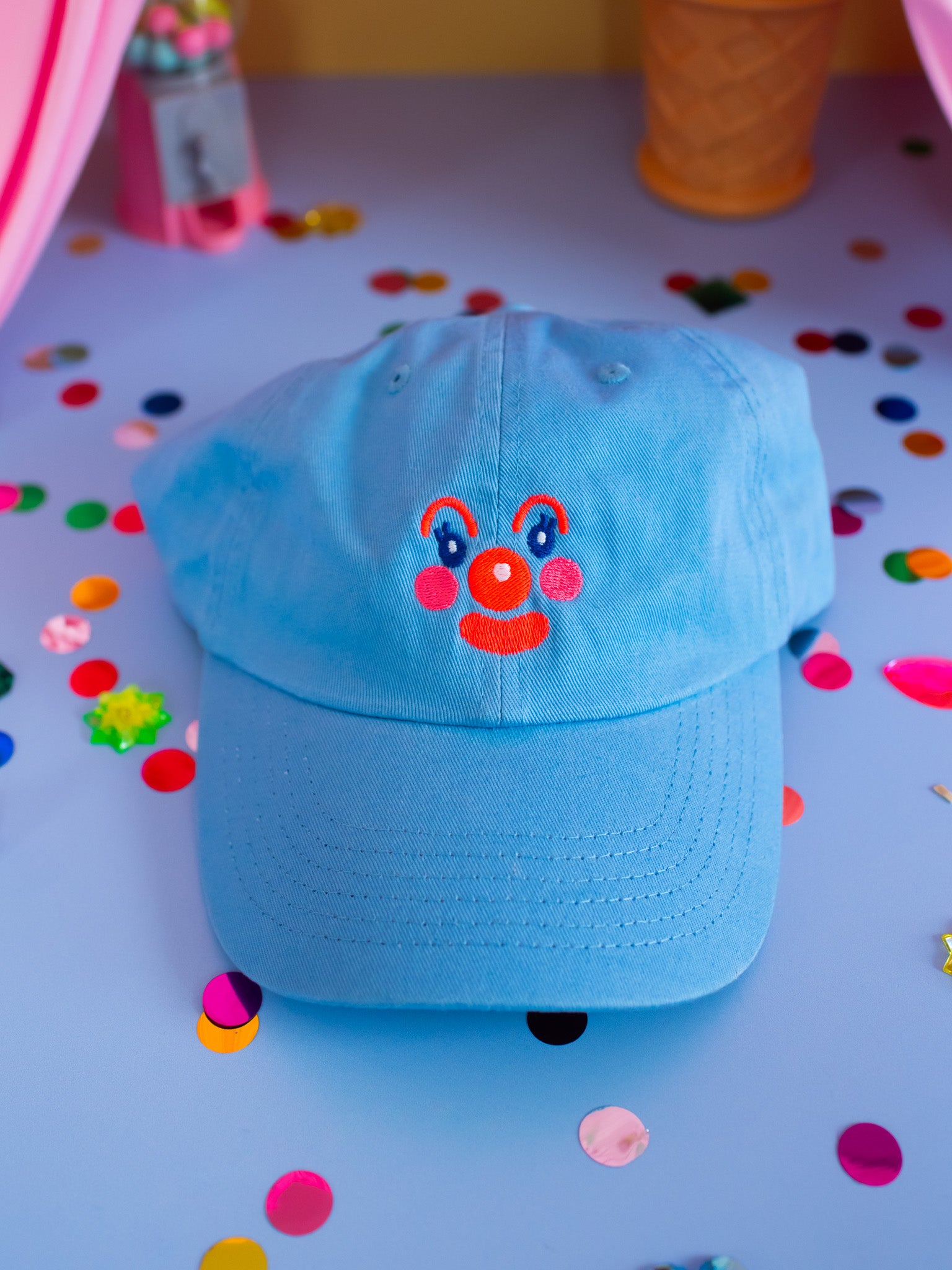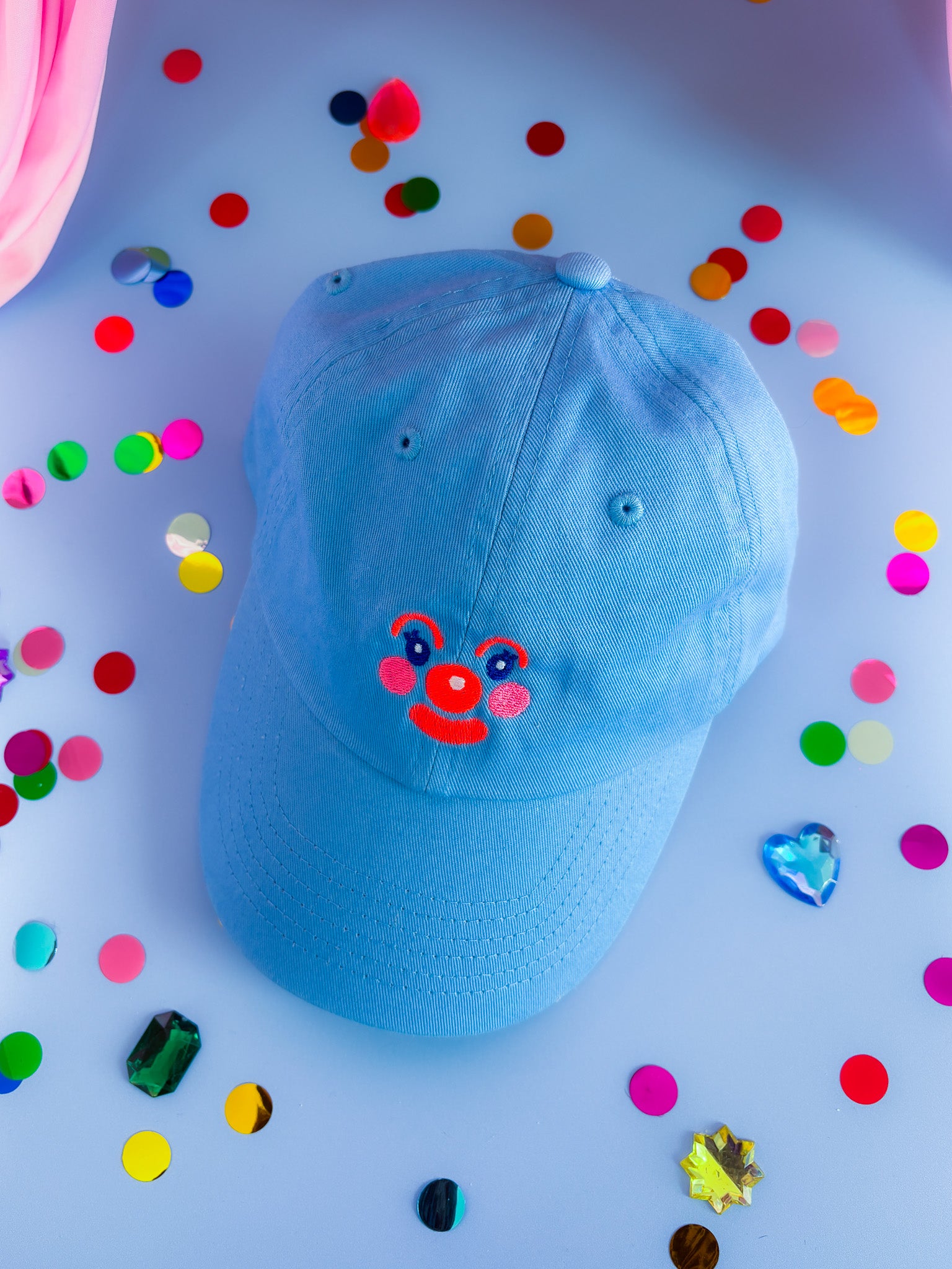 Light blue unstructured, six-panel baseball hat (AKA "dad hat") with super cute and bright clown face embroidery! Pairs great with a silly little outfit and a silly little attitude.
