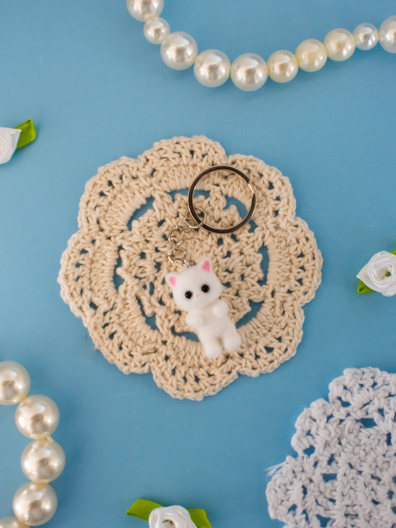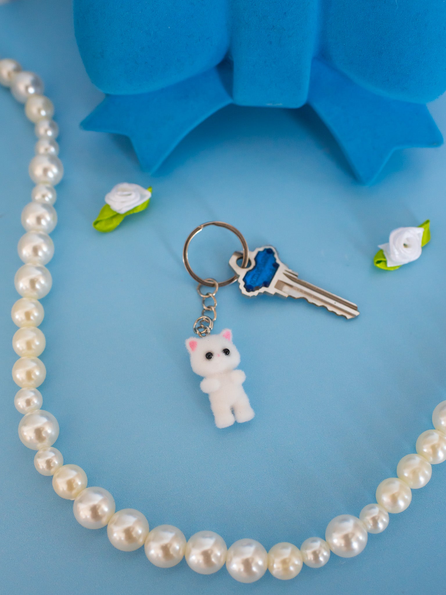 An adorable critter for your keys!! We can't keep these on the shelves in our IRL ASOT shop, so we wanted our long distance friends to be able to get them, too <3 Features one REALLY cute fuzzy white cat on a silver keyring.