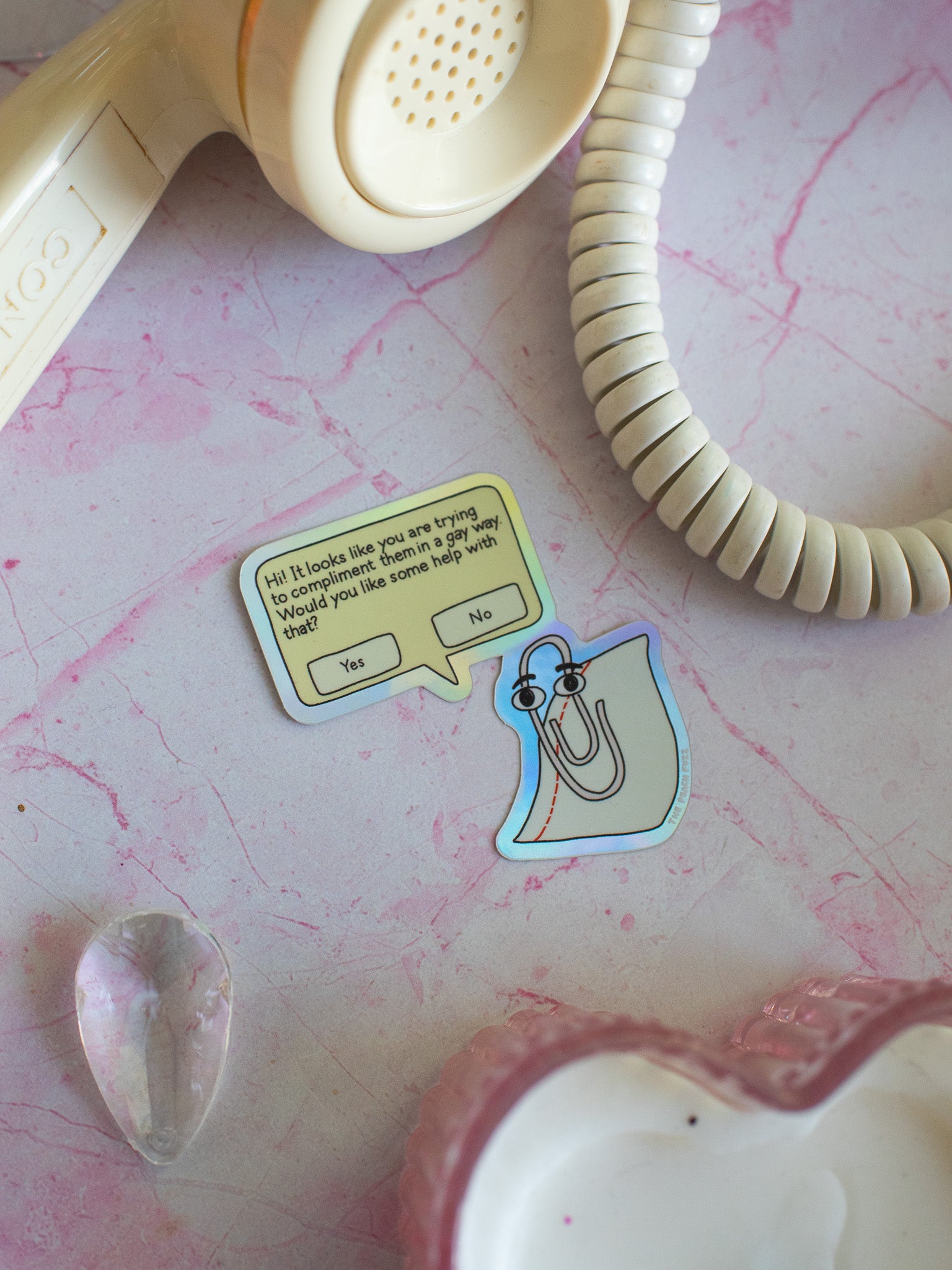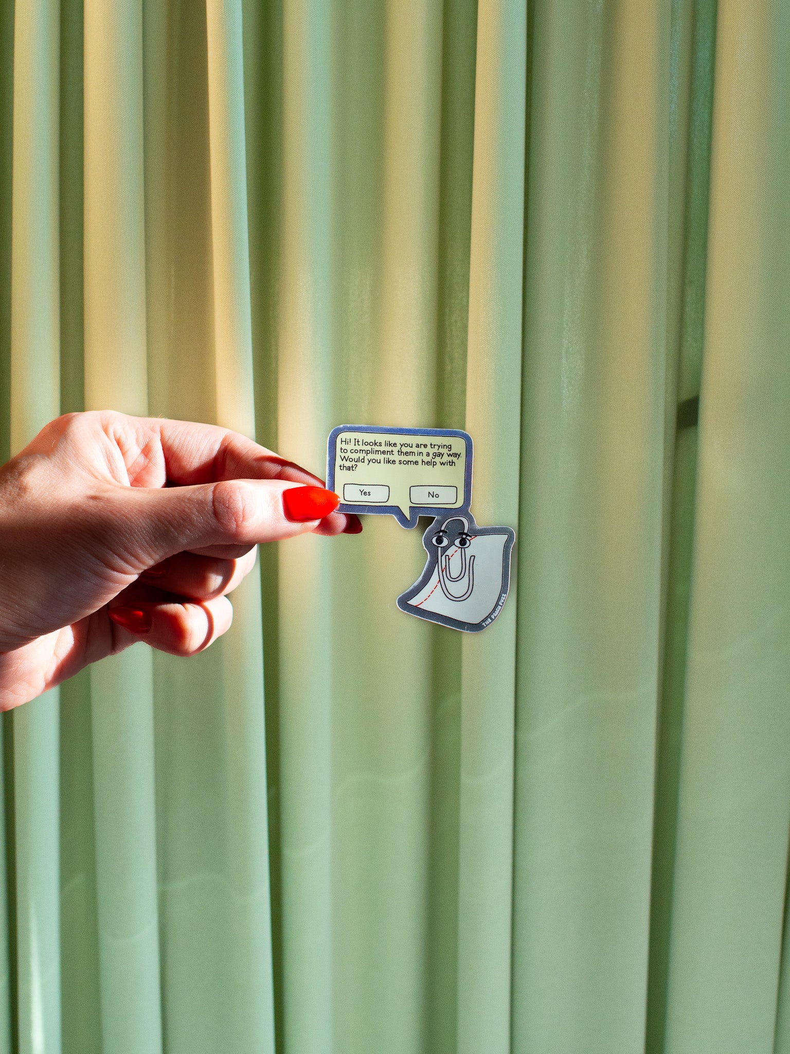This sticker features everyone's favorite computer assistant, Clippy! It reads "Hi! It looks like you are trying to compliment them in a gay way. Would you like some help with that?"