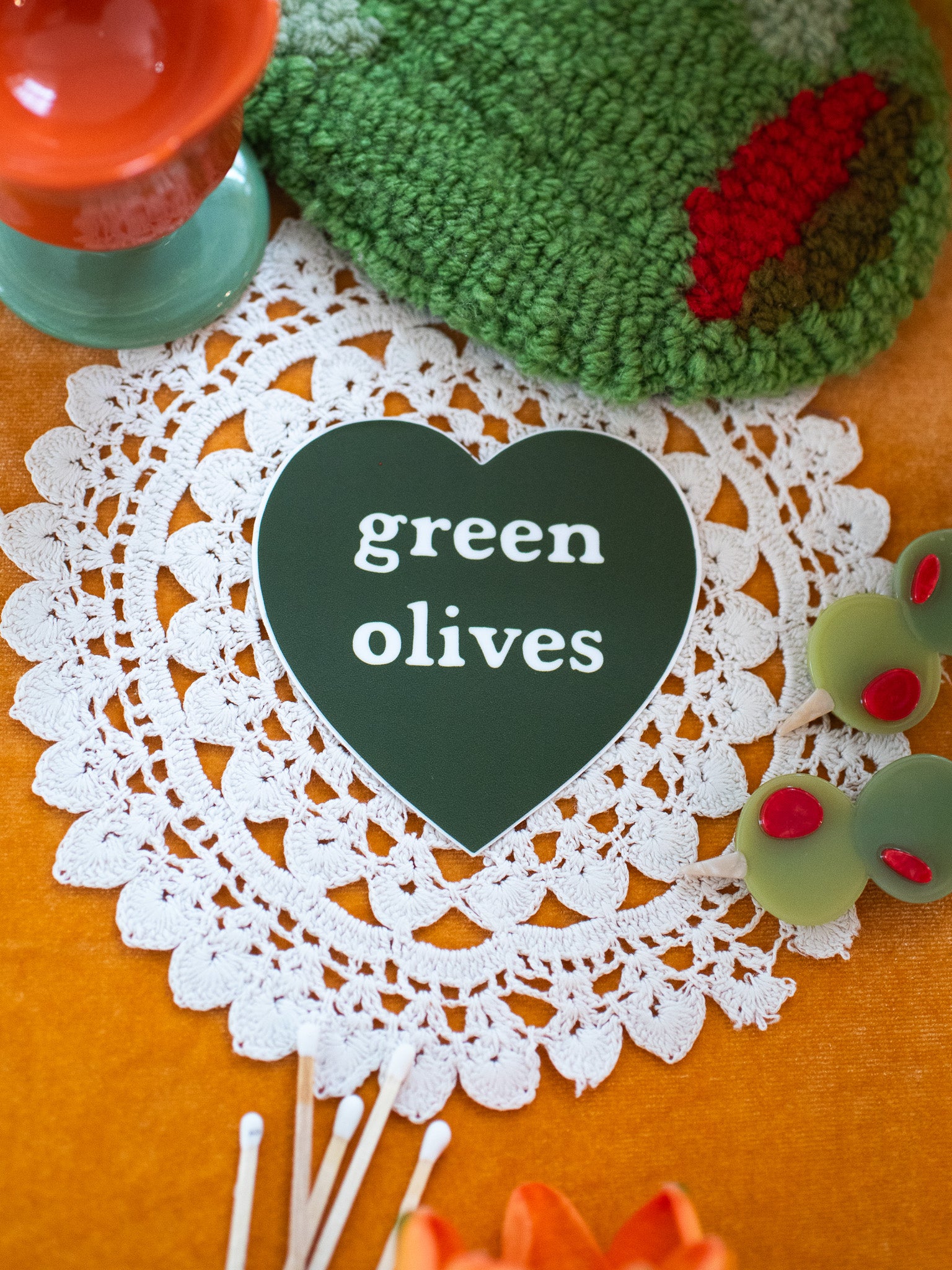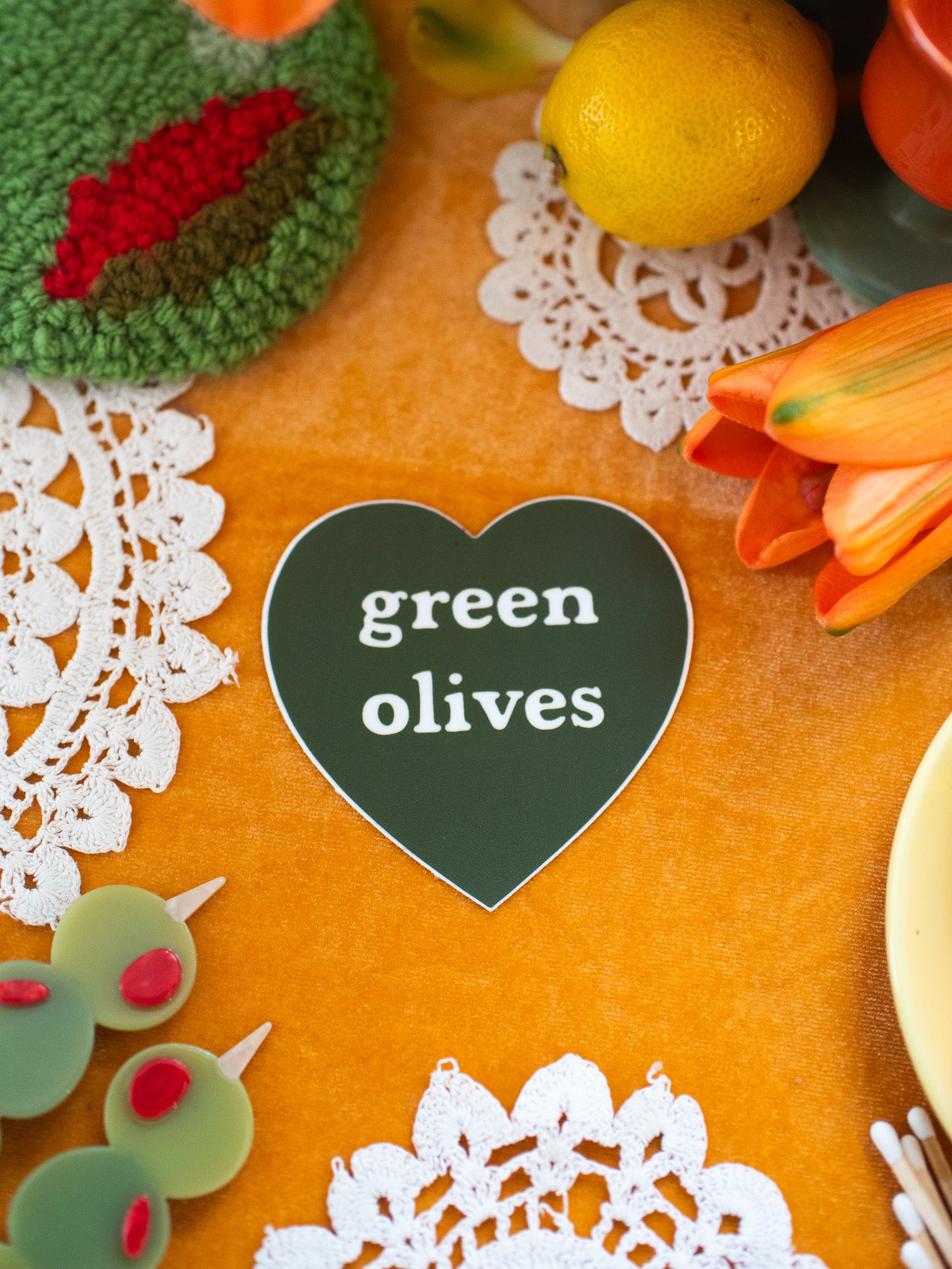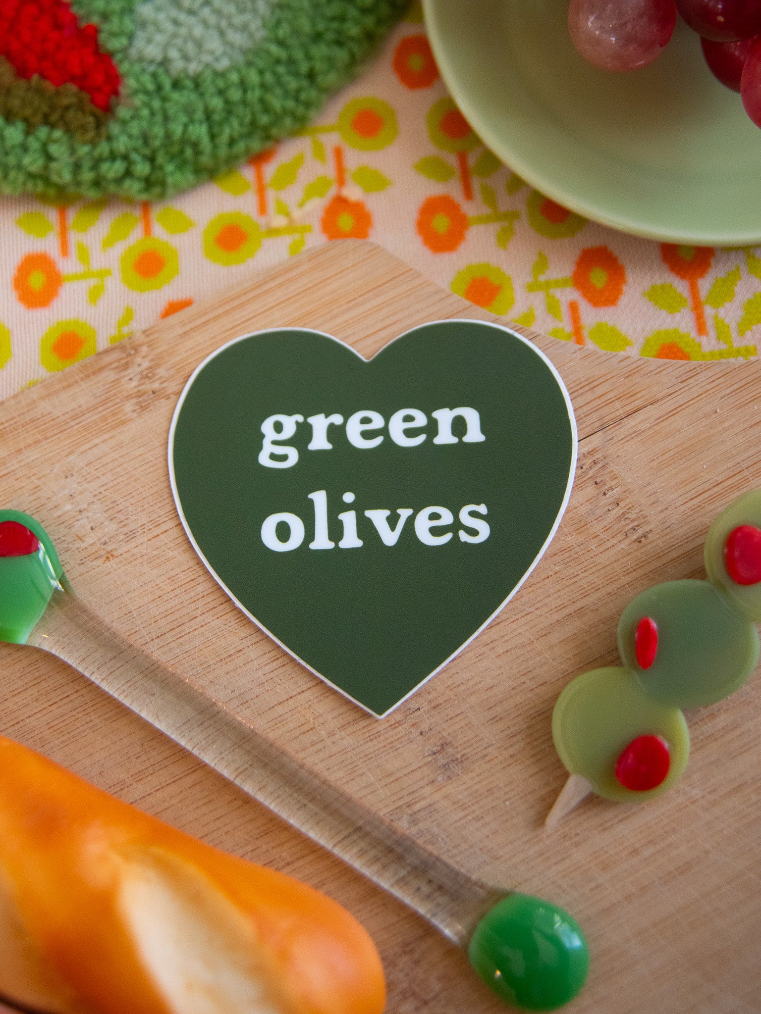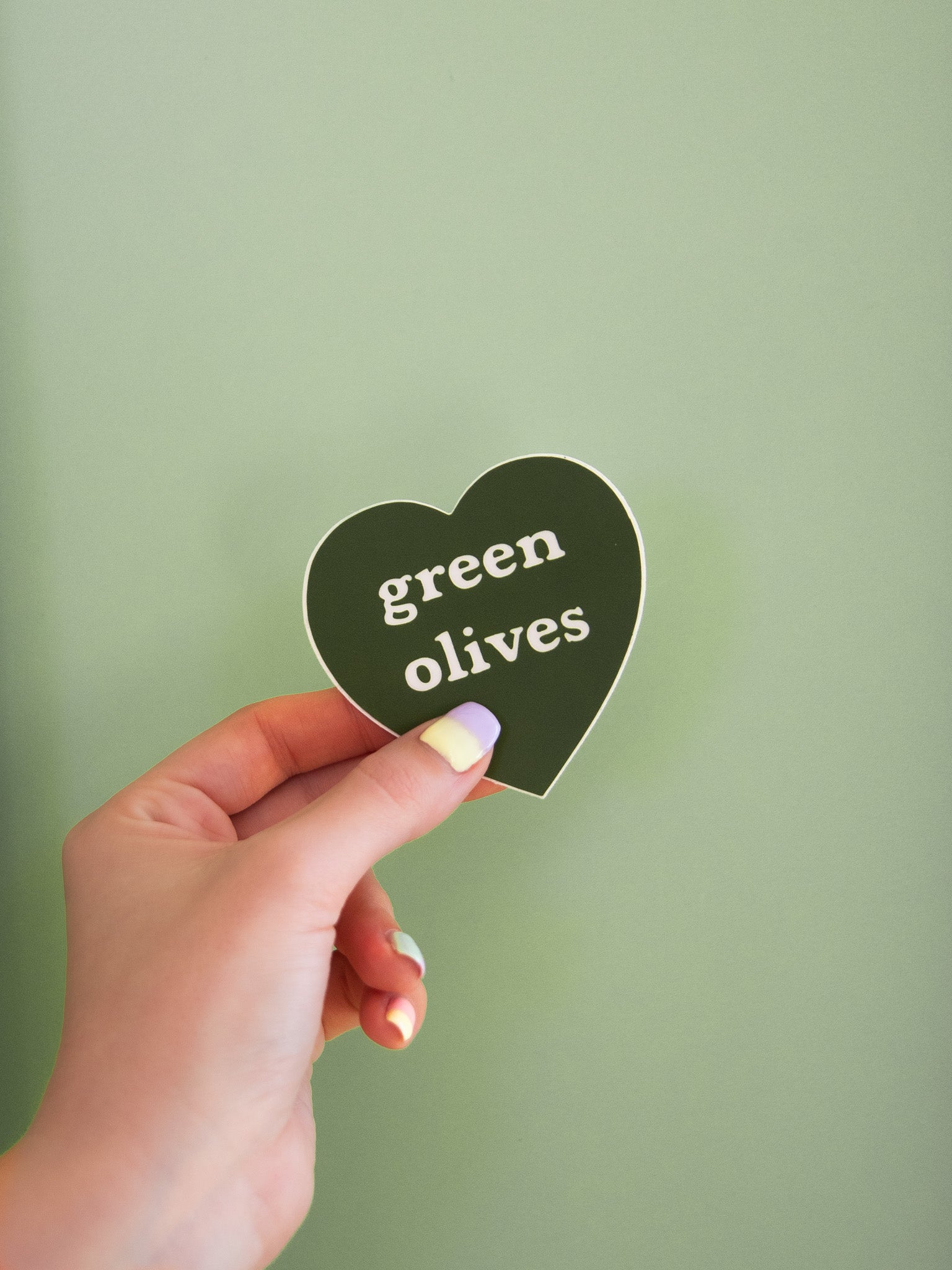 The perfect sticker for the foodie in your life! The cutest olive green heart that reads "green olives" in the center.