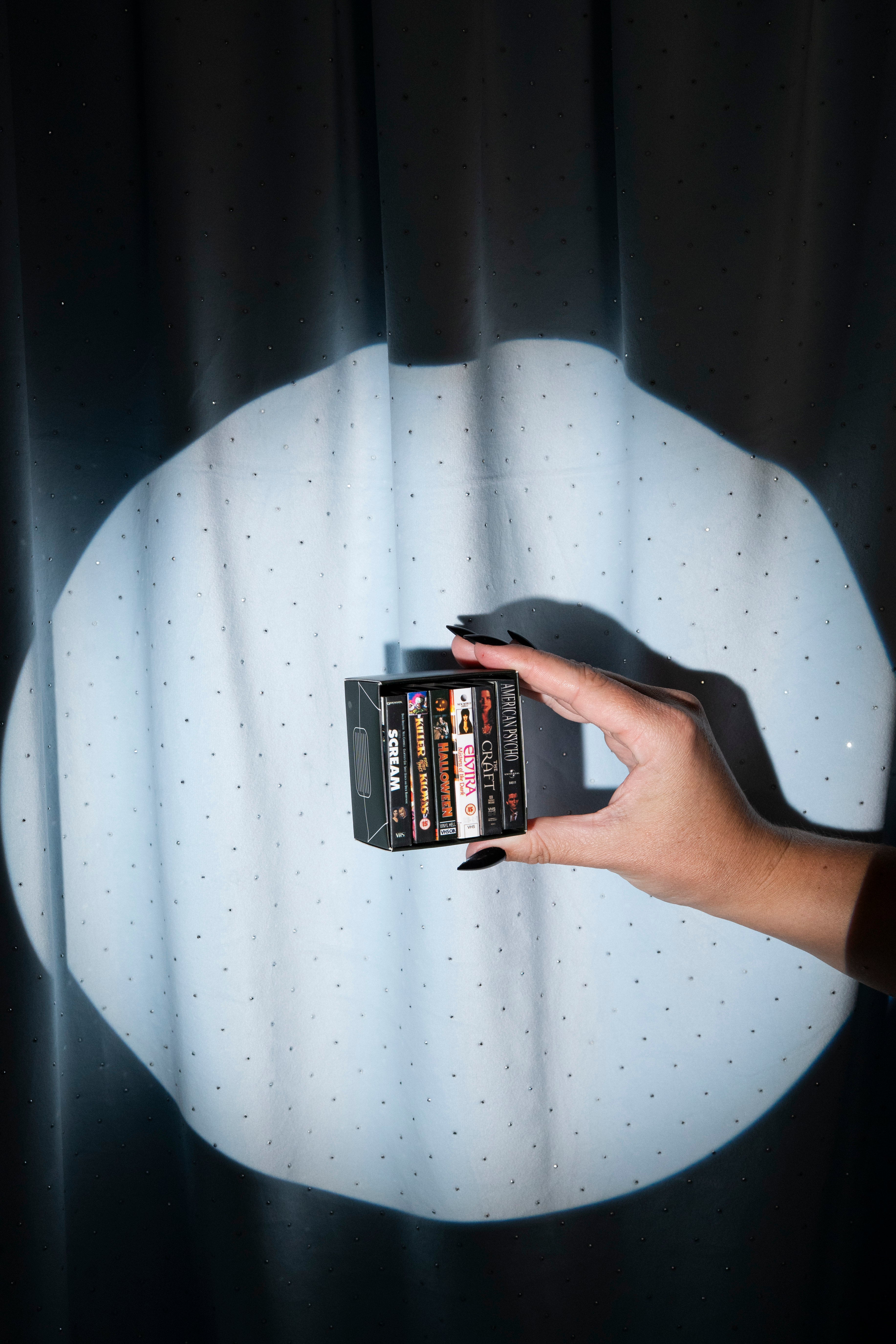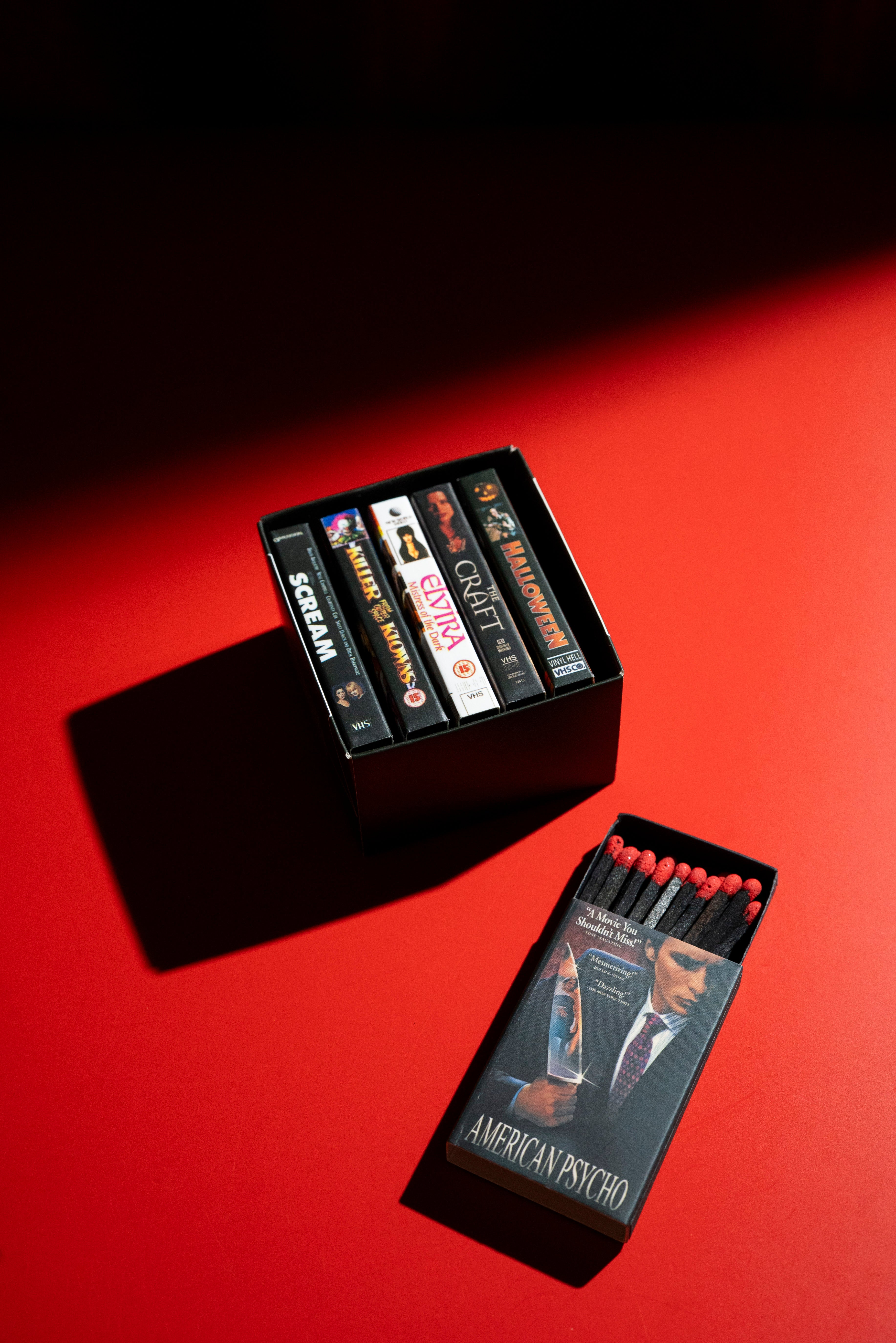 6 unique matchbooks designed to look like classic horror VHS tapes. Each matchbook sits inside a decorative box that looks like a retro TV! Designs include Halloween, Elvira: Mistress of the Dark, Scream, Killer Klowns from Outer Space, The Craft, and American Psycho.