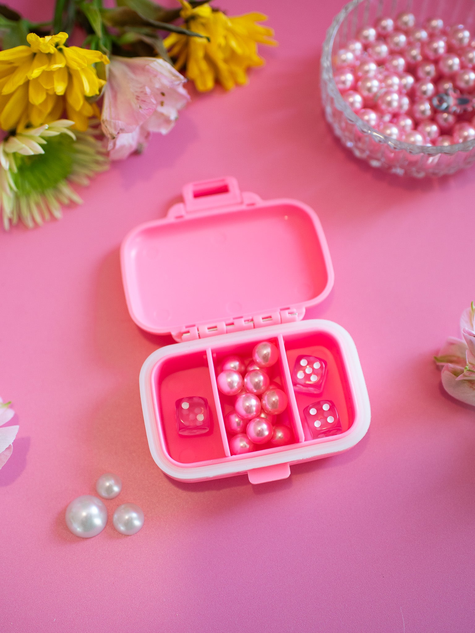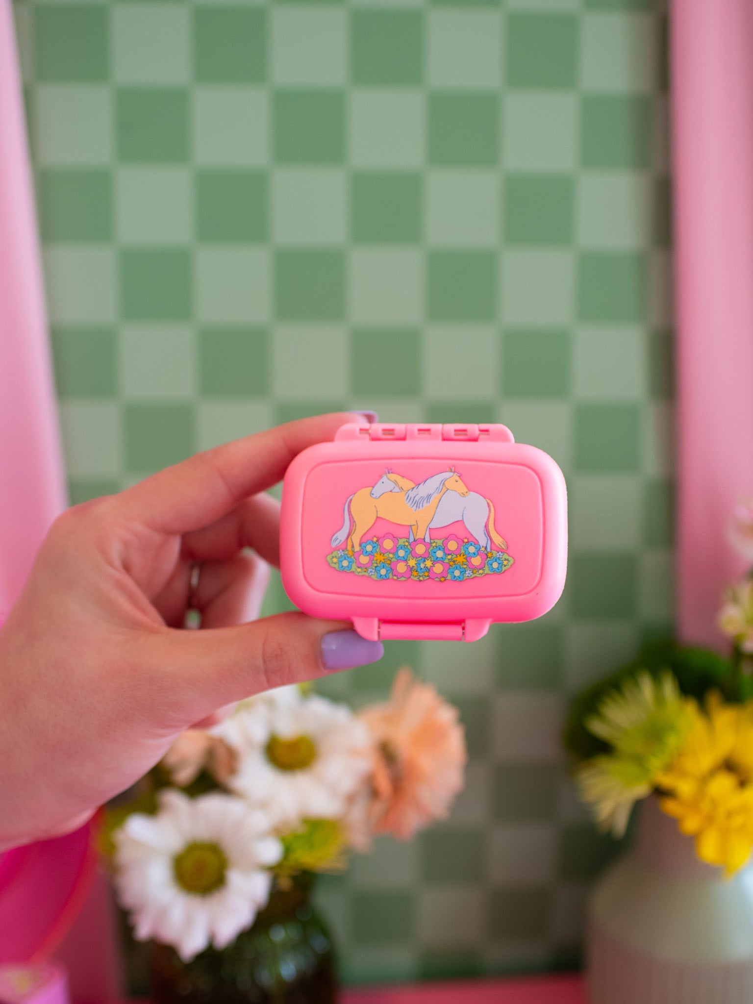 Carry your meds and vitamins in style with this pink pill case that has two convenient, removable dividers on the inside that creates 3 separate compartments. Shaped like an adorable mini suitcase and has the sweetest illustration of two horses in a field of flowers! Water proof + smell proof!