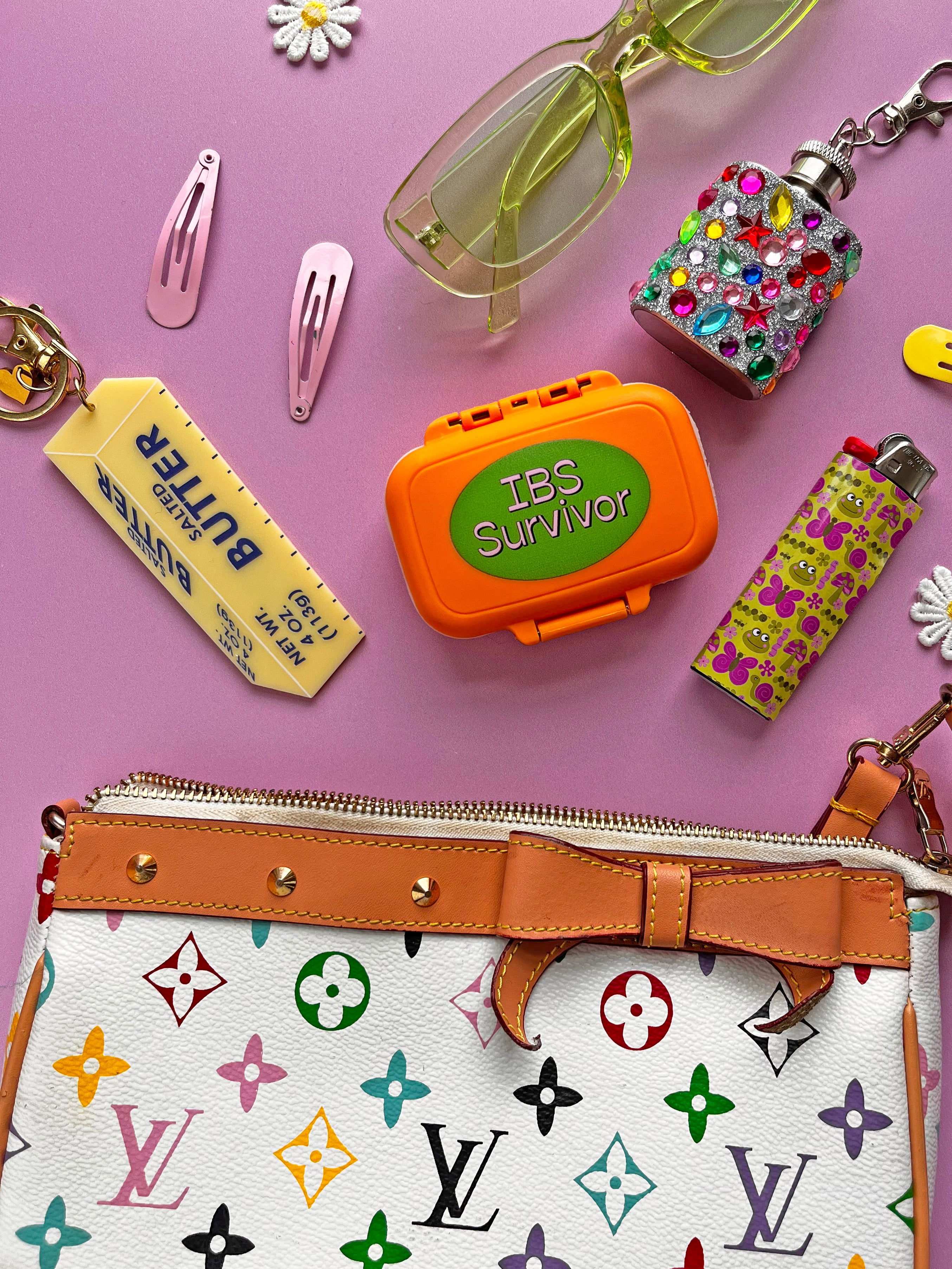 Carry your meds and vitamins in style with this orange pill case that has two convenient, removable dividers on the inside that creates 3 separate compartments . Shaped like an adorable mini suitcase. Water proof + smell proof!