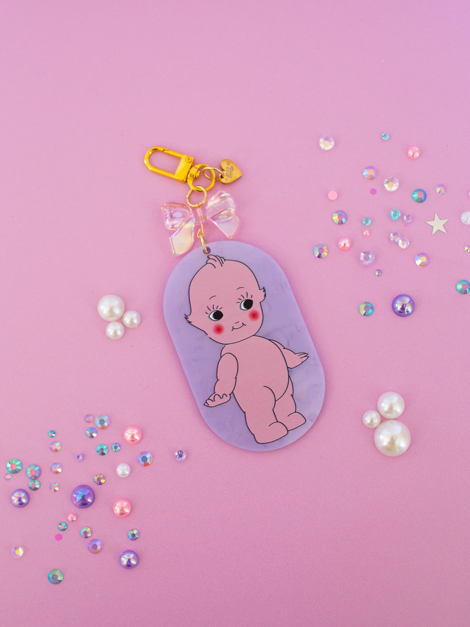 This keychain is made out of purple marbled acetate and printed with a kewpie on both sides. The color of the acetate slightly varies from front to back for a cool effect.