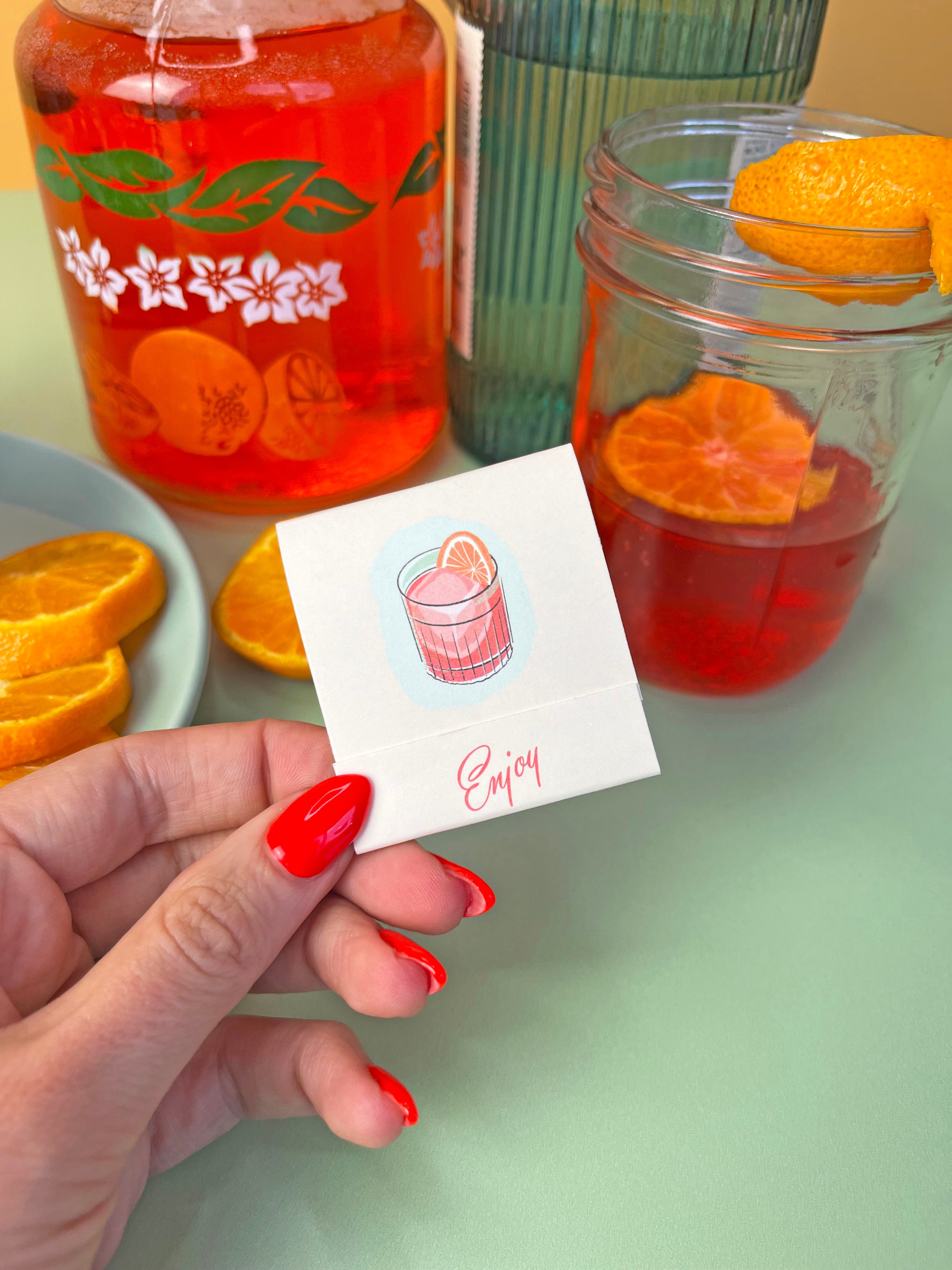 Each matchbook has 10 matches, each printed front and back with an ingredient to make the cocktail. Match heads are custom colored to coordinate with the matchbook.