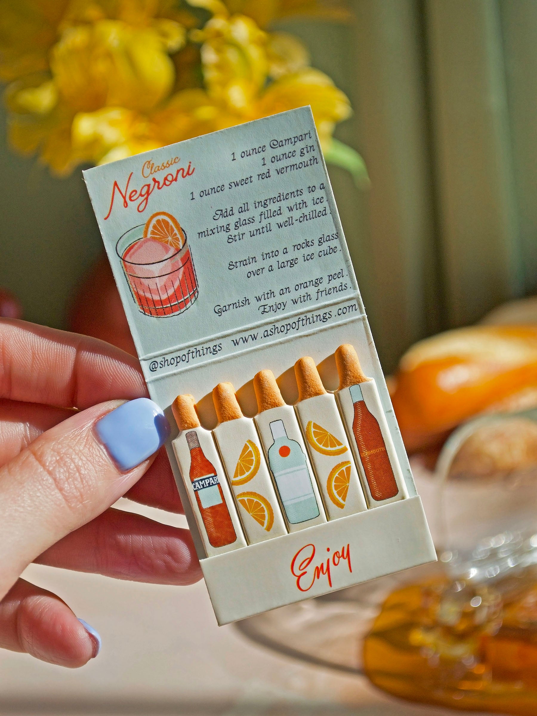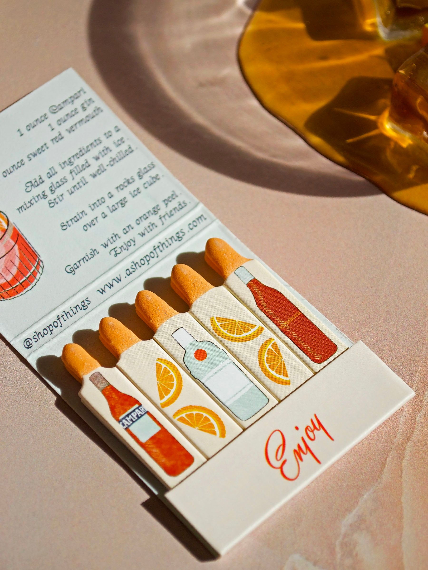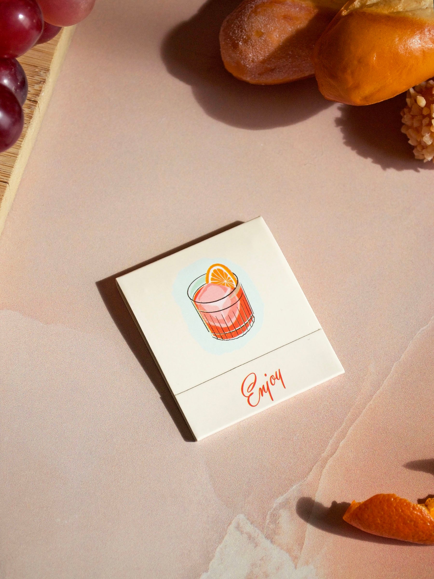 This matchbook features the most refreshing cocktail- a Negroni! The art is done by meeeee! The inside of the matchbook has the recipe for the cocktail and each match features a different ingredient of that cocktail cause we cute like that.