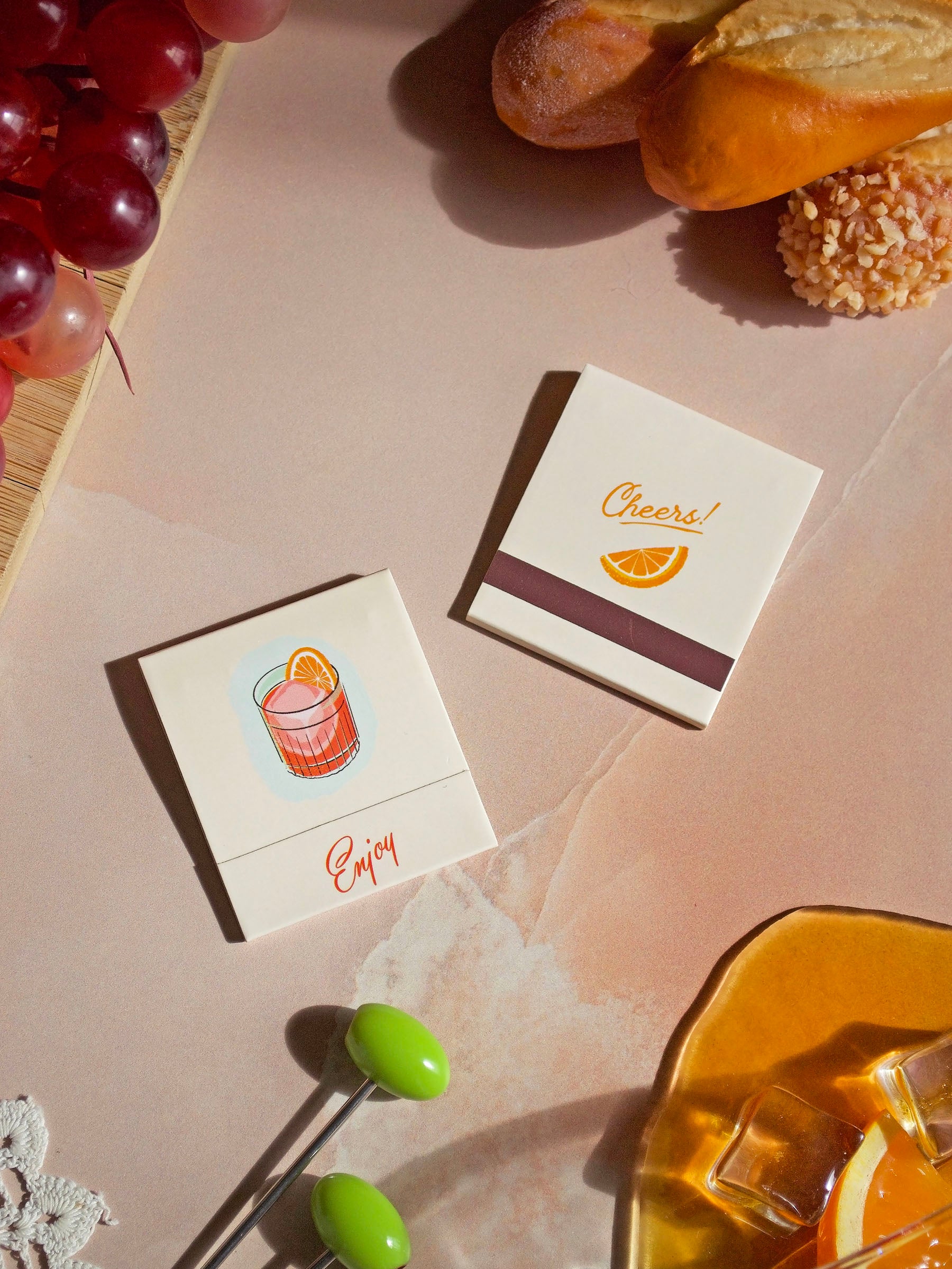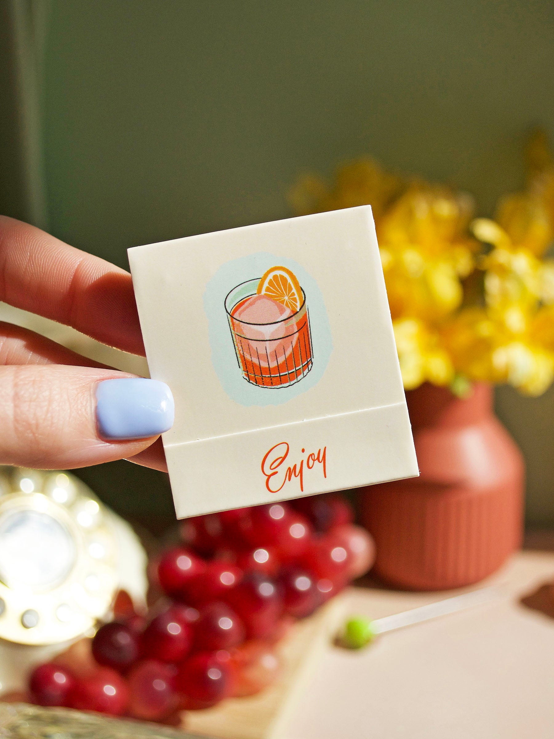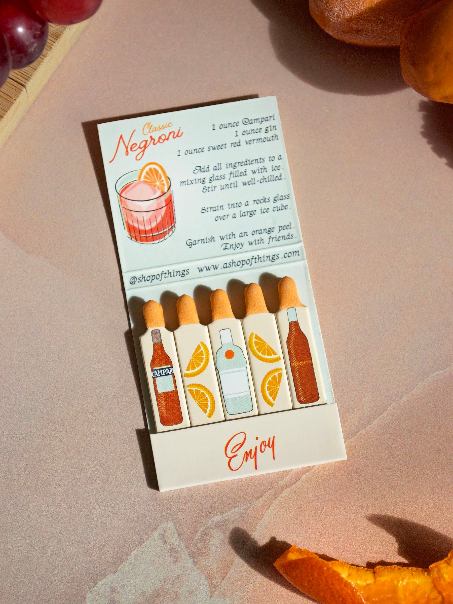 This matchbook features the most refreshing cocktail- a Negroni! The art is done by meeeee! The inside of the matchbook has the recipe for the cocktail and each match features a different ingredient of that cocktail cause we cute like that.