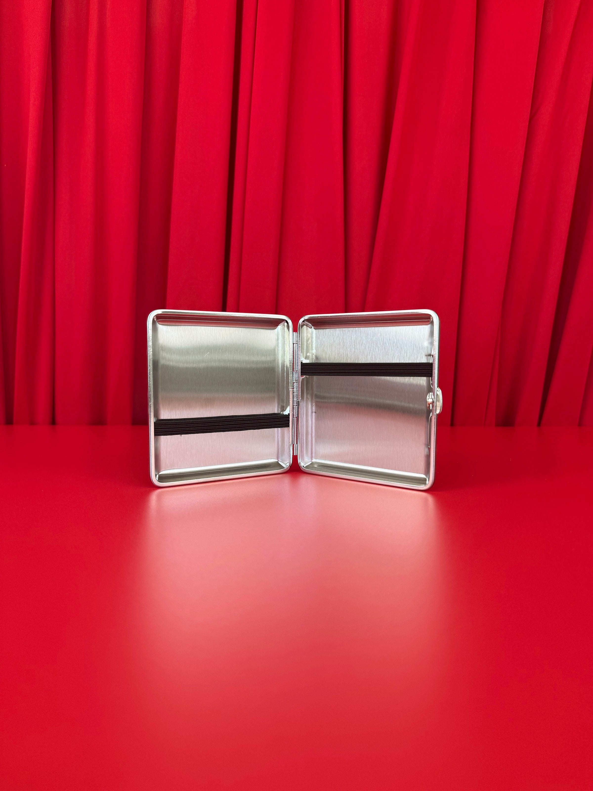 This Nosferatu inspired case features Count Orlok looming over a sleeping Ellen on one side, and her terrified reflection catching sight of him on the other. Perf for holding cigs or prerolls and is slim+discreet enough to toss it in your bag without worry. Also works great for cash, cards, lip gloss, whatever else fits!