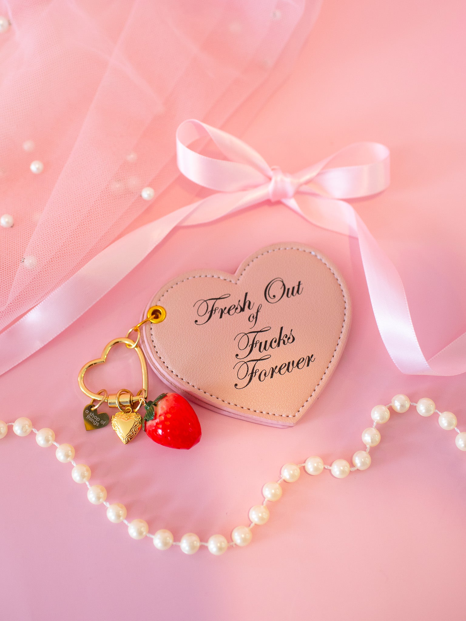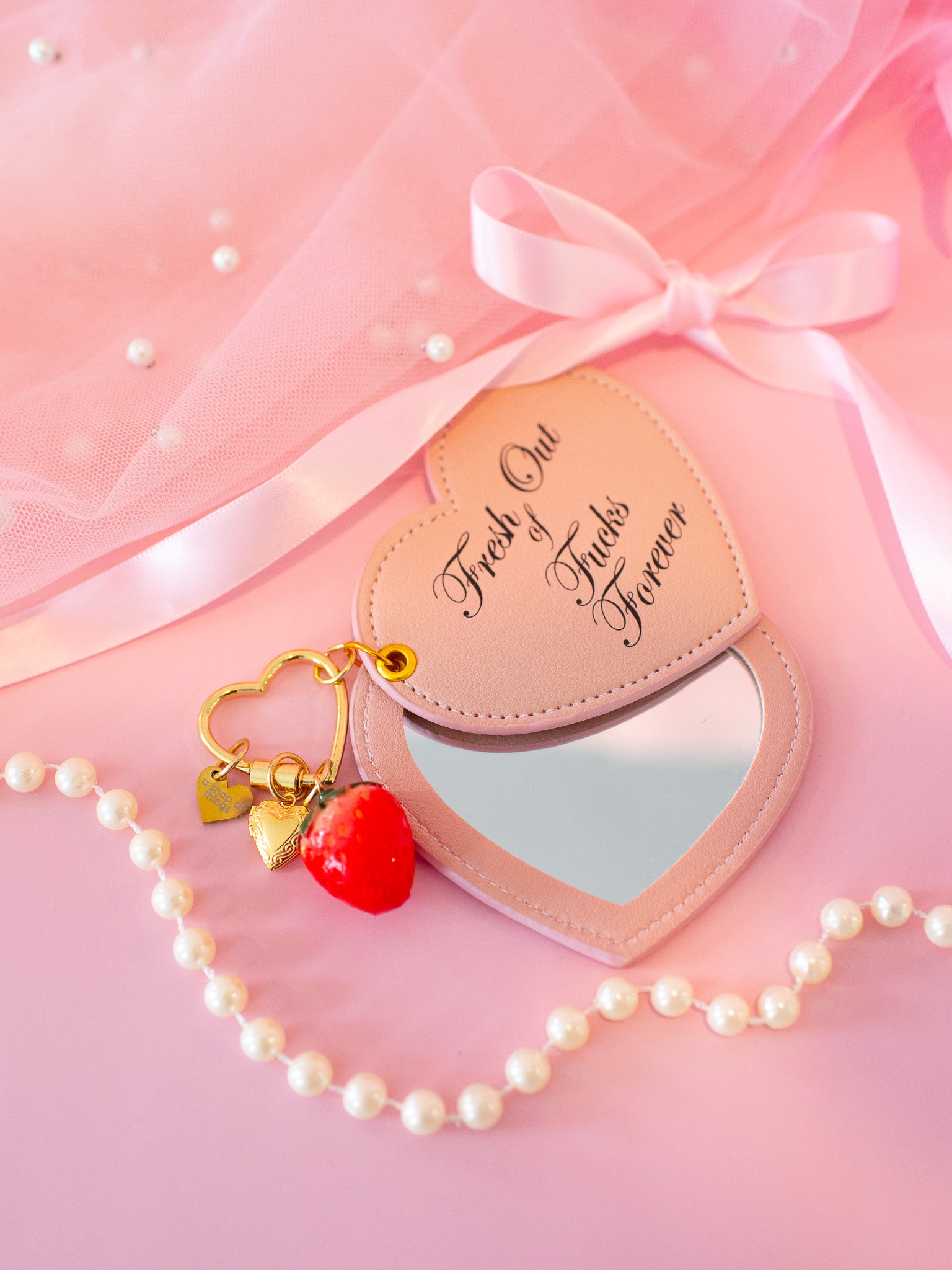 This heart-shaped compact mirror is on a key ring! Simply open the flap to reveal a little mirror. The carabiner on this keychain is a gold toned heart shape with a strawberry, functioning heart locket, and heart charm included! Mirror is made of leatherette.